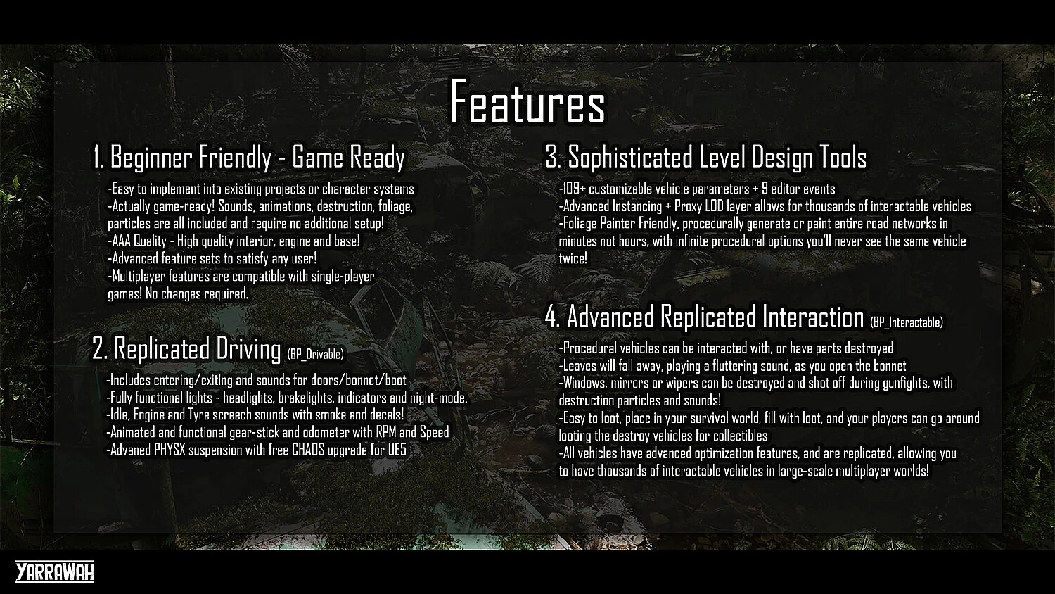 - Advanced Interactable Procedural Vehicle Blueprints that work with Foliage Actors for instanced, dynamic, destructible, and interactable vehicles.