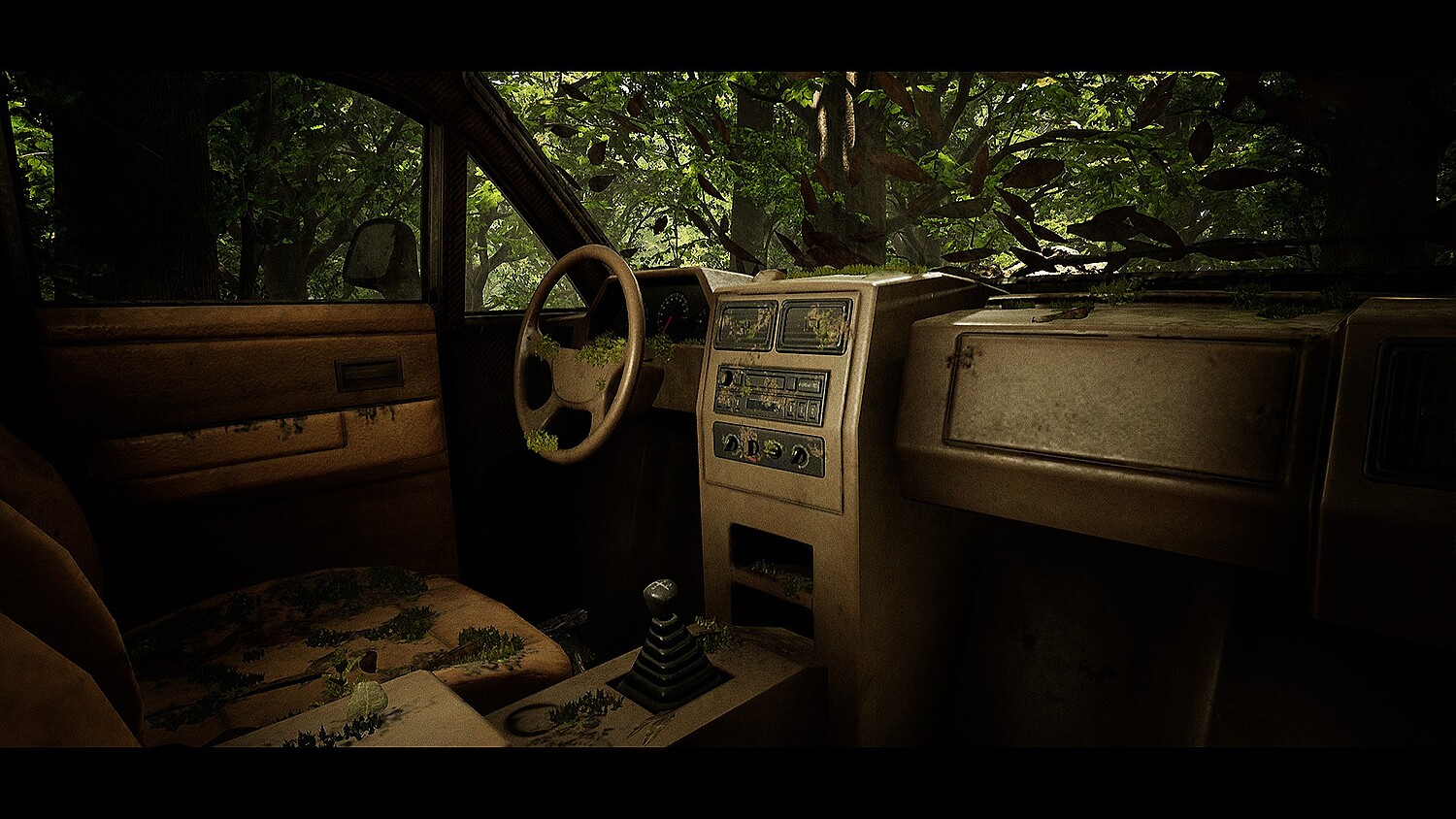 Mesh simulations are done outside of Unreal and imported allowing each vehicle to be uniquely cluttered with over 15 different leaf clutter variations and 7 cinematic quality mossy coverage variations.