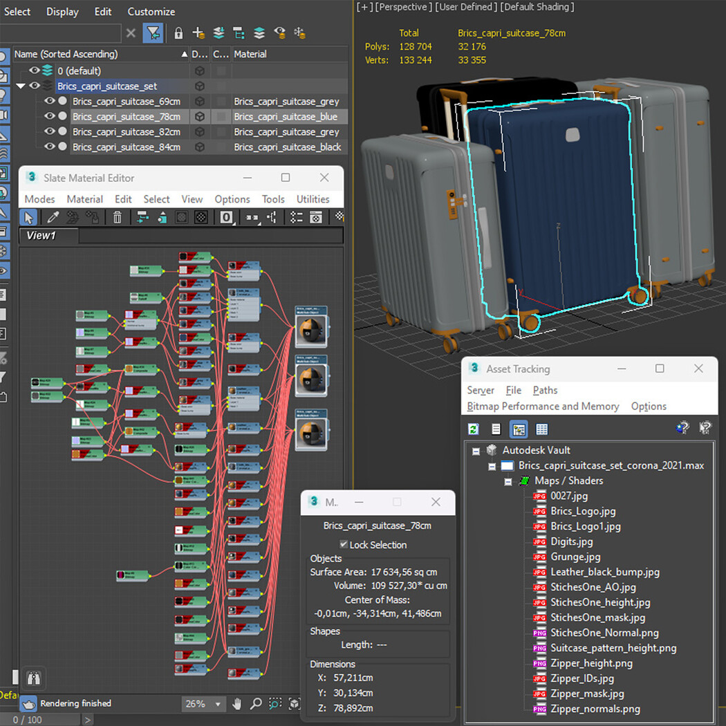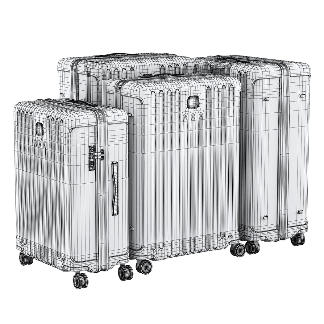The model is prepared for smoothing. Turbosmooth modifier has been assigned and switched to render mode.Mixed UVs. For ease of use, each suitcase is made as a single object with a multi-material.