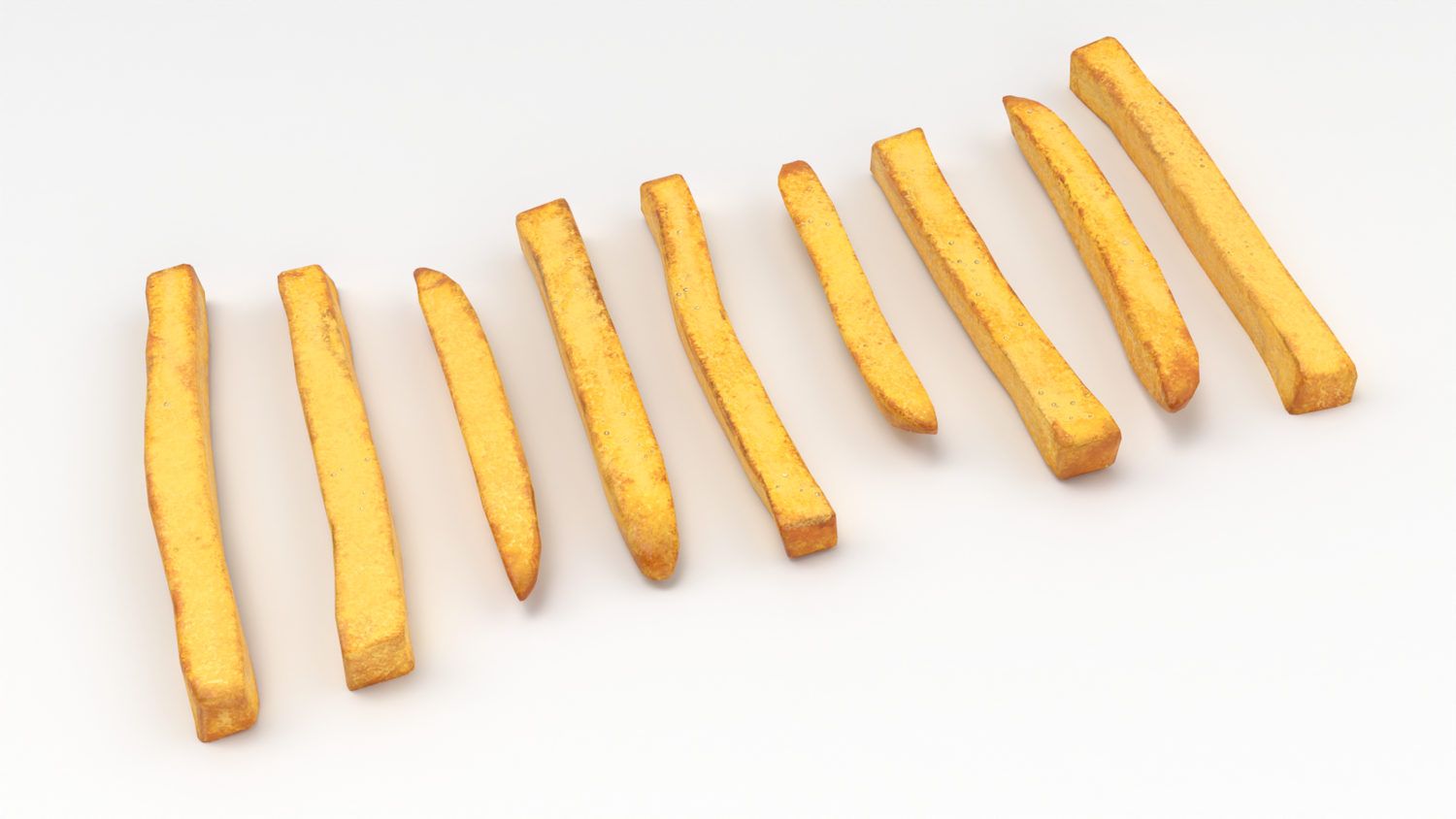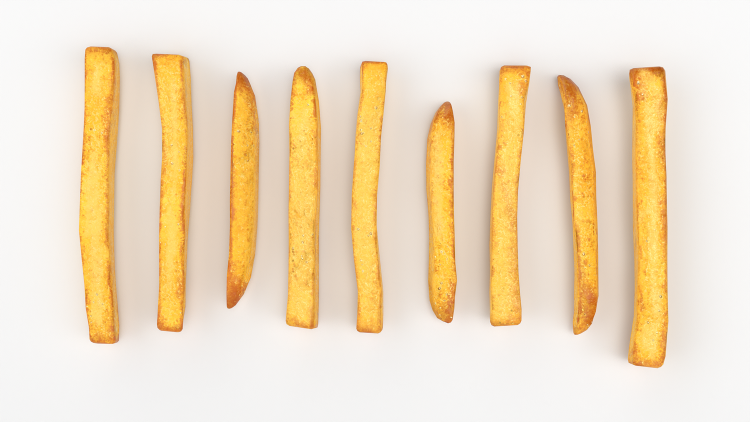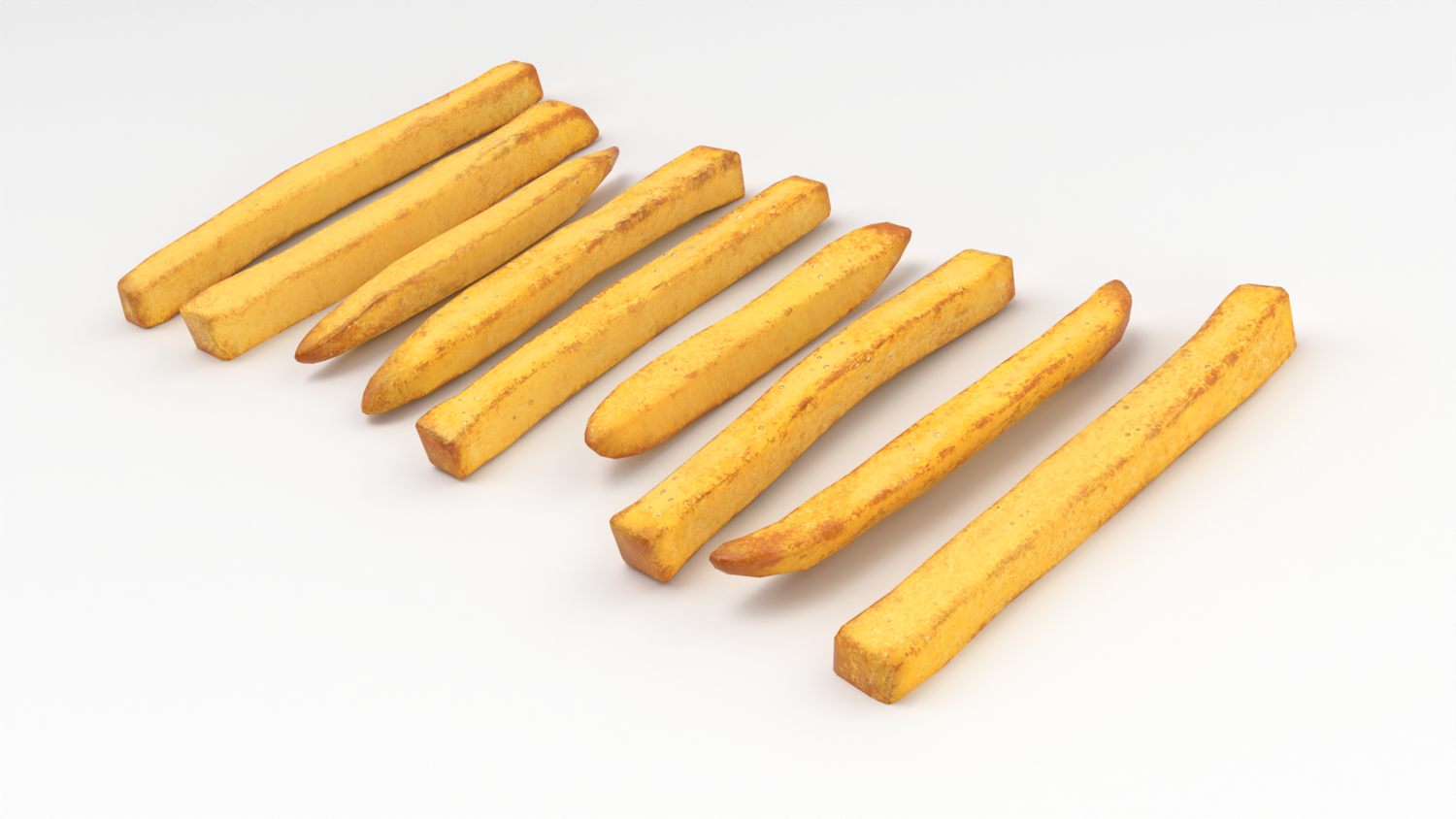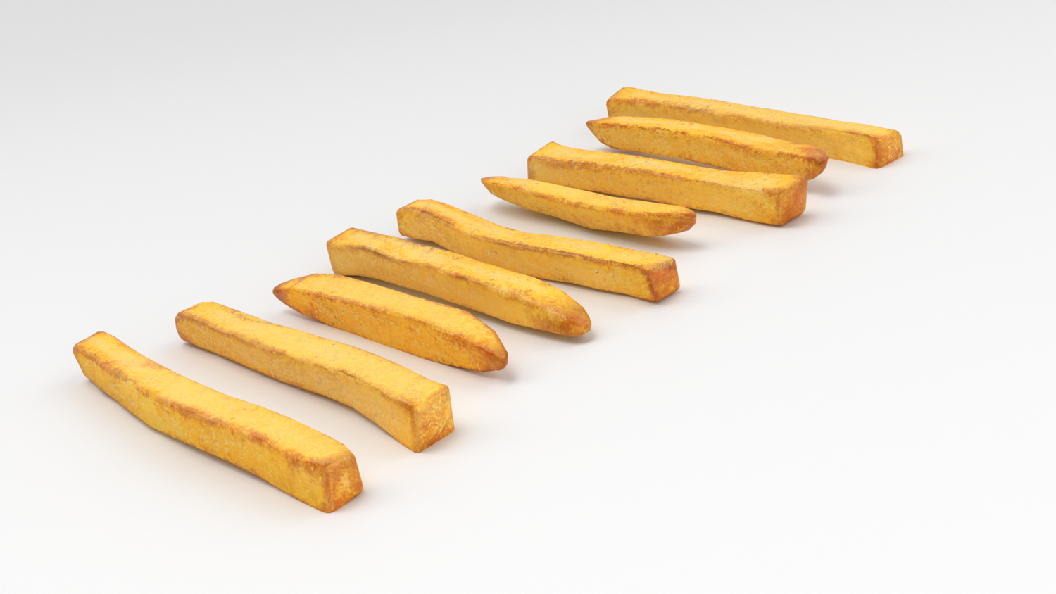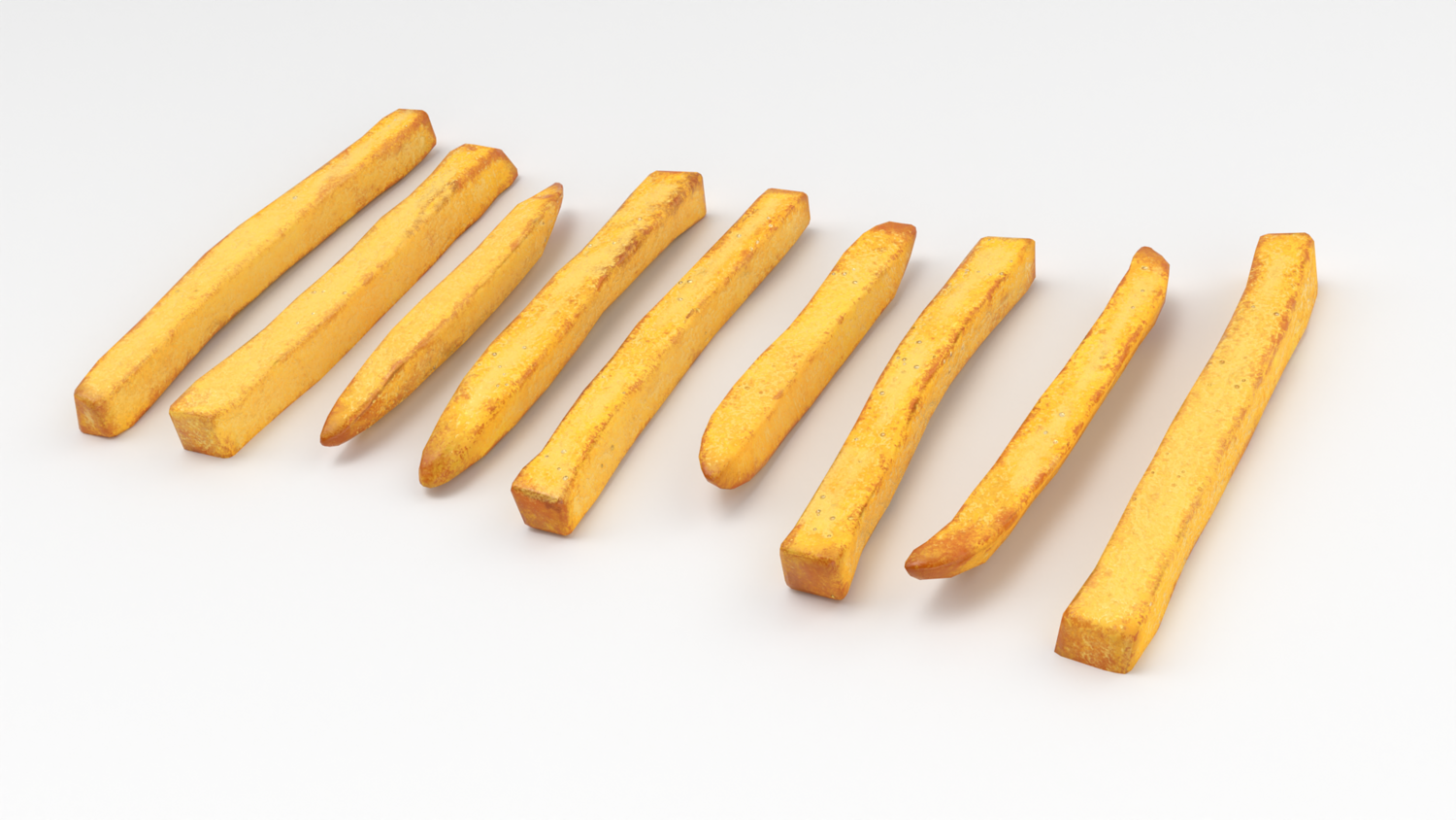 Realistic French fries 3D models created for games, real-time rendering, and cinematic scenes. This asset pack includes multiple variations of crispy potato fries, designed to look natural and slightly different in shape to avoid repetition in scenes.
