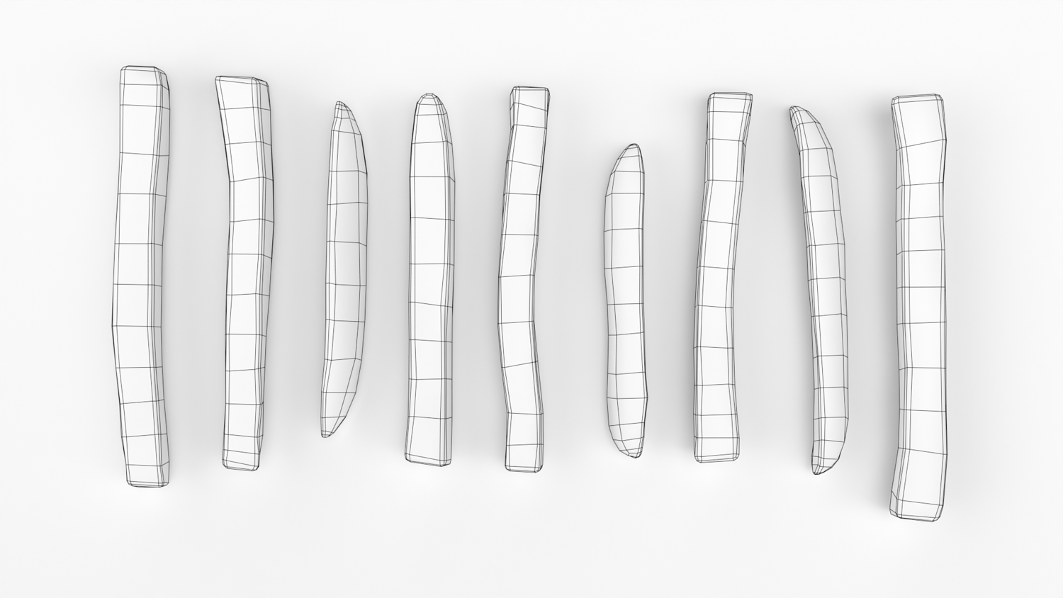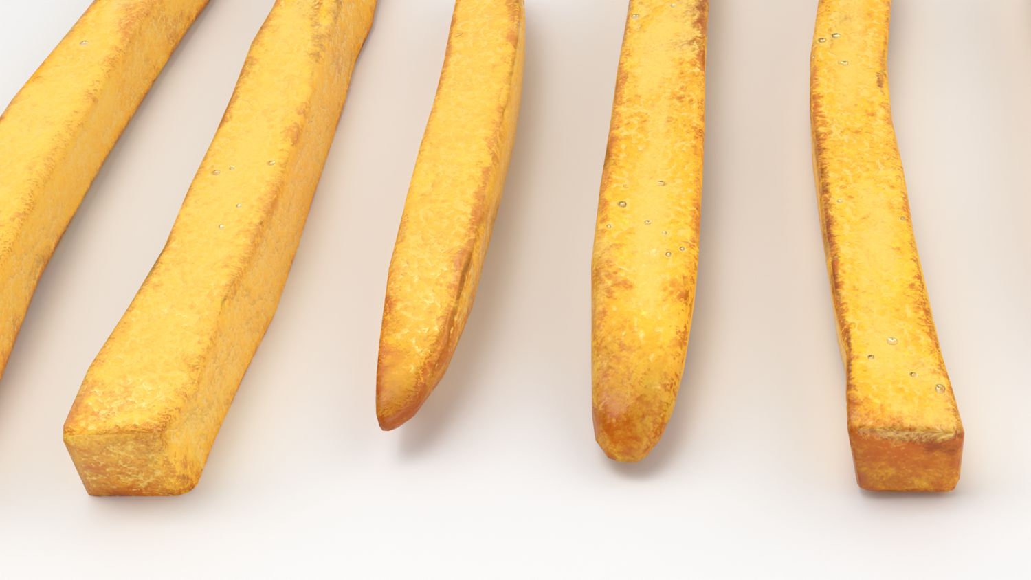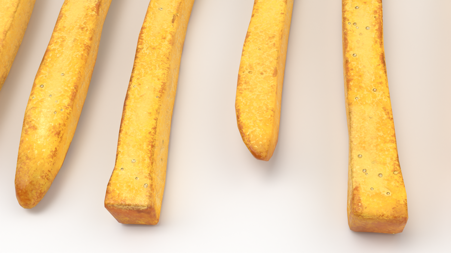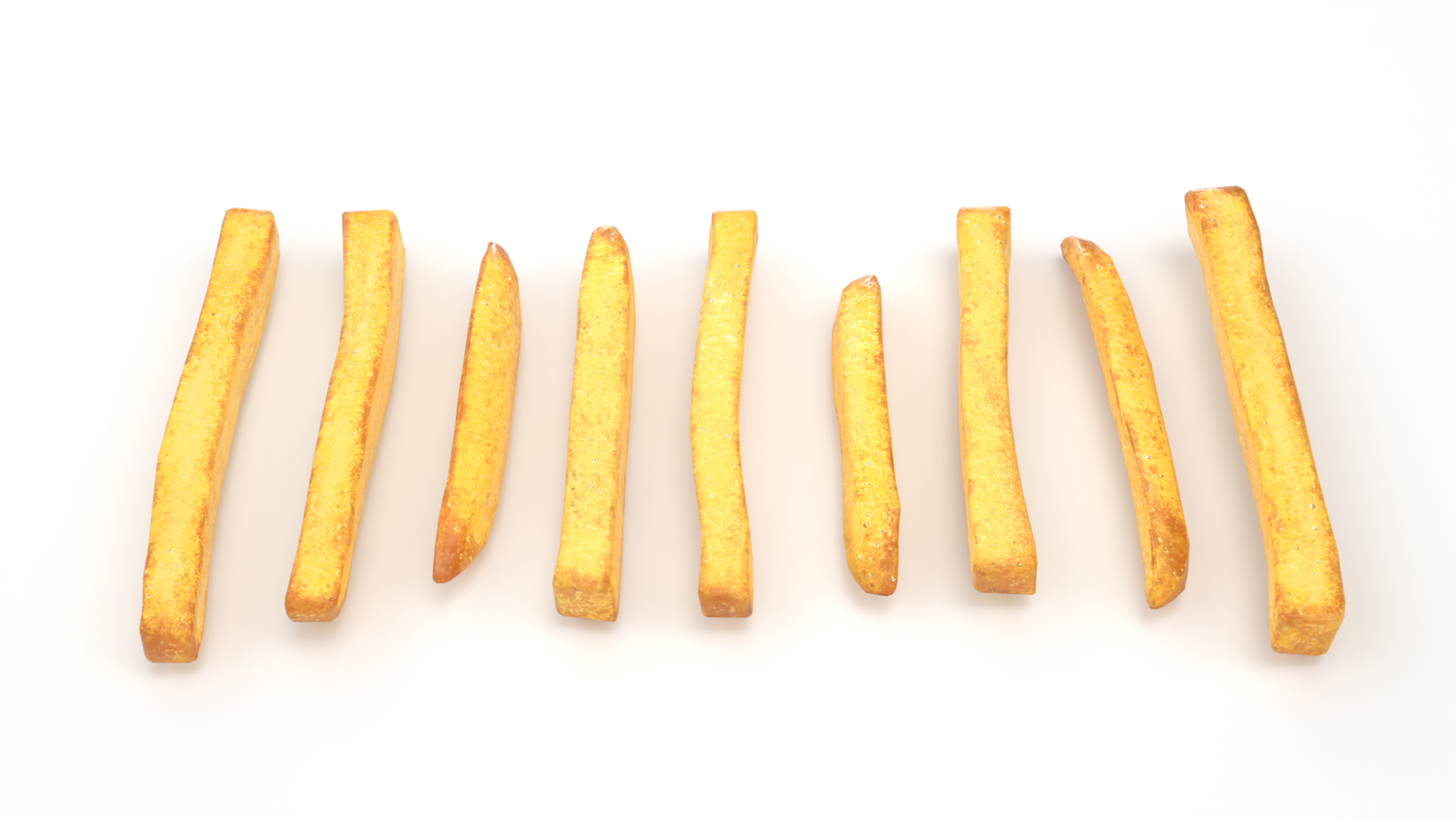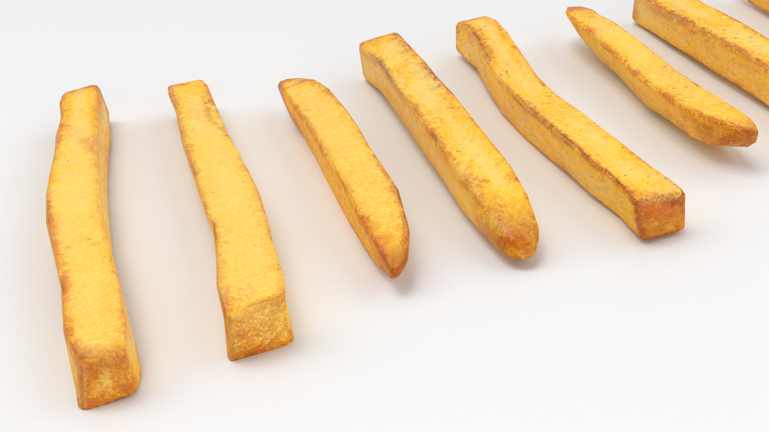 Realistic French fries 3D models created for games, real-time rendering, and cinematic scenes. This asset pack includes multiple variations of crispy potato fries, designed to look natural and slightly different in shape to avoid repetition in scenes.