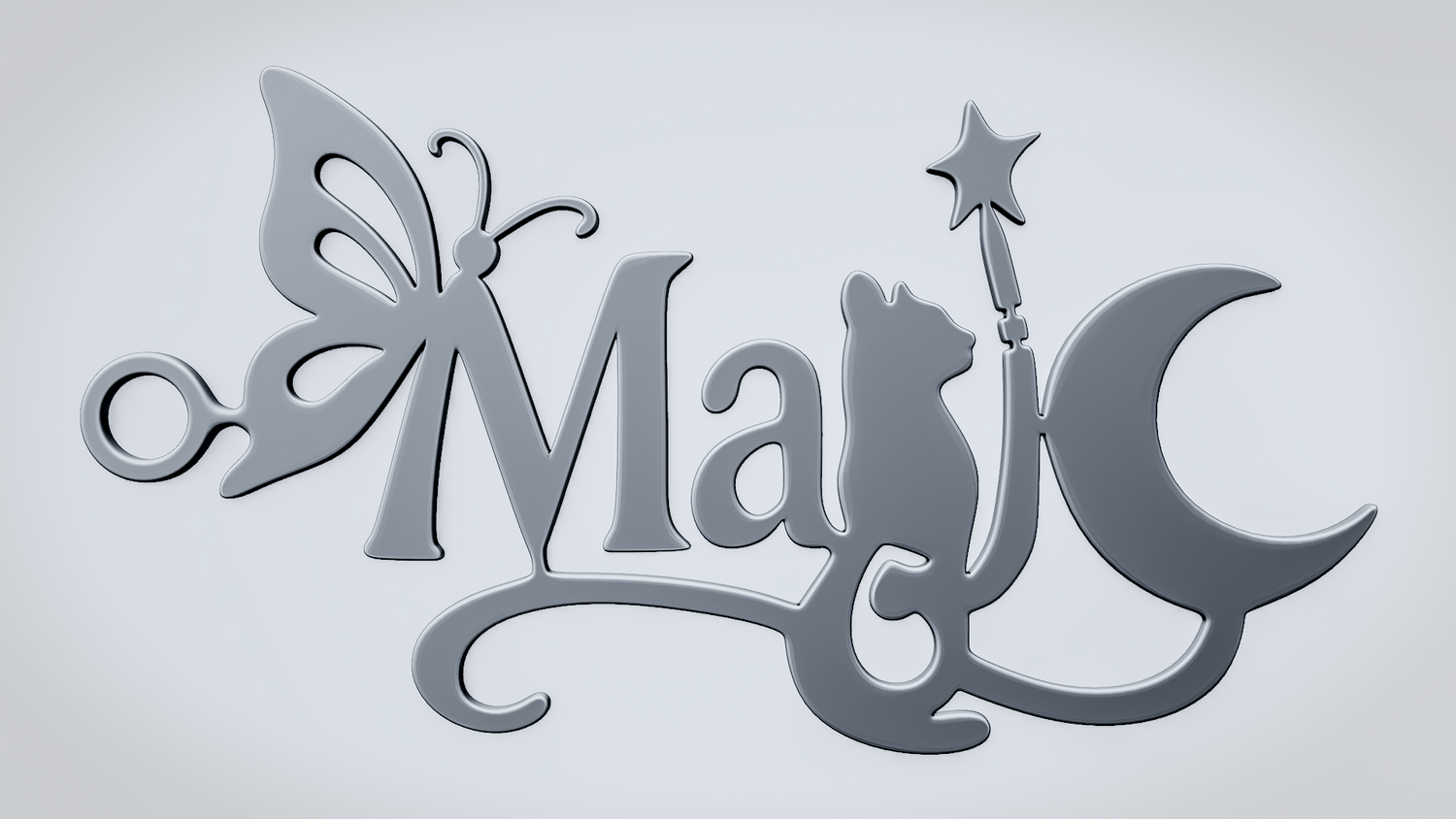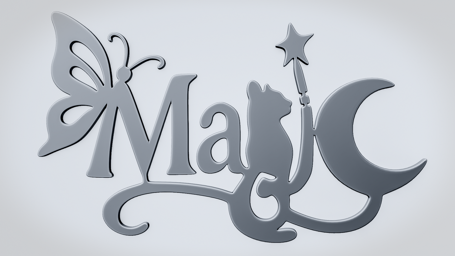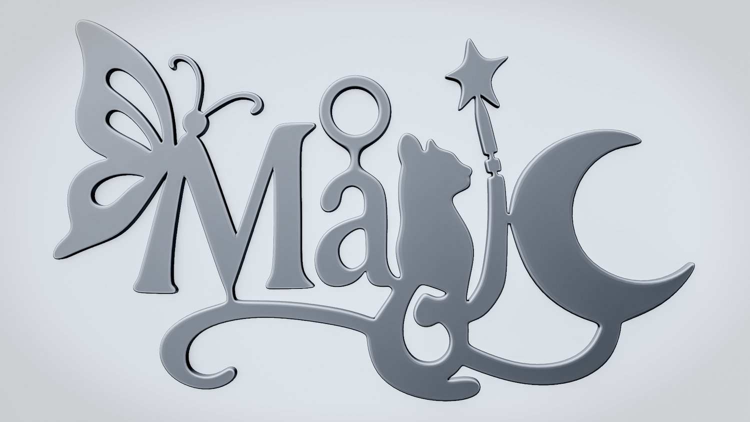A solid 3D printable design featuring the word MAGIC in a flowing decorative style, combined with a butterfly, cat silhouette, crescent moon, and star wand details that create a playful mystical theme. The overall shape feels whimsical, expressive, and visually balanced while keeping the word readable and the model sturdy.