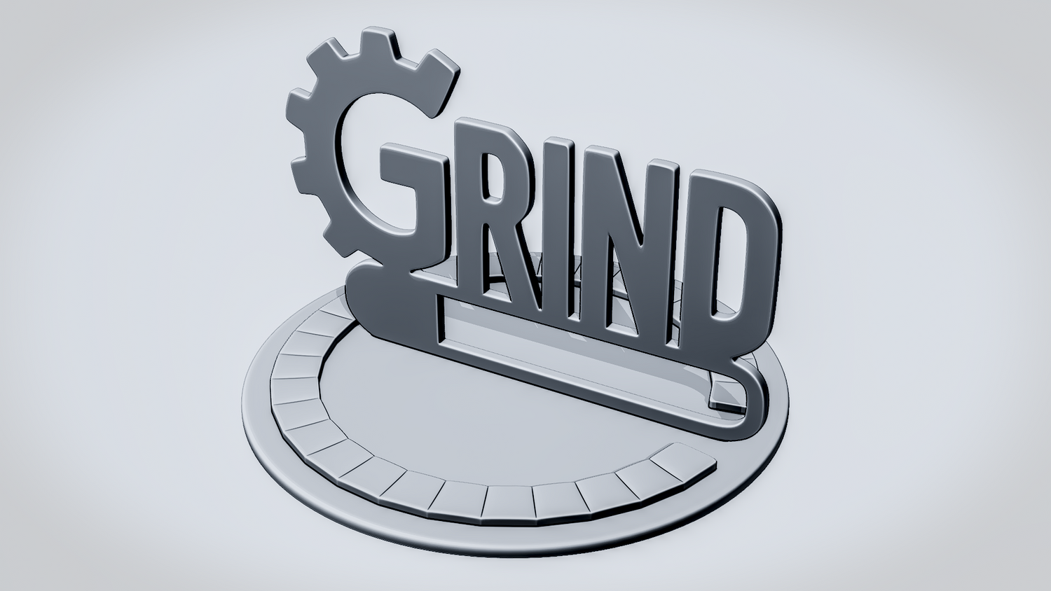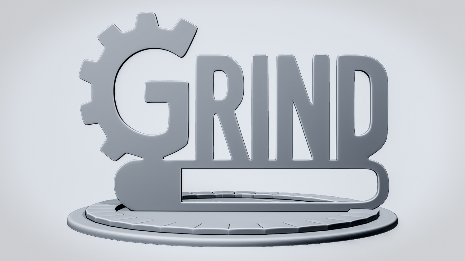 Statue Version: The statue version presents GRIND as a freestanding display piece on a round decorative base with segmented ring details that complement the gear-inspired theme. It keeps the lettering, gear element, and grounded silhouette clearly visible while giving the model a polished, display-ready presence for desks, shelves, or workspaces.
