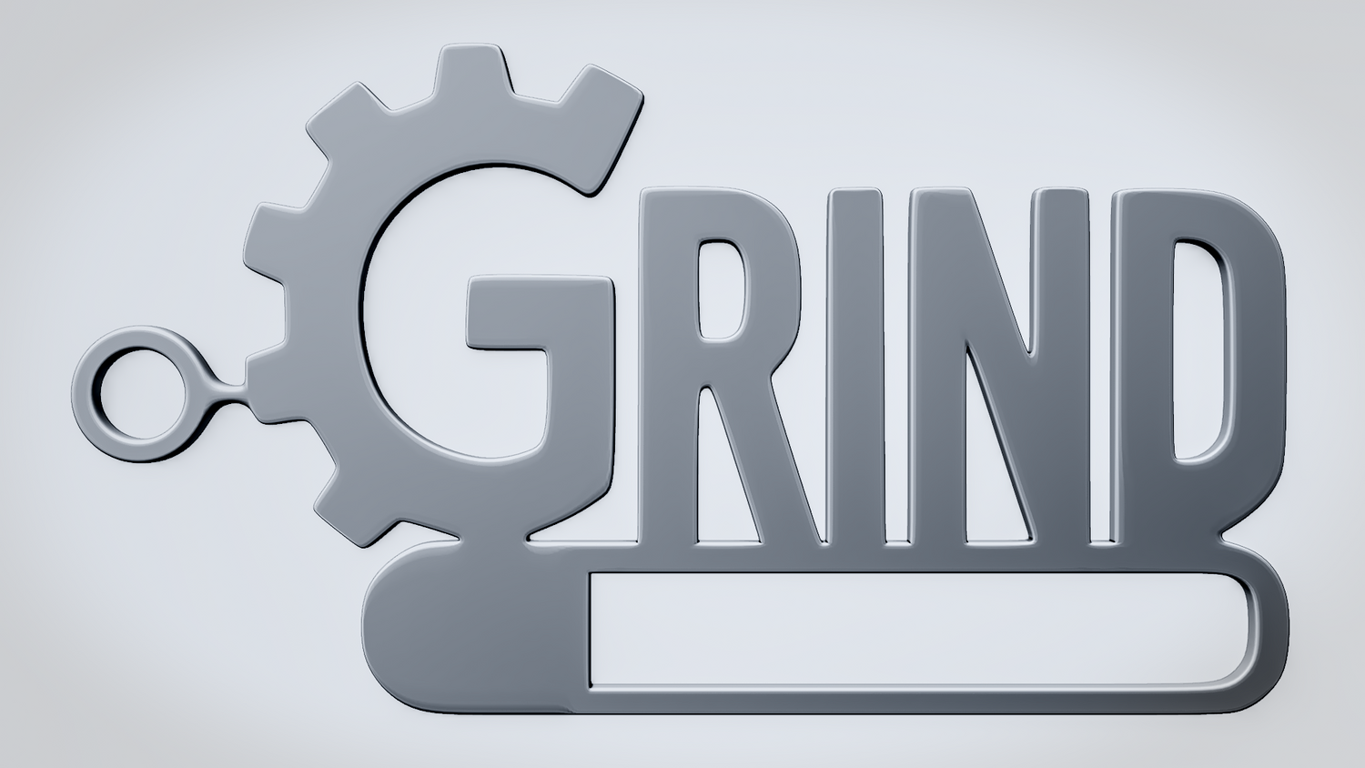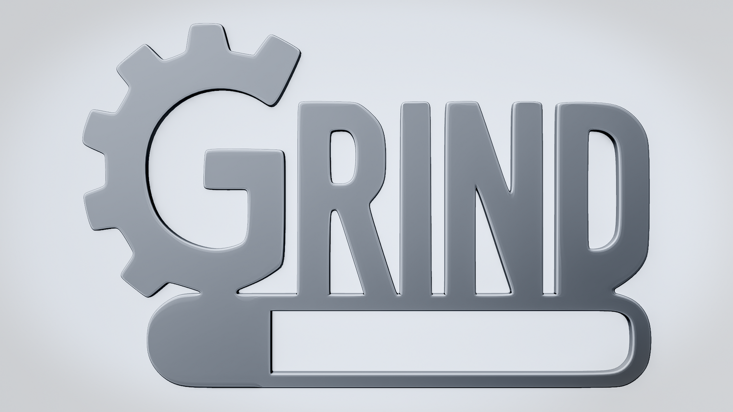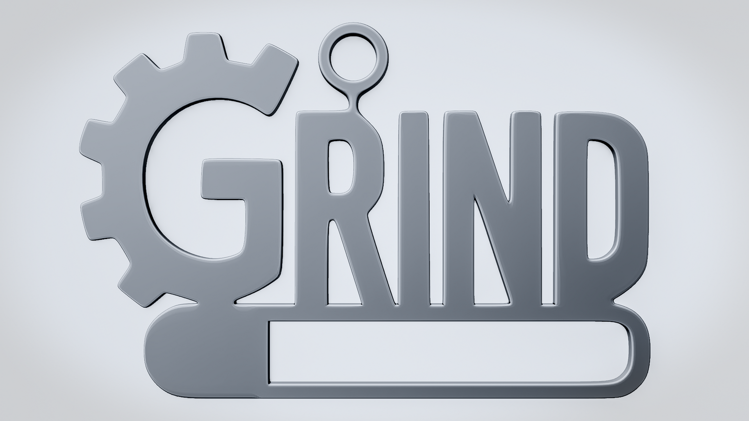 A solid 3D printable design featuring the word GRIND in a bold industrial style, with a gear shape integrated into the first letter and a strong base bar anchoring the composition. The overall shape feels mechanical, driven, and visually balanced while keeping the word readable and the model sturdy.