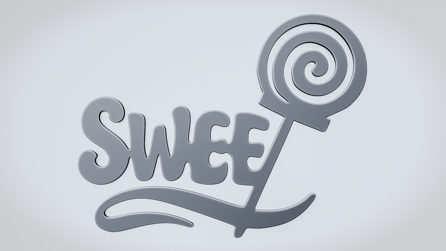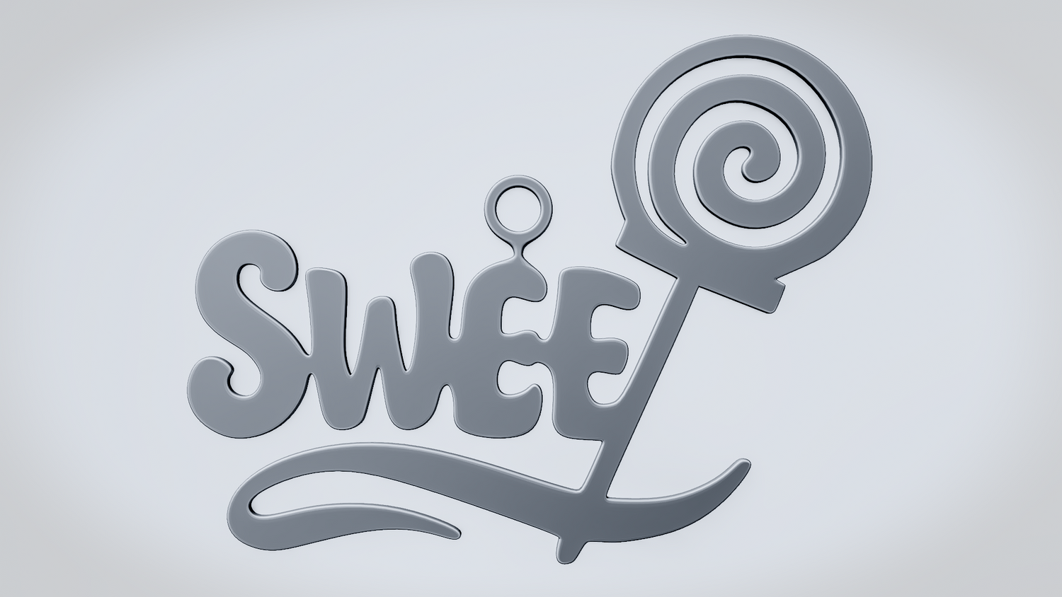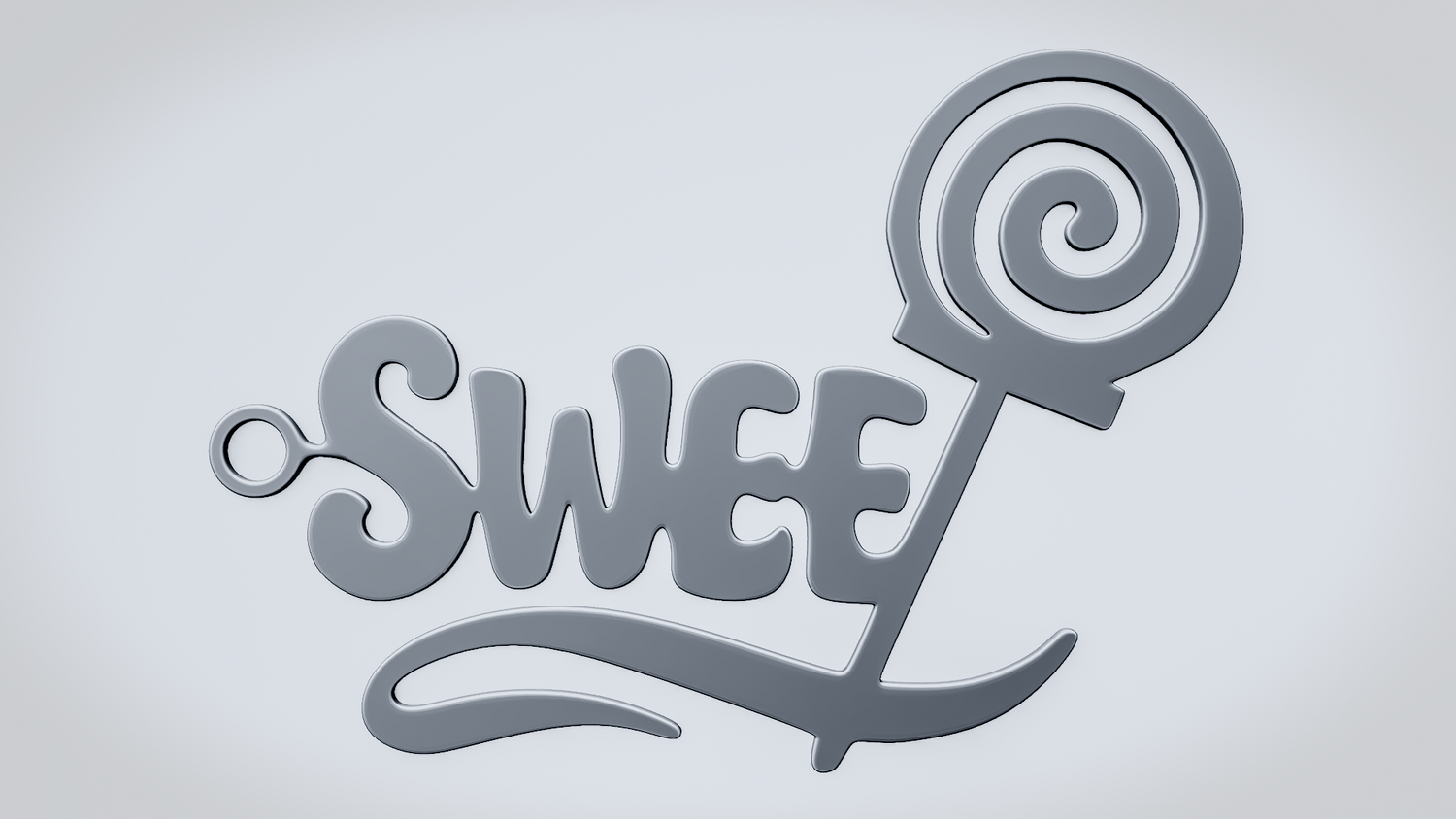 A solid 3D printable design featuring the word SWEET in a playful rounded style, with a swirled lollipop integrated into the composition to emphasize a fun candy theme. The overall shape feels cheerful, cute, and visually balanced while keeping the word readable and the model sturdy.