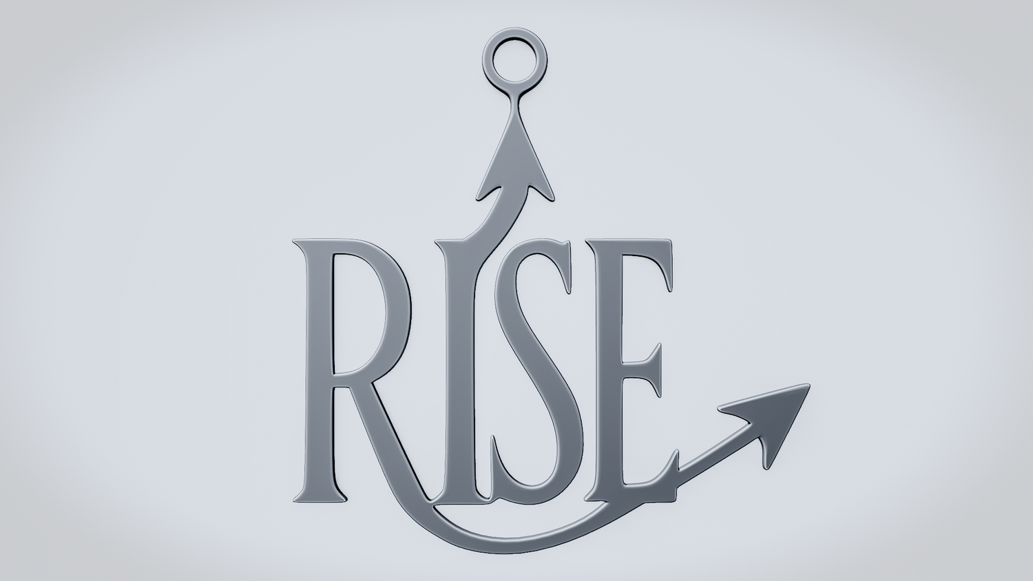A solid 3D printable design featuring the word RISE in a flowing script style, with ascending strokes and upward momentum that embody growth, progress, and elevation. The overall shape feels smooth, clean, and visually balanced while keeping the word readable and the model sturdy.