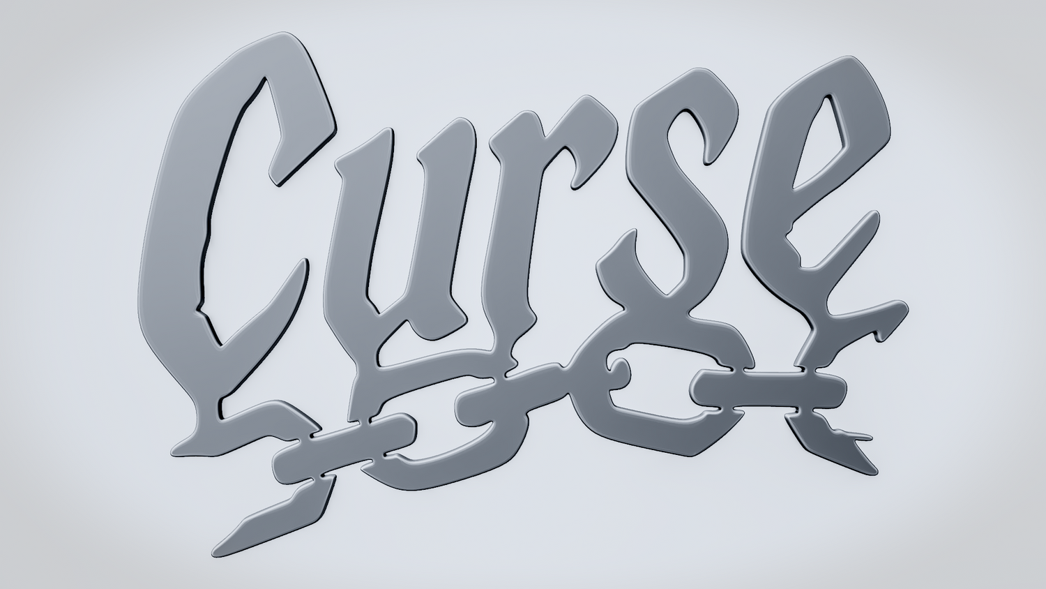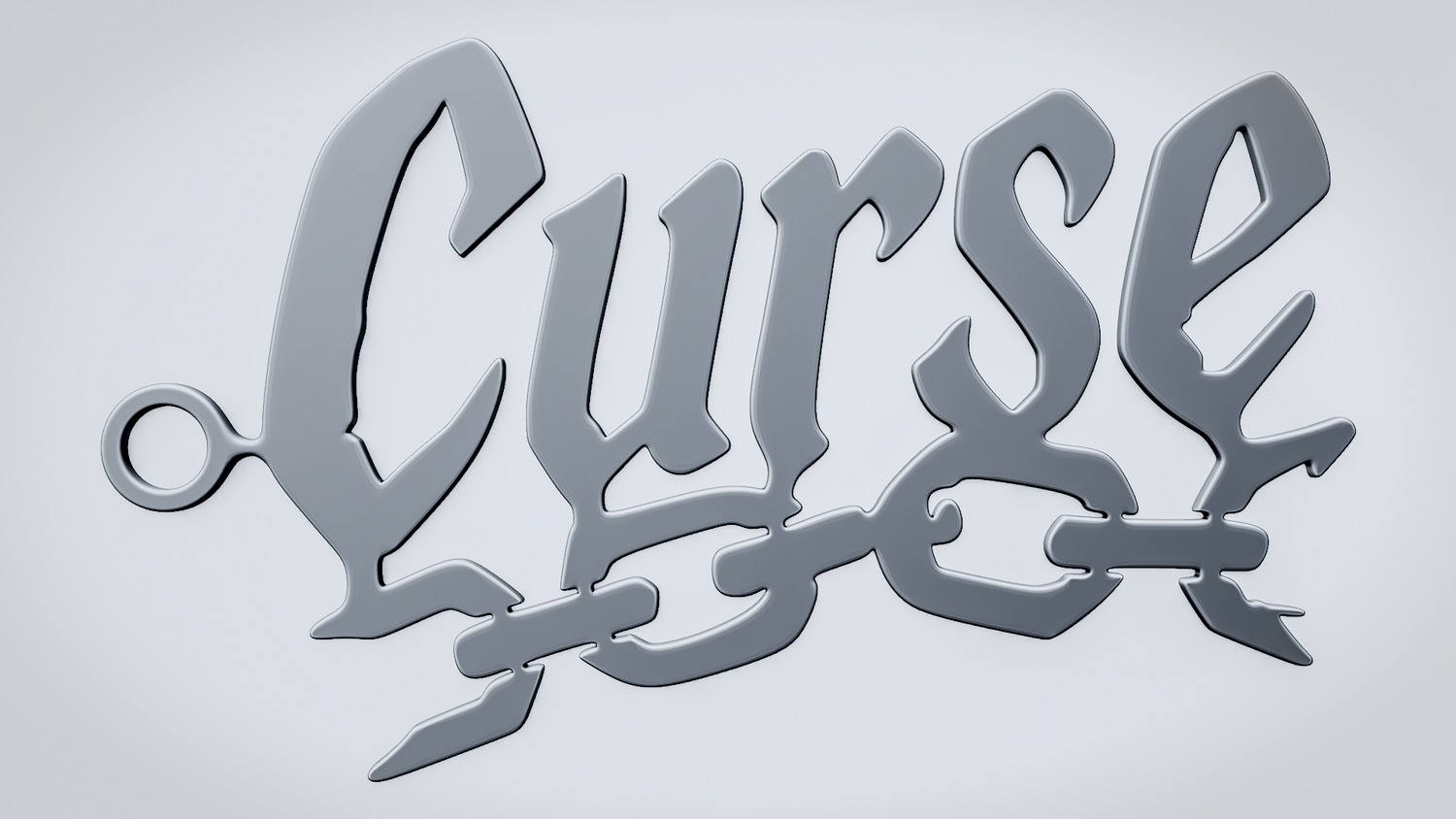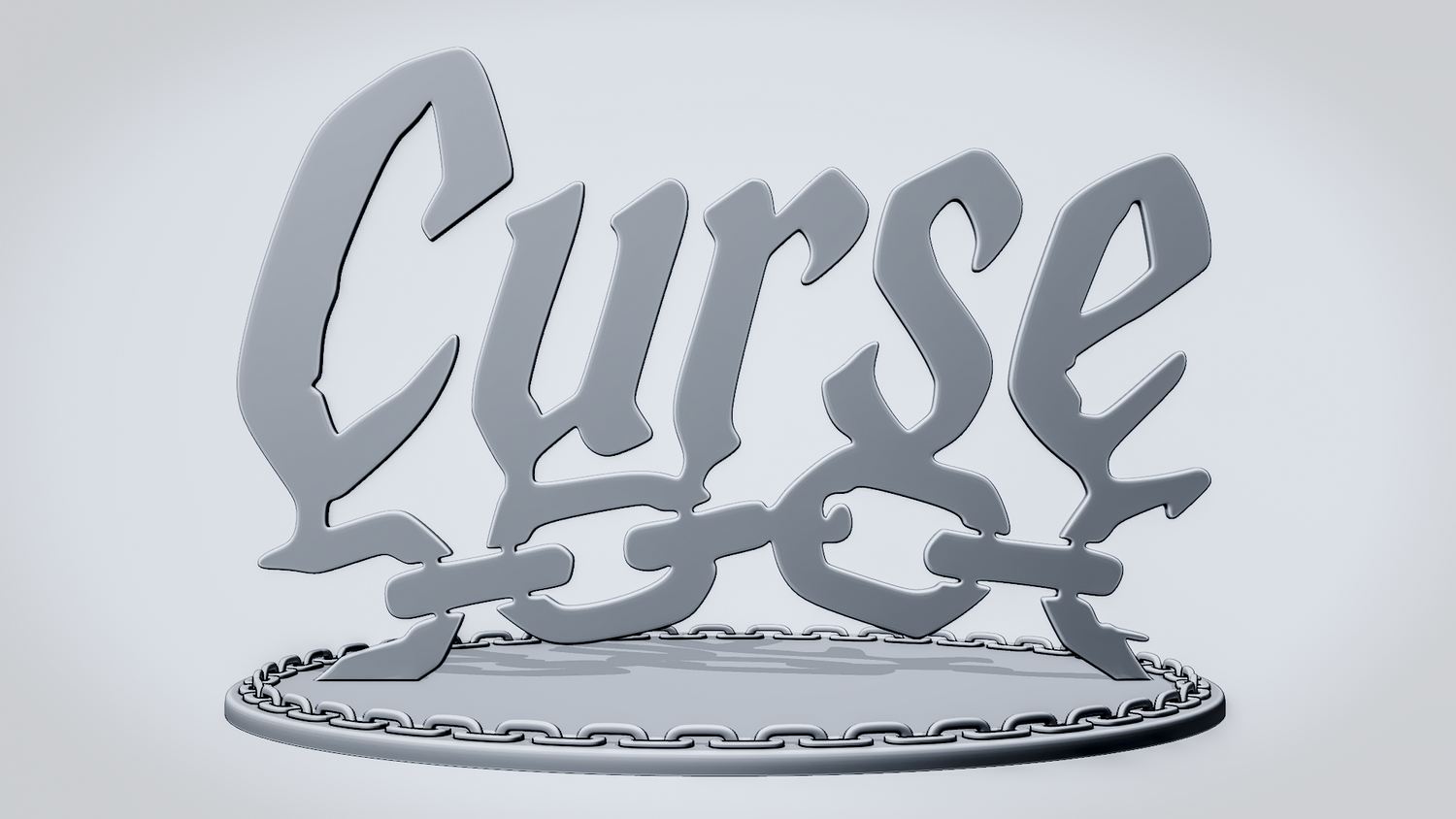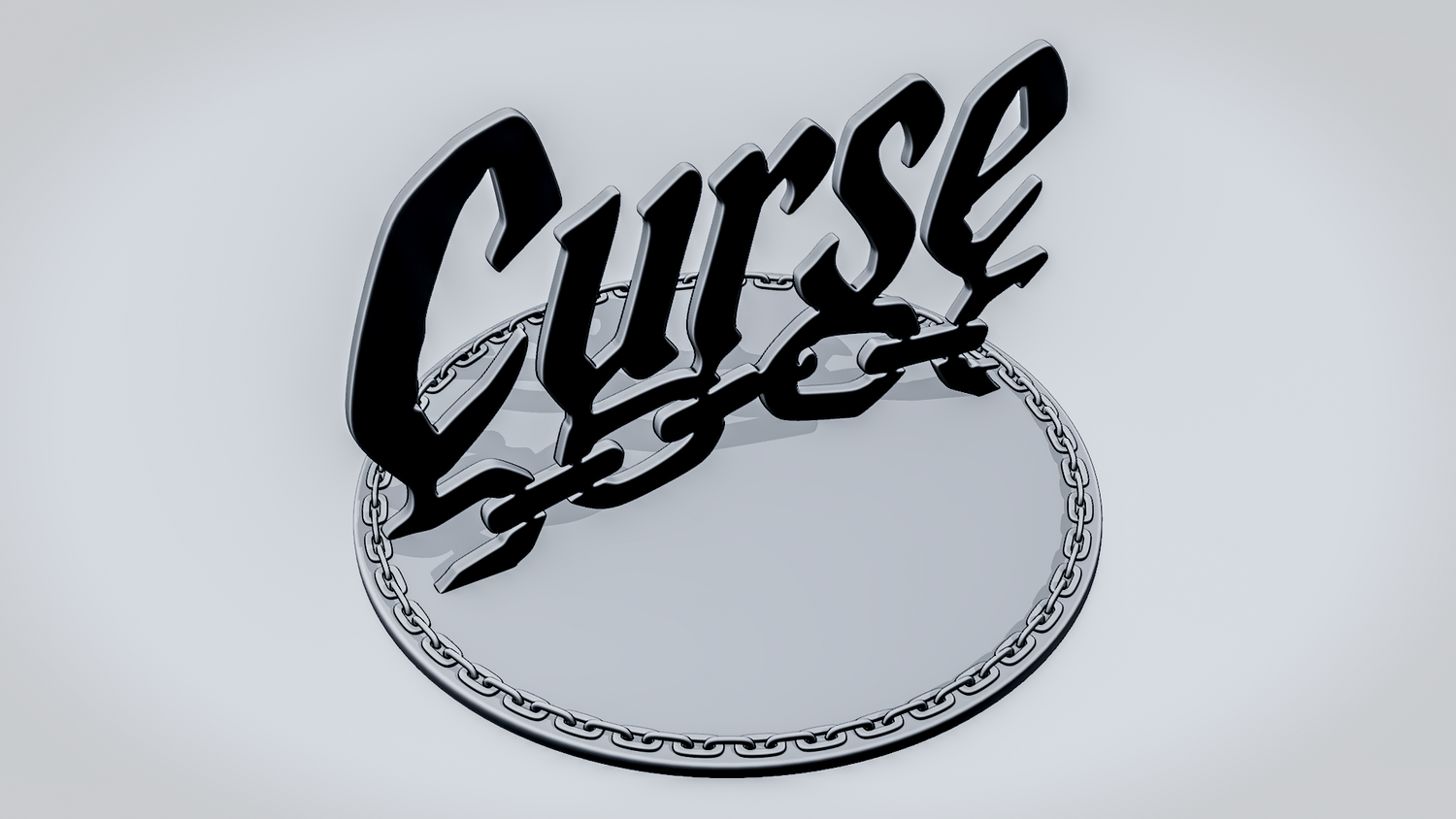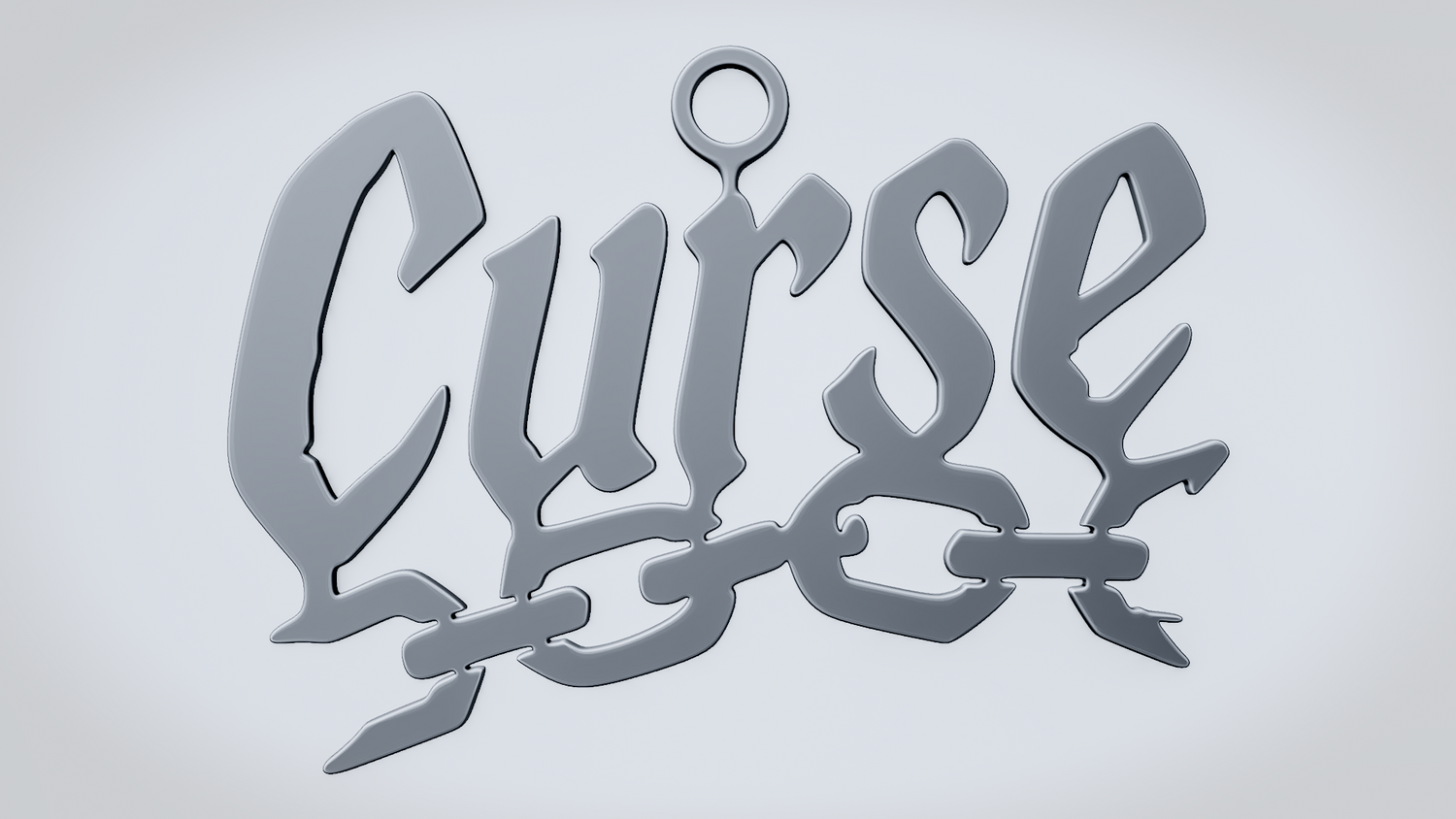 A solid 3D printable design featuring the word CURSE in a bold, stylized form, with a broken chain running through the lettering to reinforce the dark, restrained theme. The overall shape is sharp, readable, and visually striking, making it suitable both as an accessory piece and as a decorative printed model.