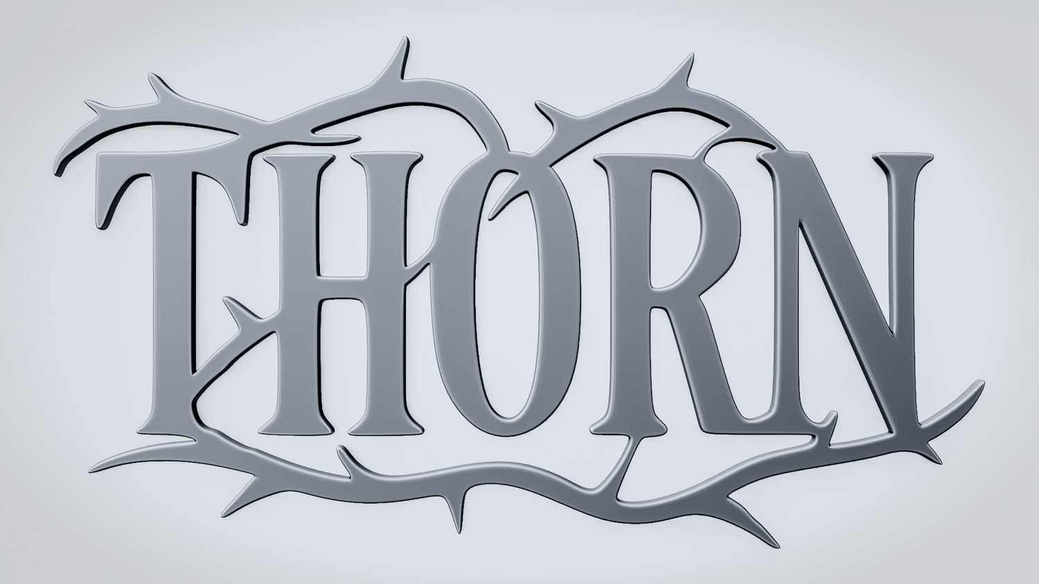 A solid 3D printable design featuring the word THORN in a bold serif style, surrounded and crossed by sharp thorn-like vine details that reinforce its dark, natural theme. The overall shape is sturdy, readable, and visually striking, giving the model a strong edge while keeping the design clean and balanced.