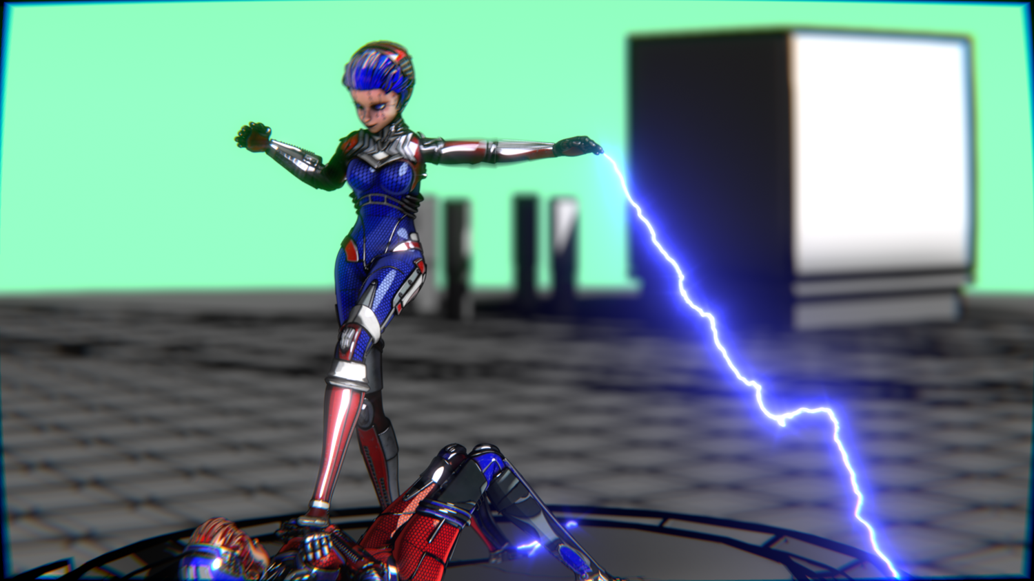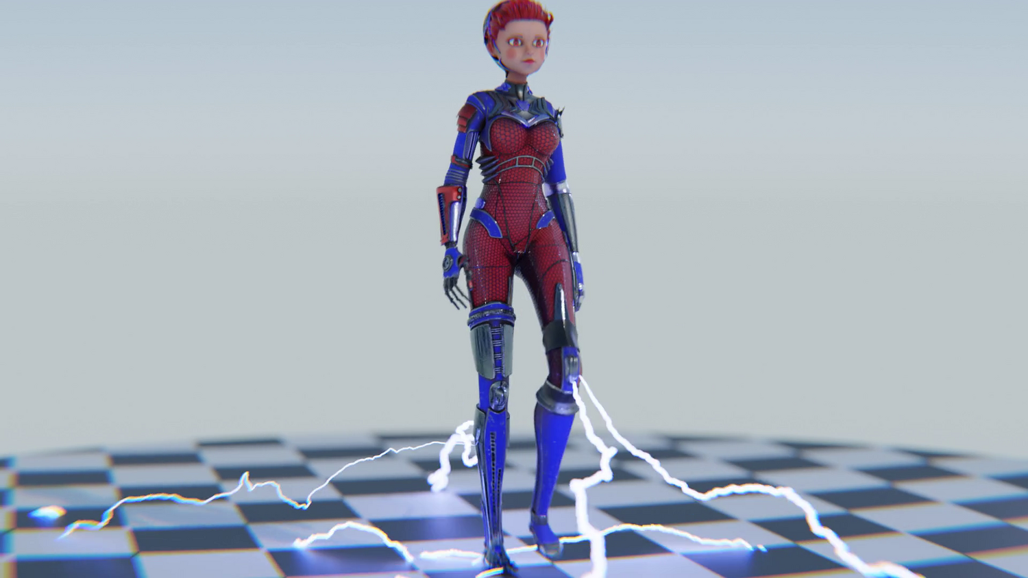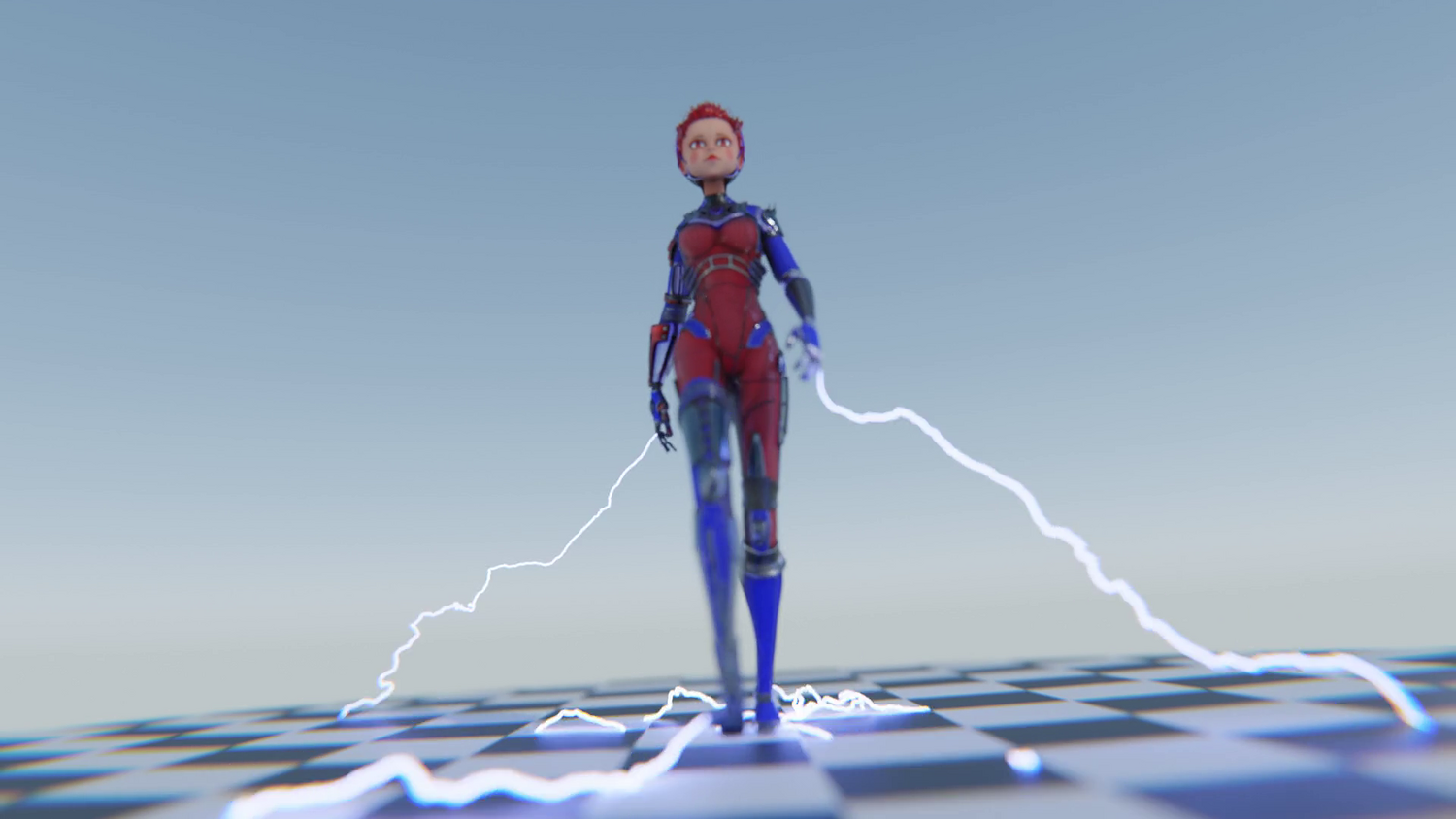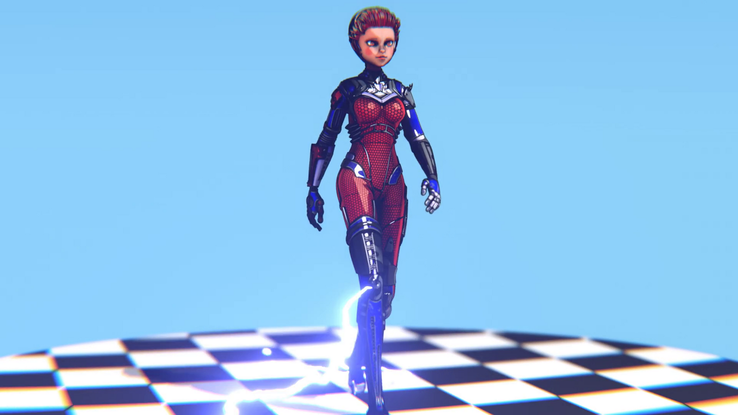 Blue & red segmented suit with metallic accents Cyber-circuit face markings Vivid blue hair & glowing eyes High-tech aesthetic