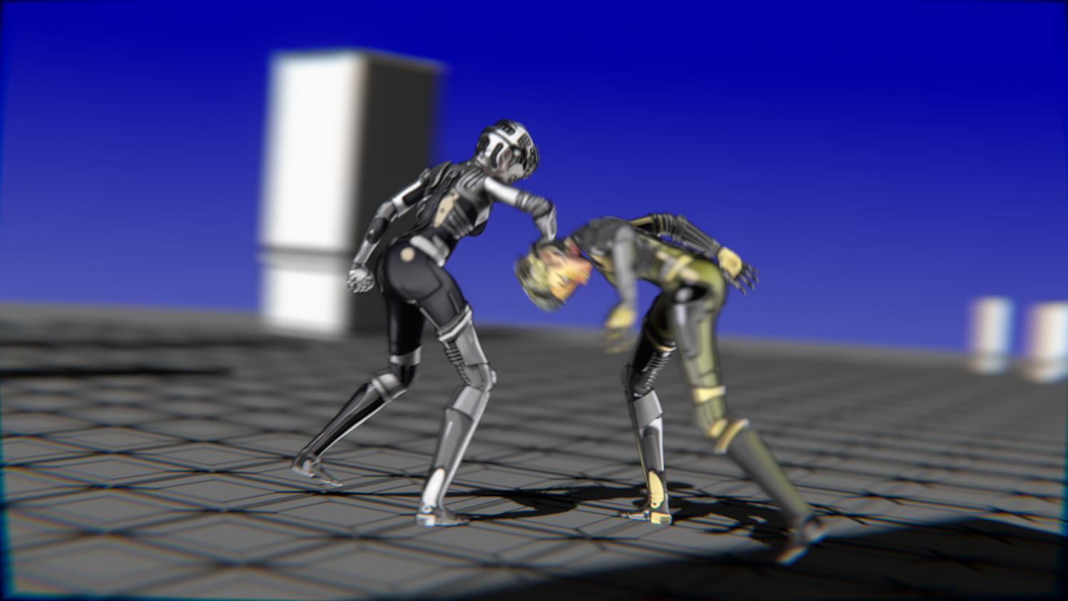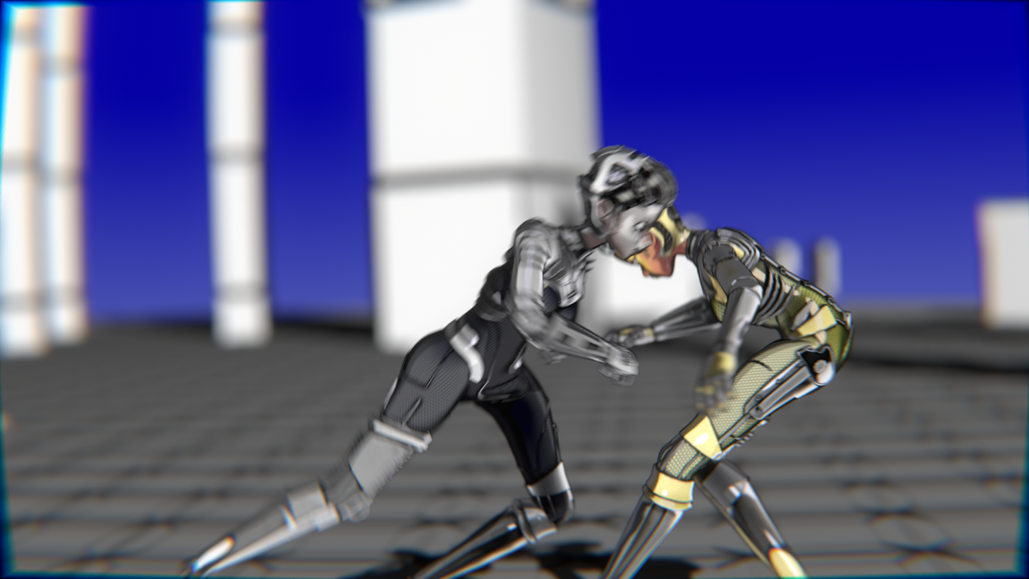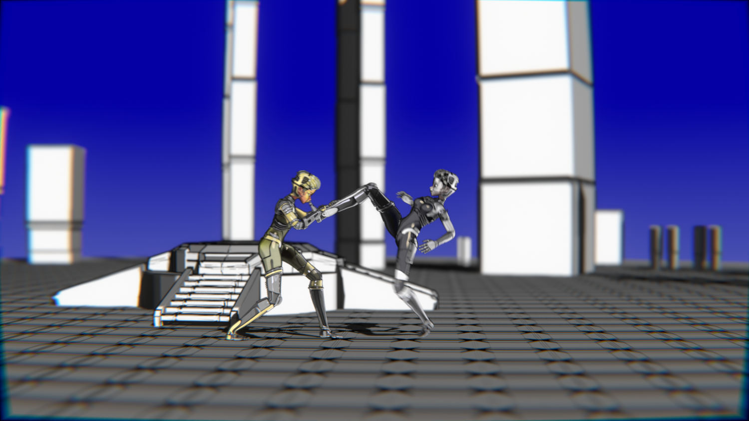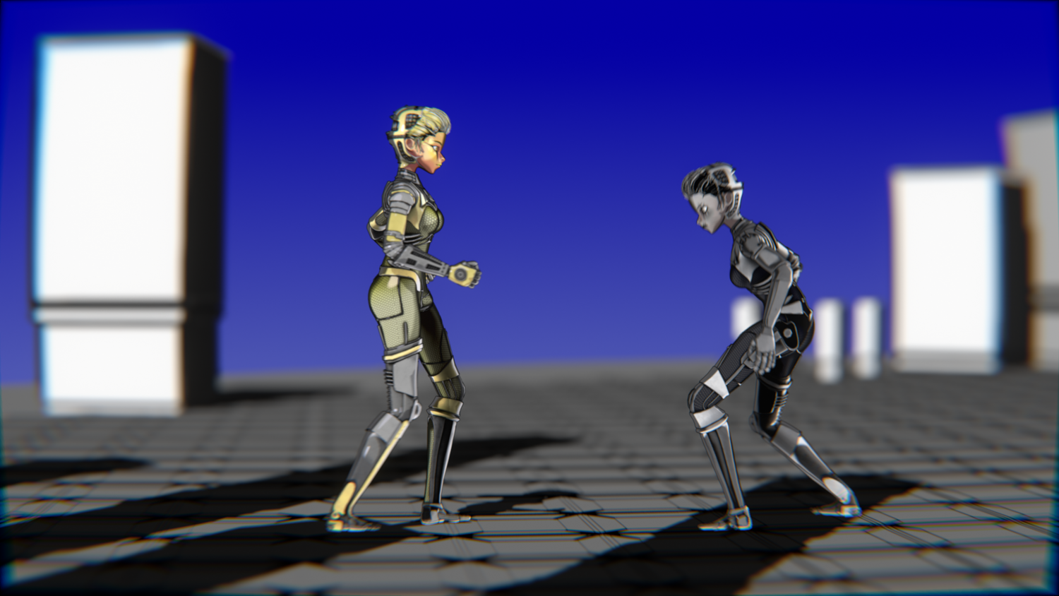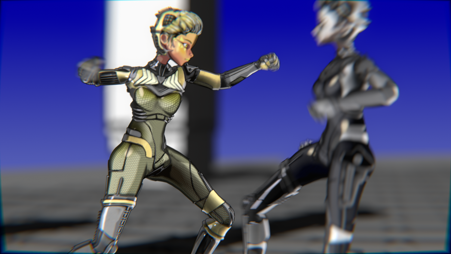A stylized cyberpunk-inspired combat pack featuring two asymmetric robotic girls (Gold & Gothic variants) with high-tech designs, multiple shader options, and fully rigged combat animations. Perfect for games, cinematics, and stylized renders.