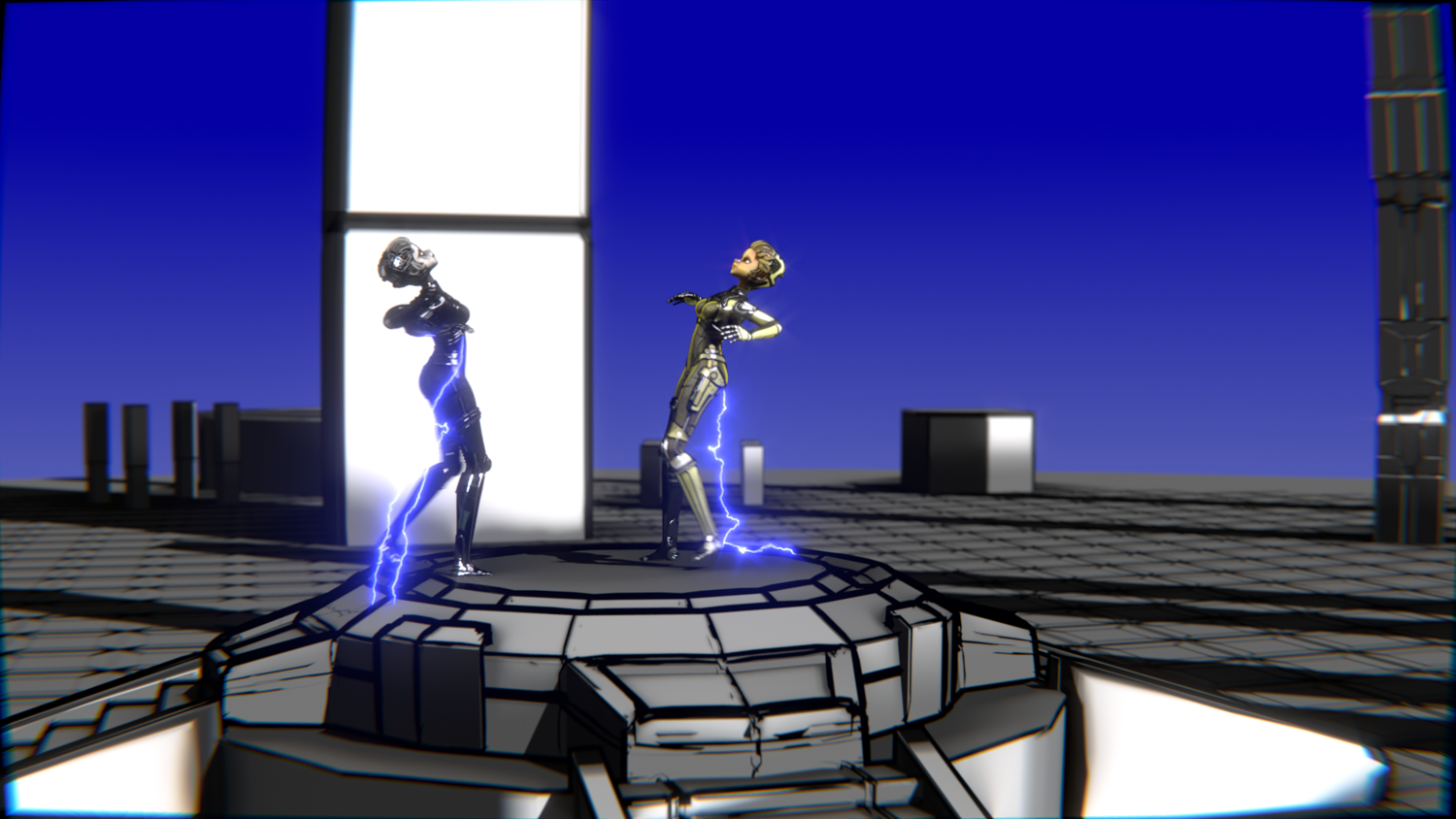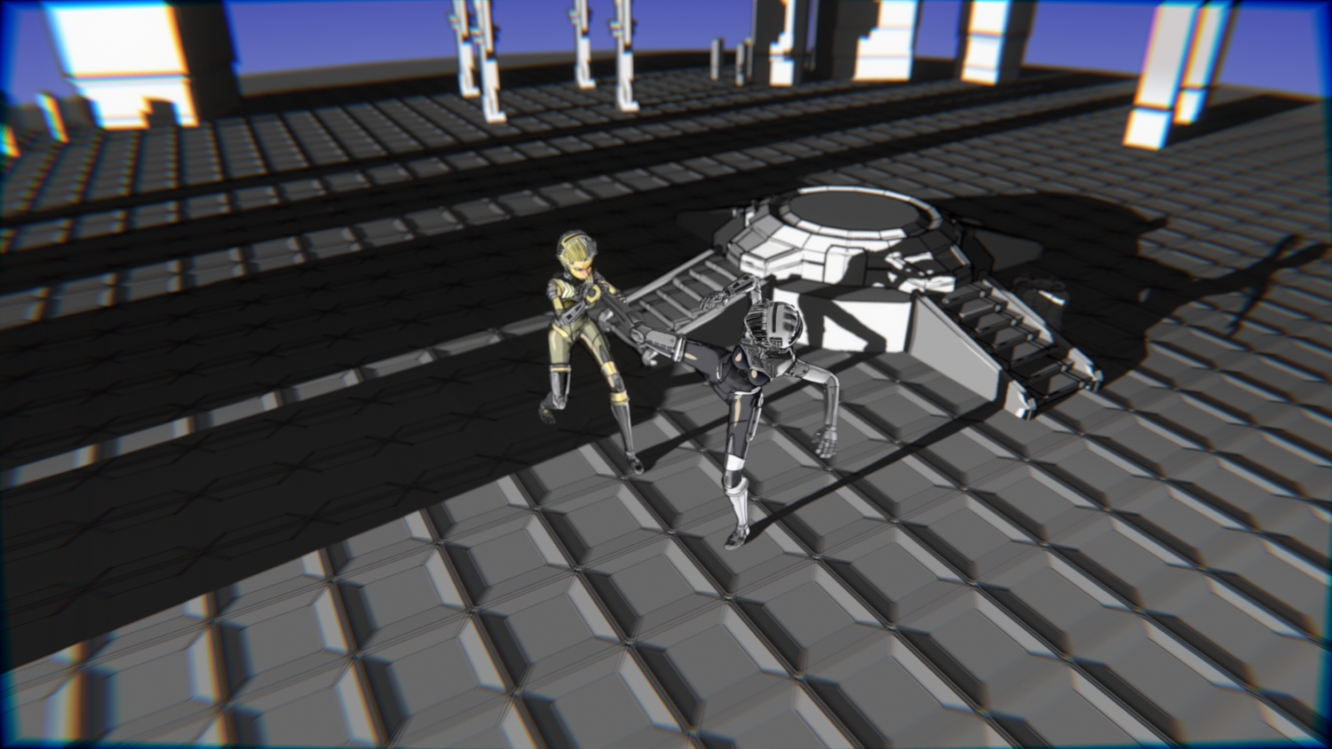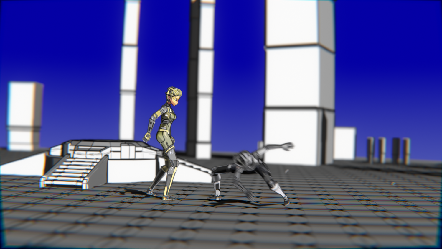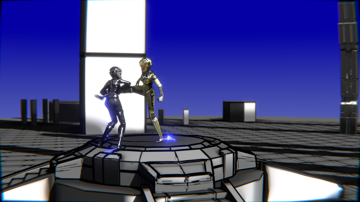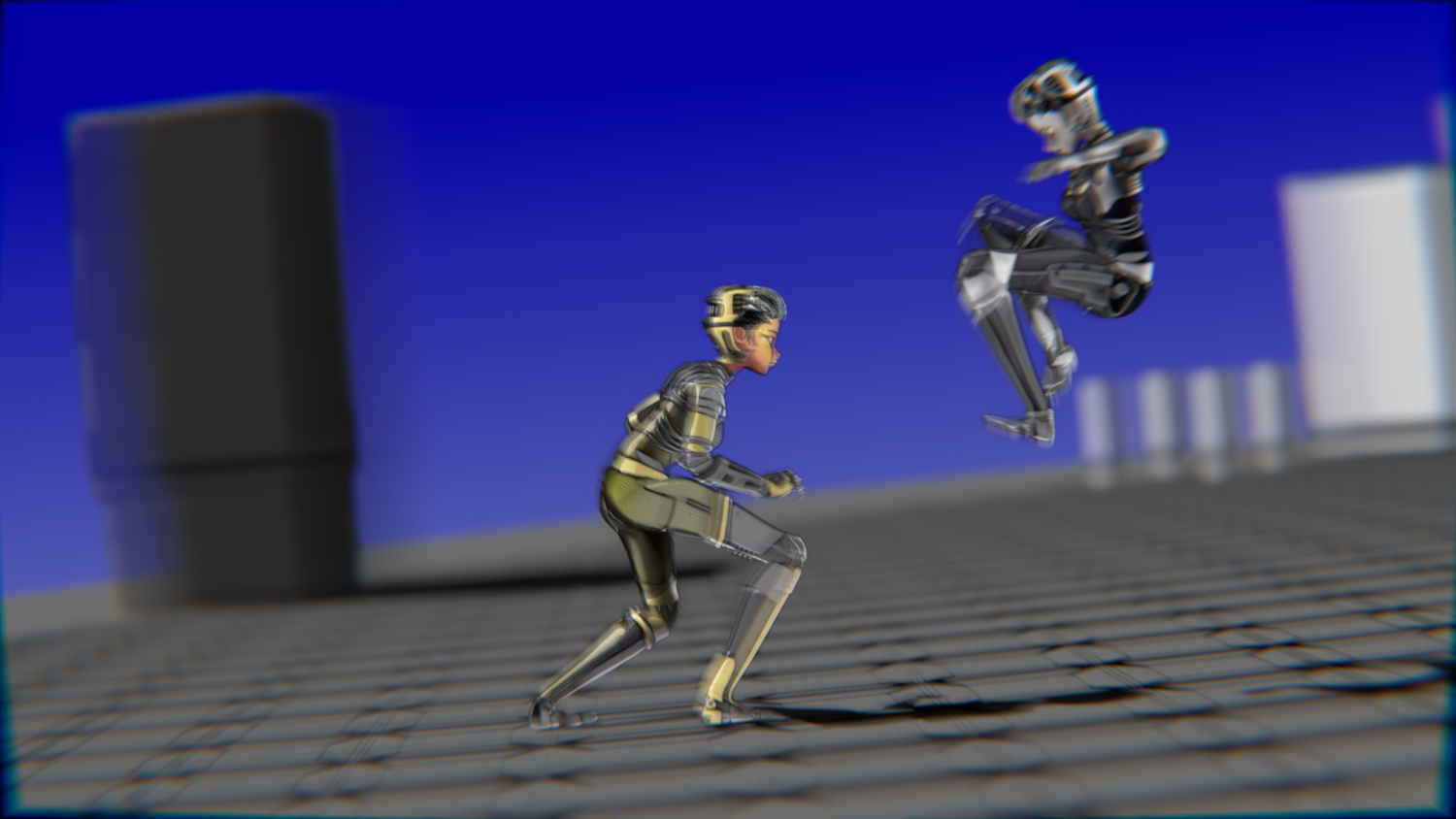 A stylized cyberpunk-inspired combat pack featuring two asymmetric robotic girls (Gold & Gothic variants) with high-tech designs, multiple shader options, and fully rigged combat animations. Perfect for games, cinematics, and stylized renders.