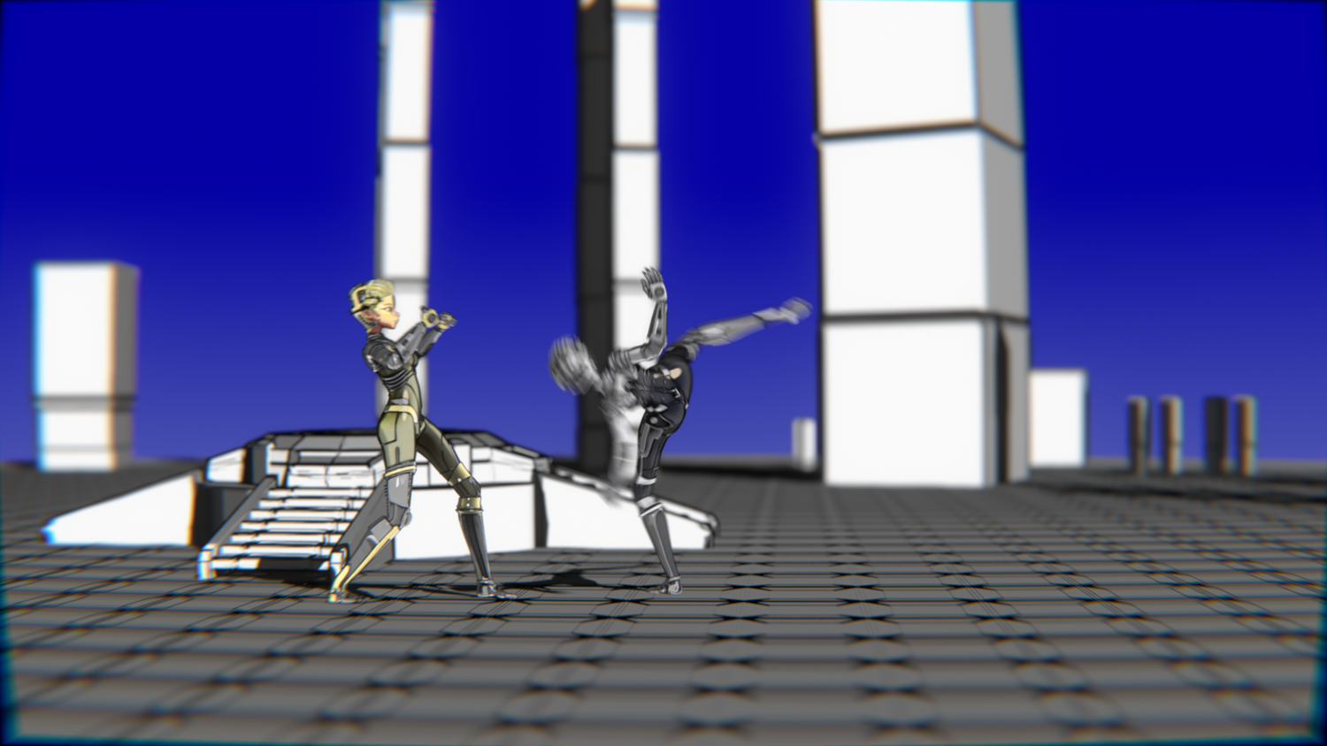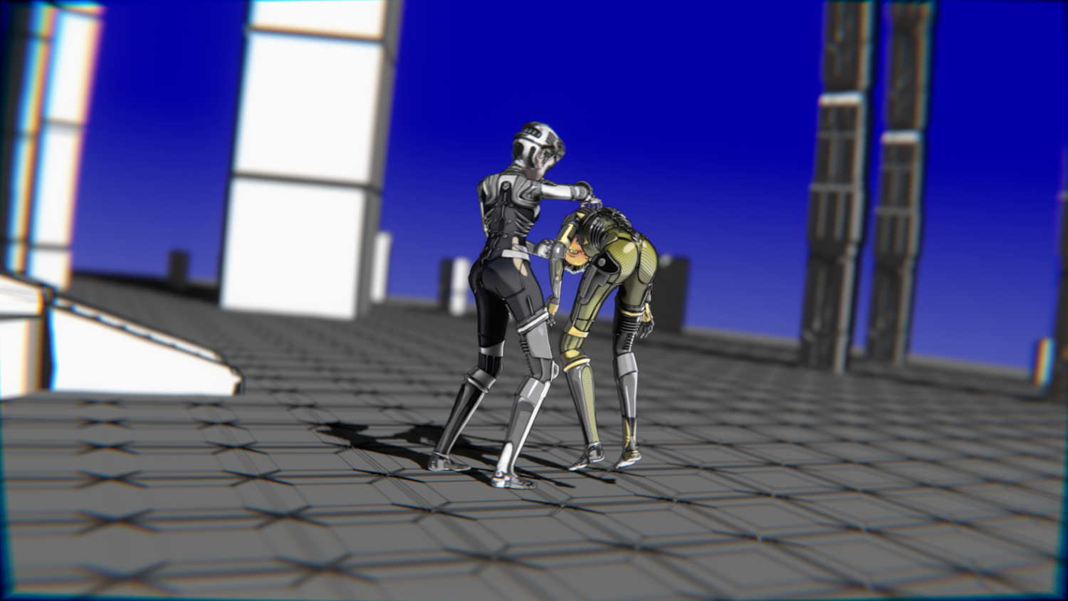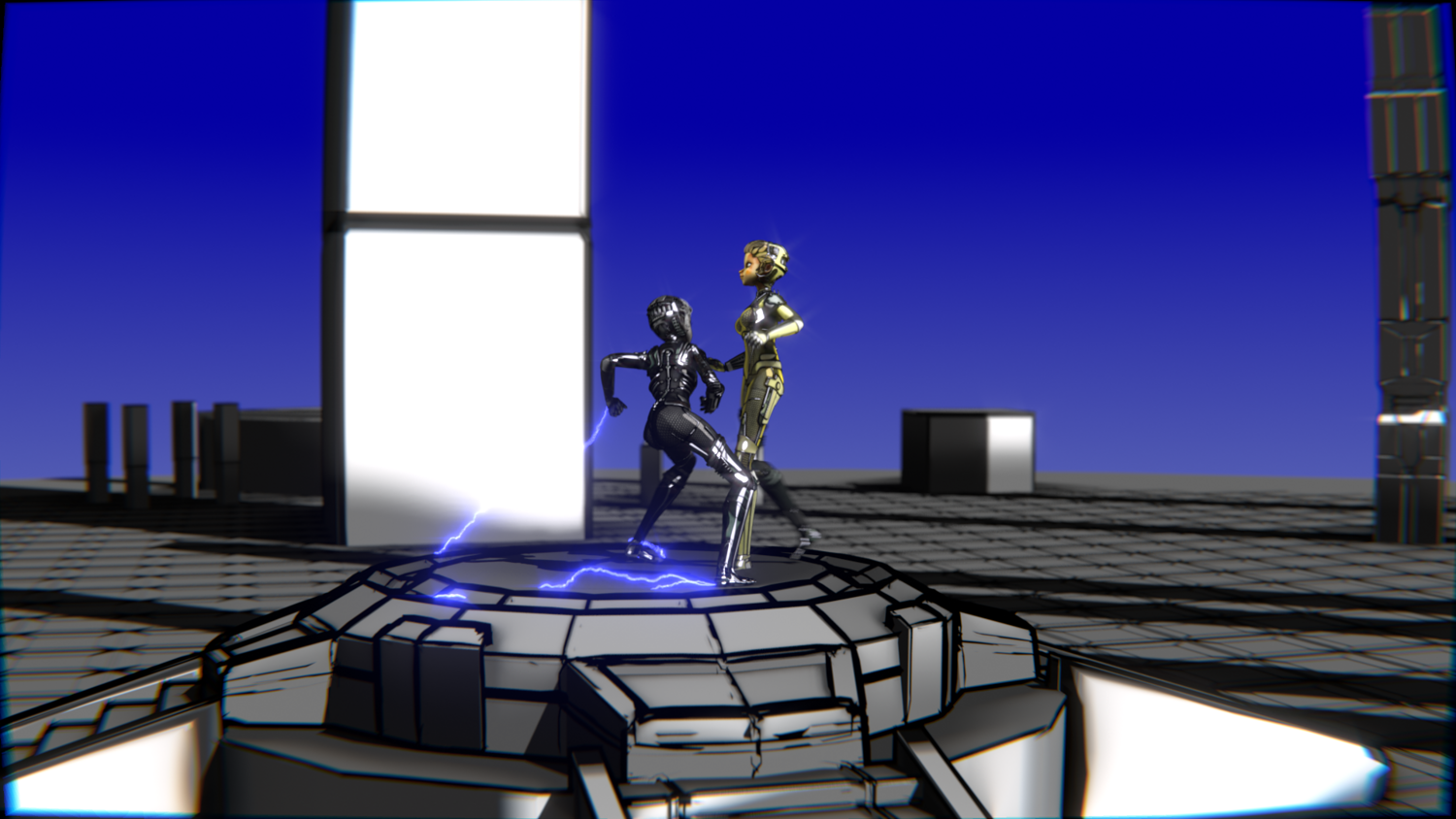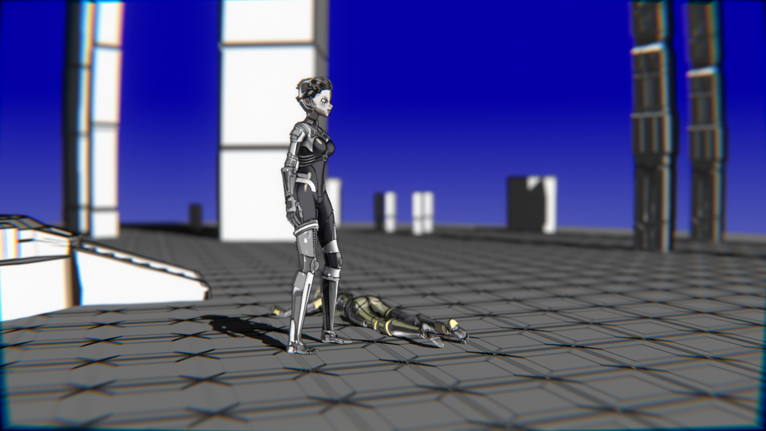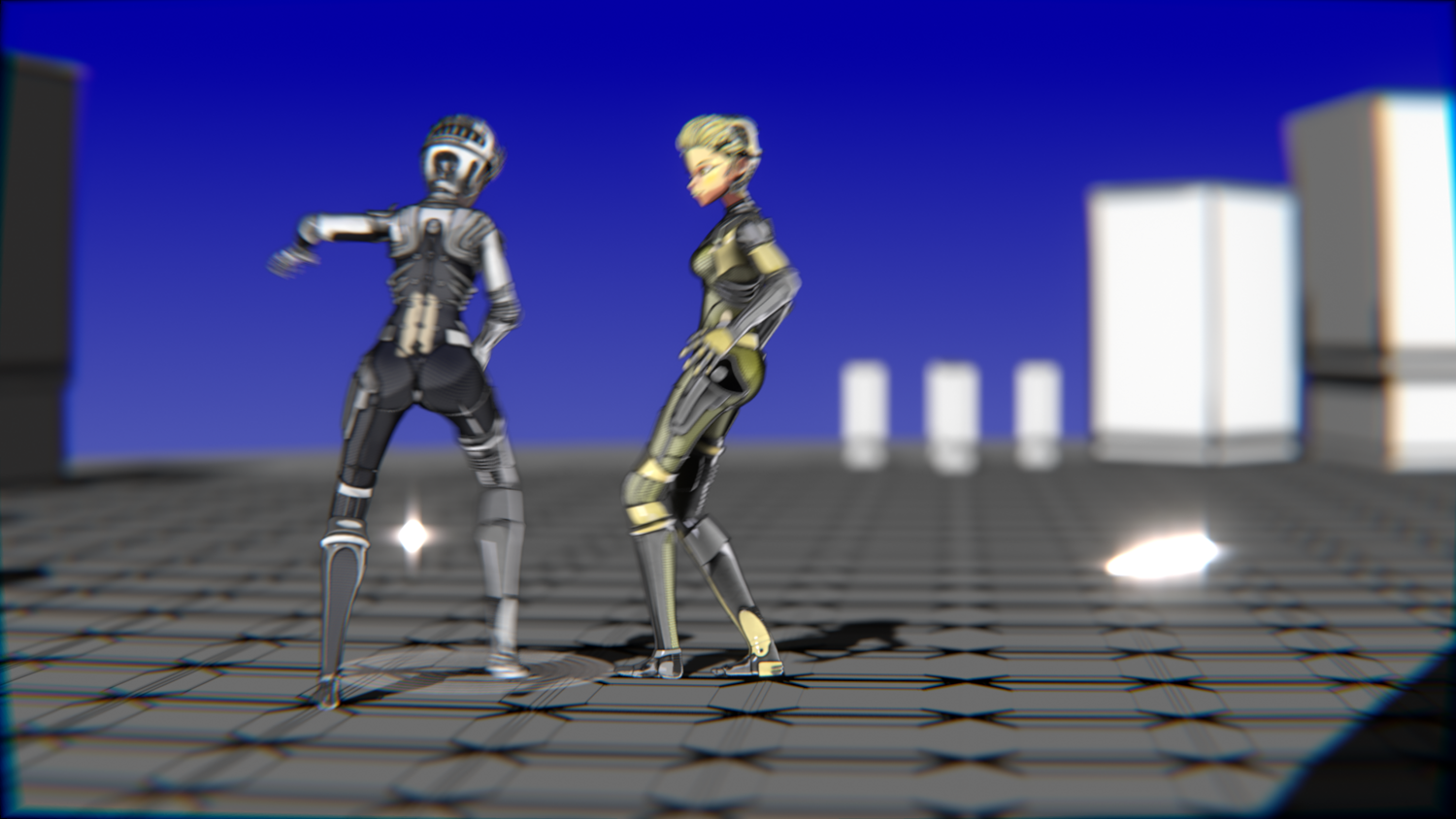 A stylized cyberpunk-inspired combat pack featuring two asymmetric robotic girls (Gold & Gothic variants) with high-tech designs, multiple shader options, and fully rigged combat animations. Perfect for games, cinematics, and stylized renders.