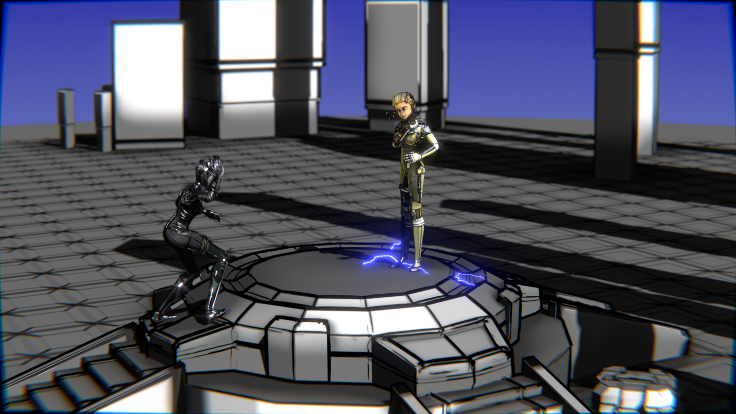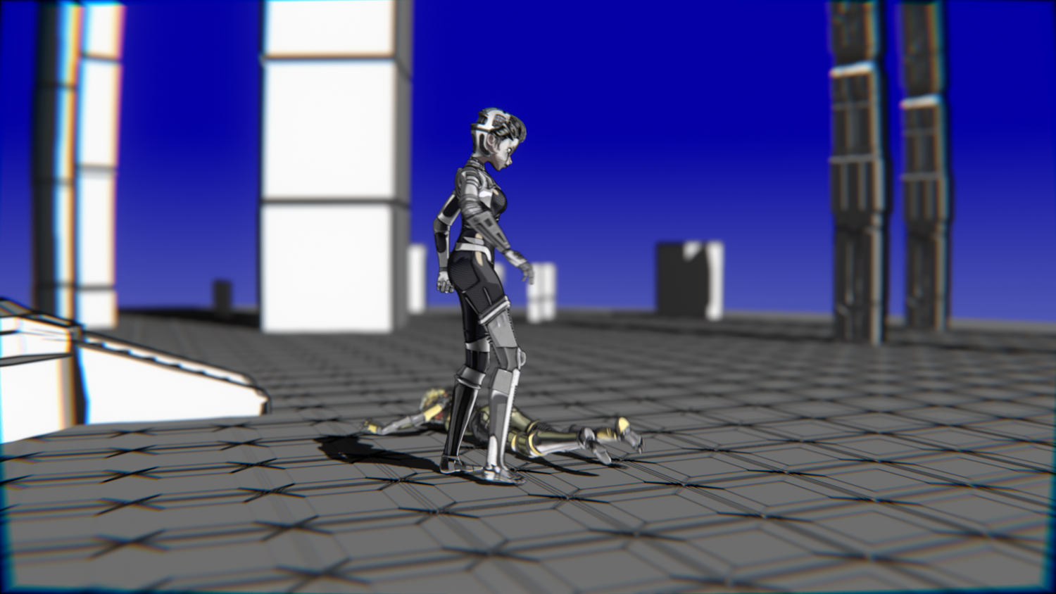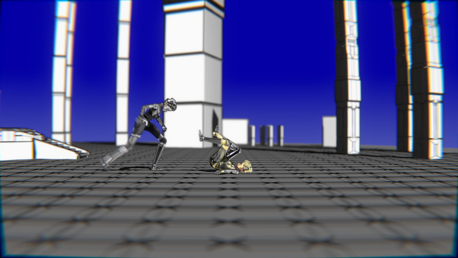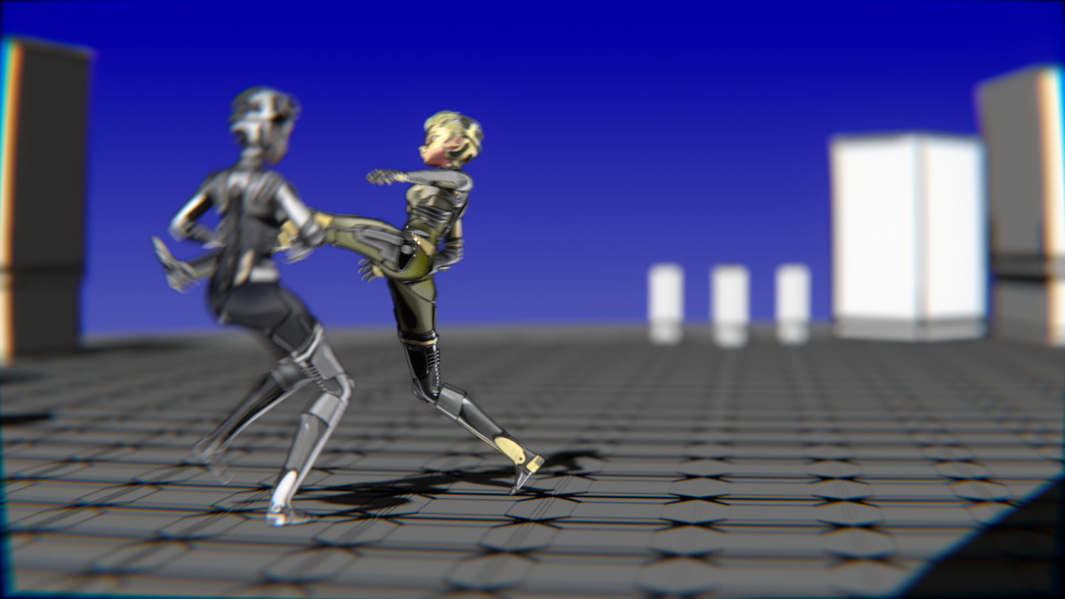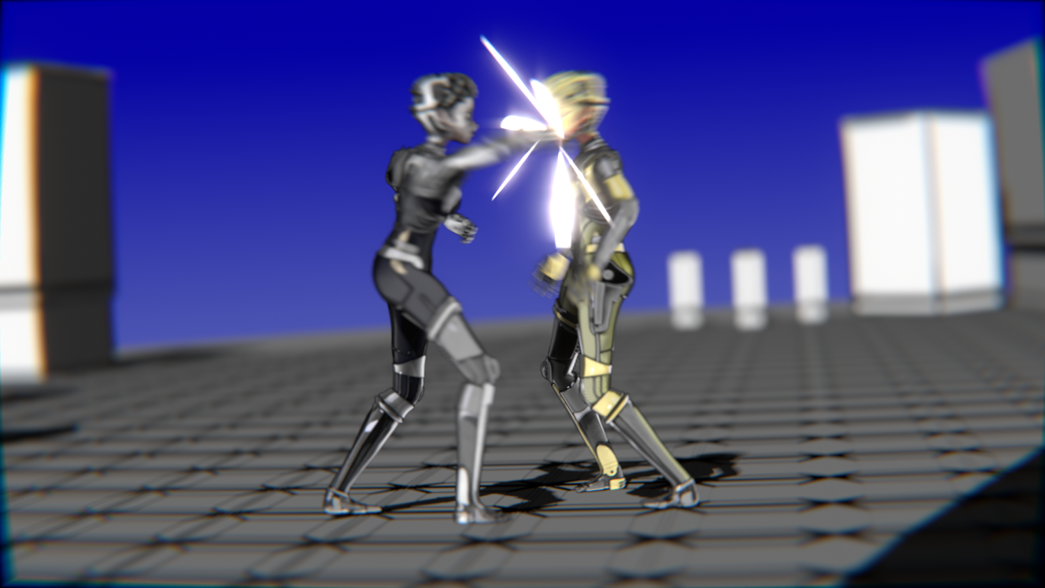 A stylized cyberpunk-inspired combat pack featuring two asymmetric robotic girls (Gold & Gothic variants) with high-tech designs, multiple shader options, and fully rigged combat animations. Perfect for games, cinematics, and stylized renders.