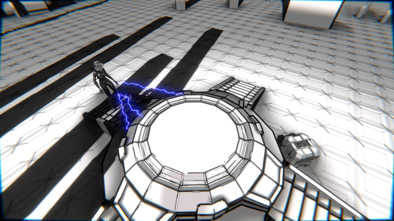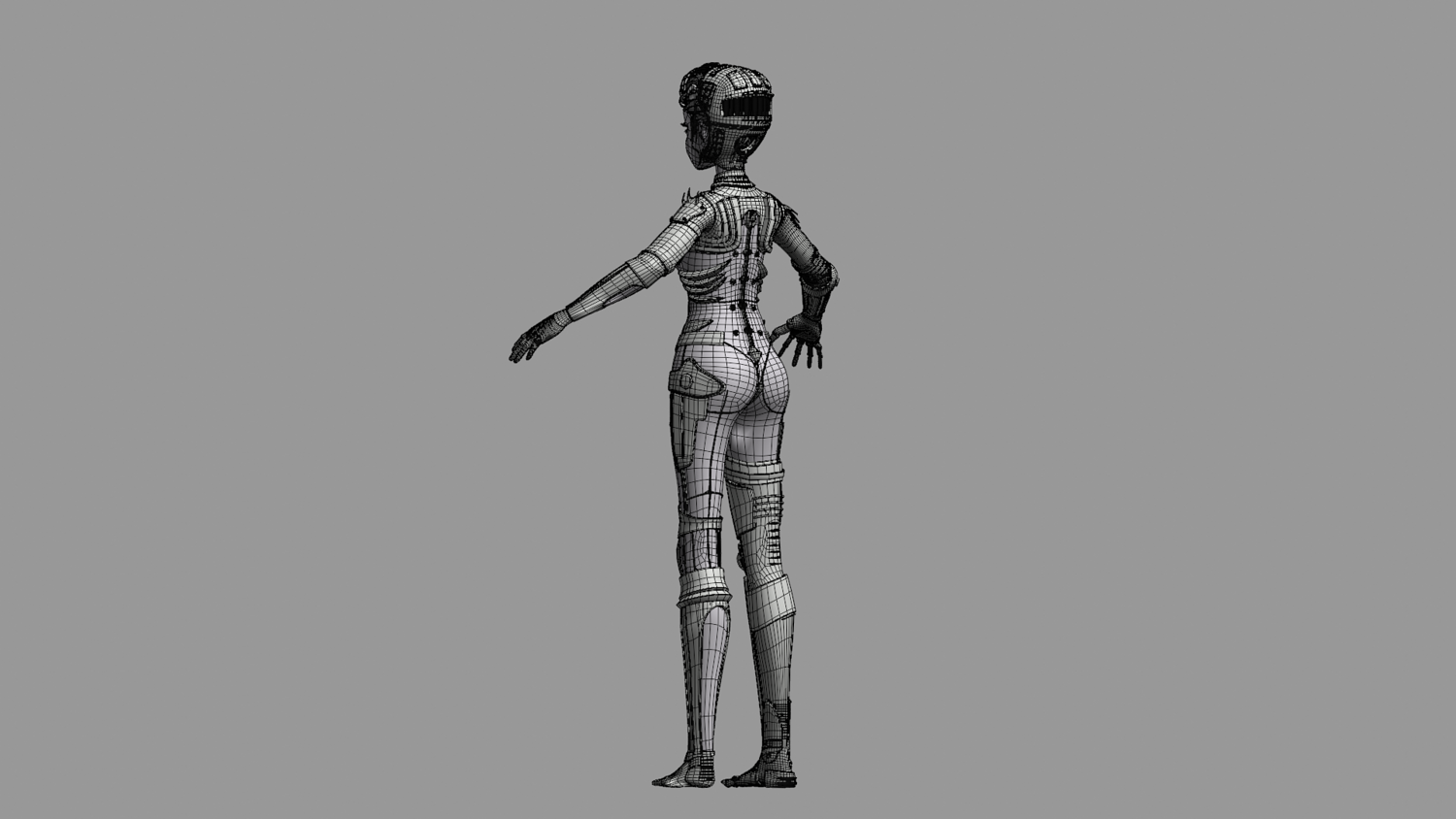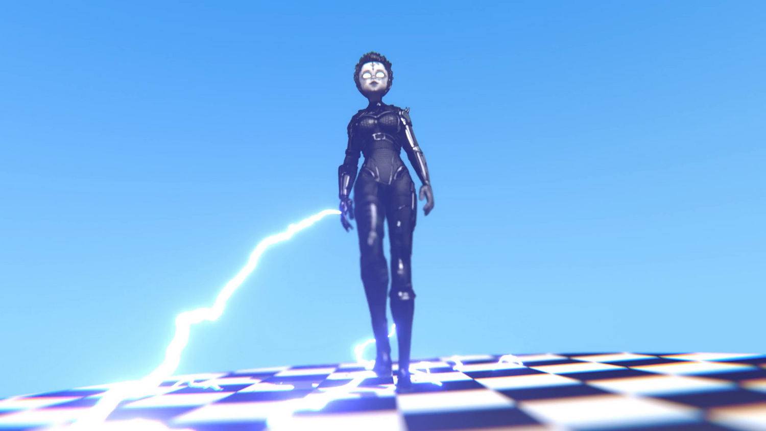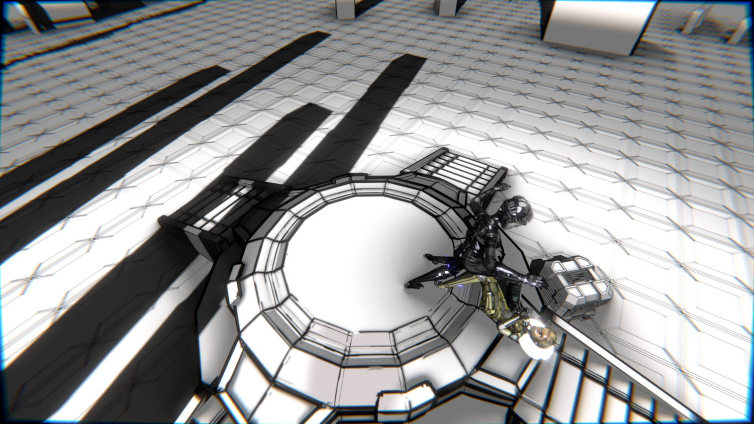 Dark graphite-black suit with silver mechanical plating, pale skin, monochrome eyes, and a minimal, intimidating aesthetic.