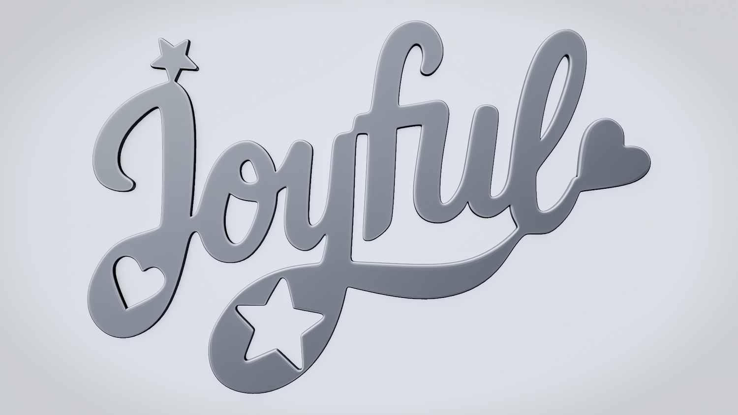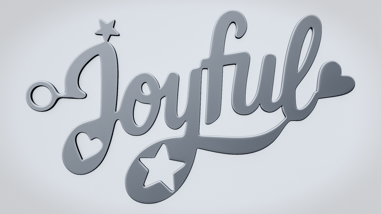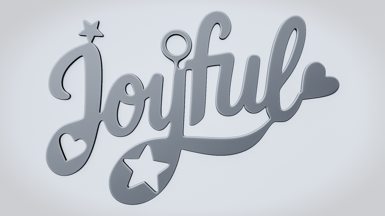 A solid 3D printable design featuring the word JOYFUL in a smooth flowing script, accented with small hearts and stars that give it a bright, uplifting personality. The overall shape feels cheerful, decorative, and visually balanced while keeping the word readable and the model sturdy.
