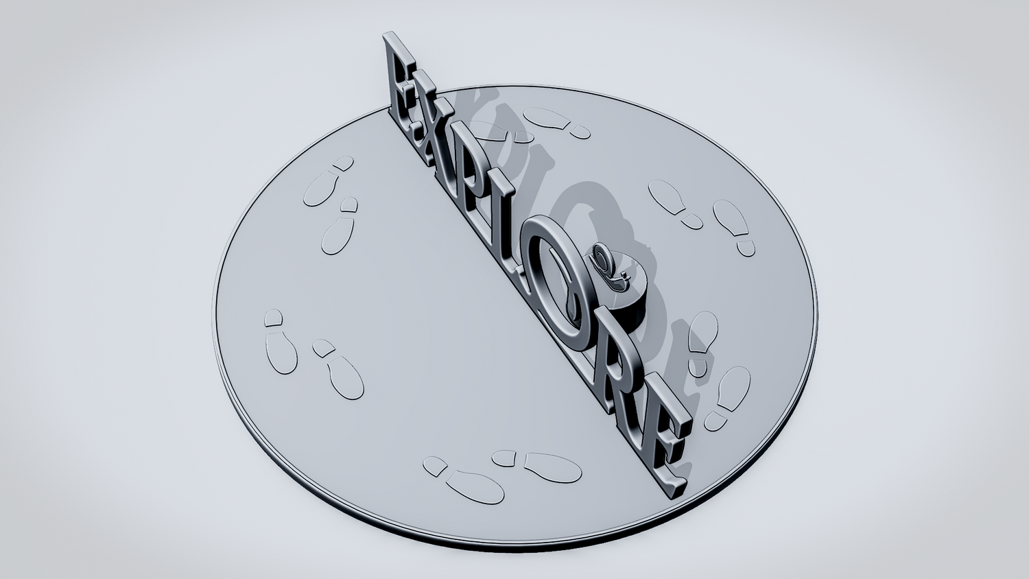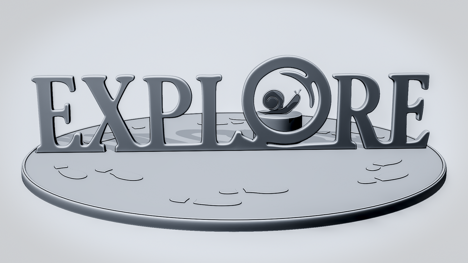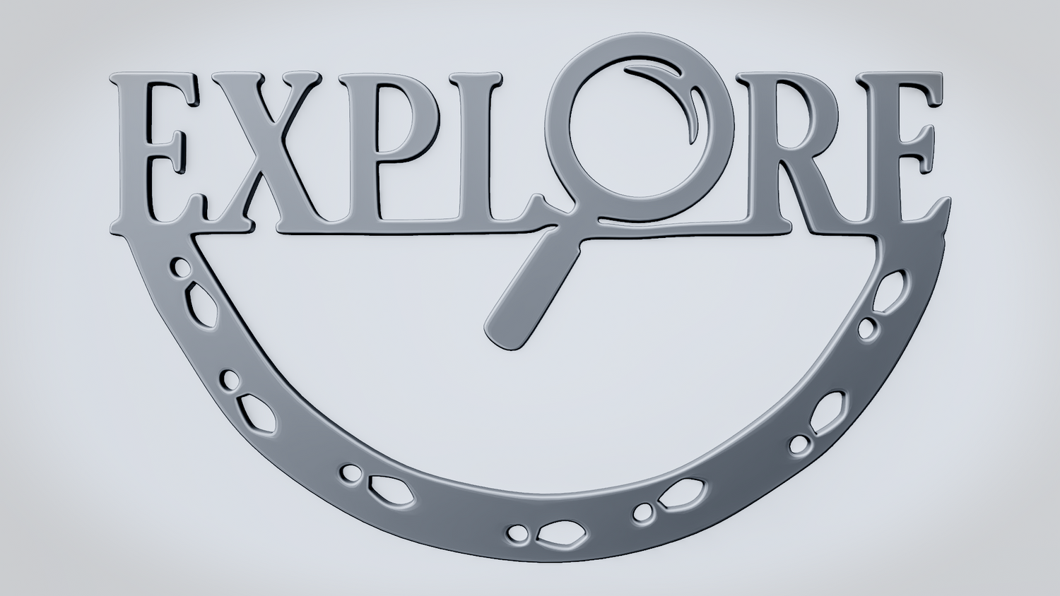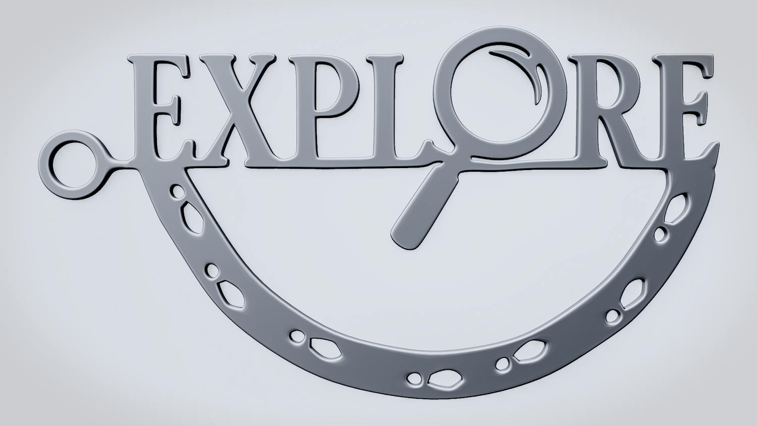 A solid 3D printable design featuring the word EXPLORE in a clean, readable layout, with a magnifying glass integrated into the lettering to reinforce the discovery theme. The curved lower frame and footprint details give the shape a travel-inspired look while keeping the model sturdy and visually clear.