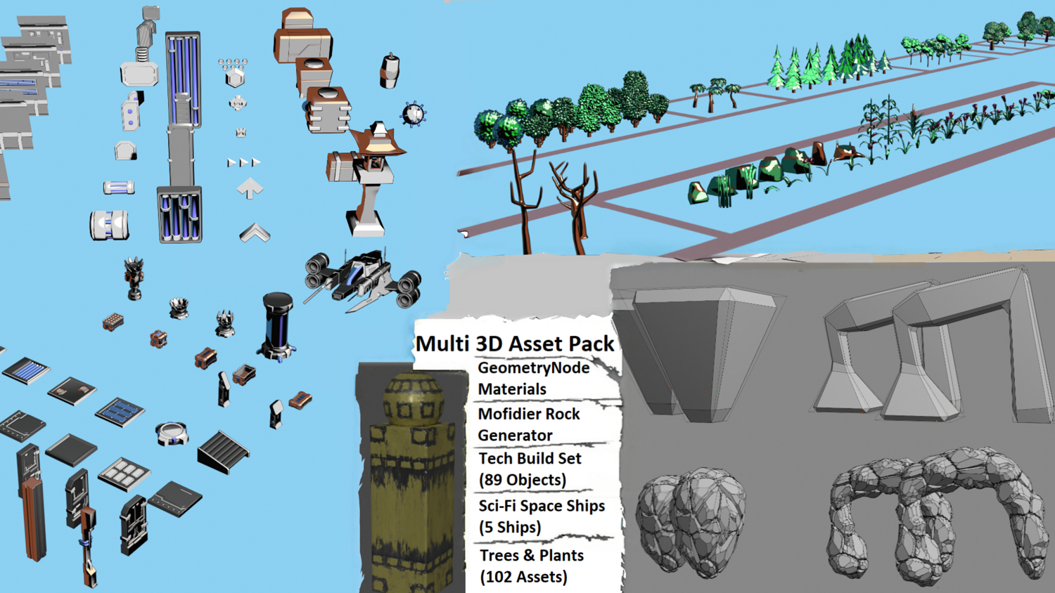 This megapack combines 15 production-ready sets spanning environments, architecture, props, robots, and authoring tools. Most assets include PBR and Toon (LBS + outline) materials, clean UVs, and 1K/2K/4K textures for both real-time and cinematic pipelines. Several props are fully rigged (with armatures and hooked curves) for immediate animation. You also get high-value creation tools—Geometry Nodes materials, a rock generator, 89-piece tech kit, 5 sci-fi ships, and 102 trees/plants—to populate scenes quickly. Authored in Blender and textured in Substance Painter where noted, with consistent scale and tidy object/material organization. Pack Highlights 15 sets: environments, bridges, houses, stations, robots, rigged mechanical arms, plus creation tools Shaders: PBR + Toon (LBS + outline) across the pack Textures: UV unwrapped; 1K/2K/4K (per item) Rigged assets: robotic arms, info robot; some environment props are animated Tools: GN materials, rock generator, tech kit (89 objs), 5 ships, foliage (102 assets) Formats: Original .blend for all; FBX/OBJ where specified (e.g., Prison Cell set)