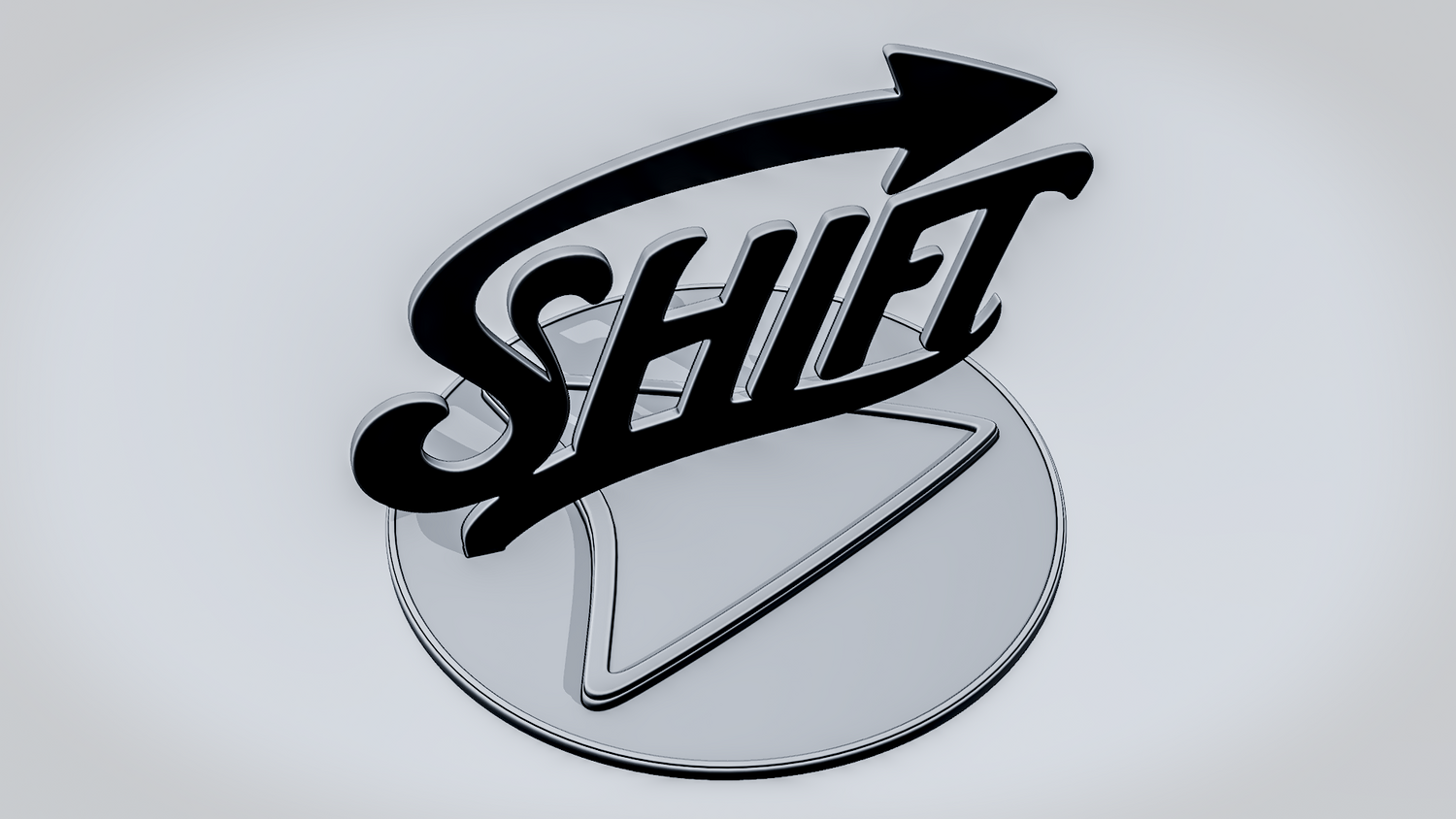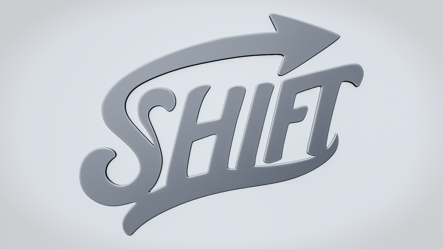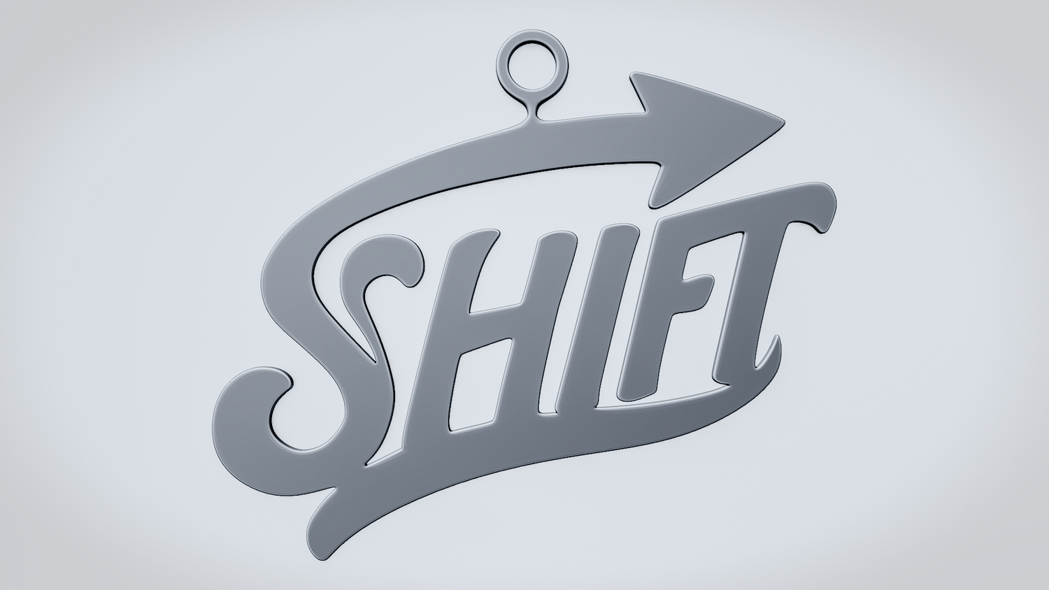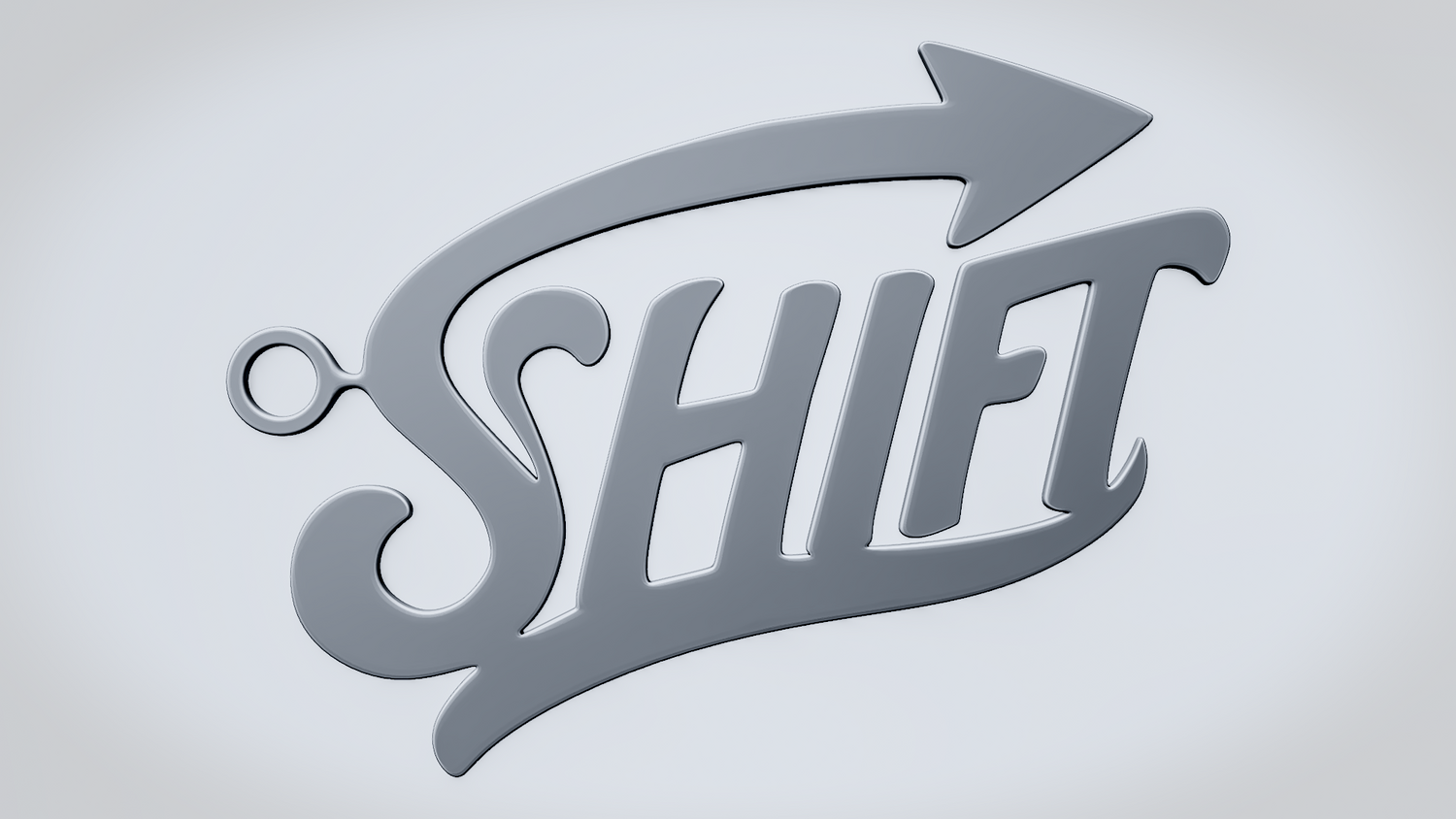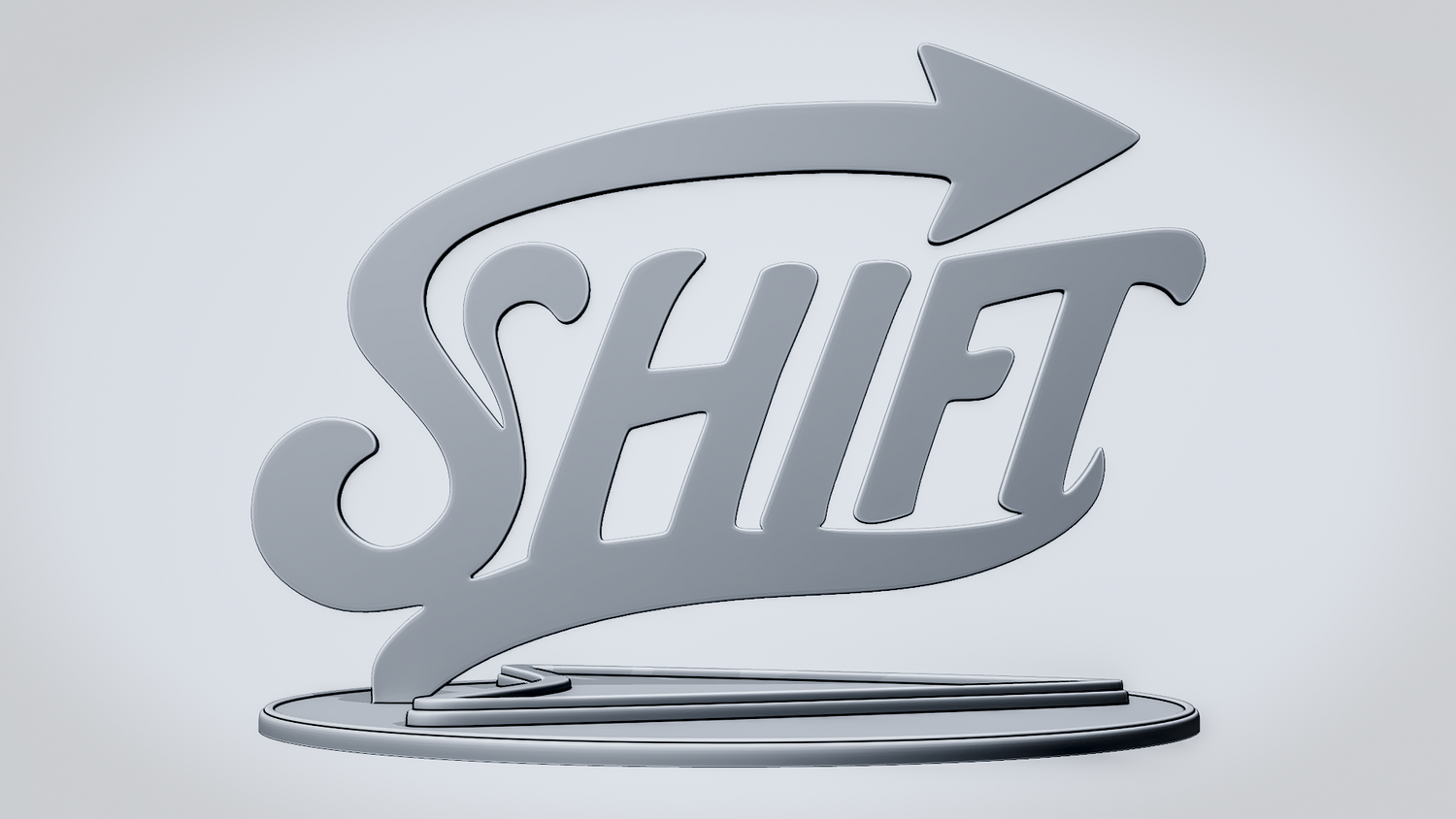 A solid 3D printable design featuring the word SHIFT in a flowing, stylized script, wrapped with a sweeping arrow that reinforces movement, transition, and forward direction. The overall shape feels dynamic, clean, and easy to read while keeping the design sturdy and visually striking.