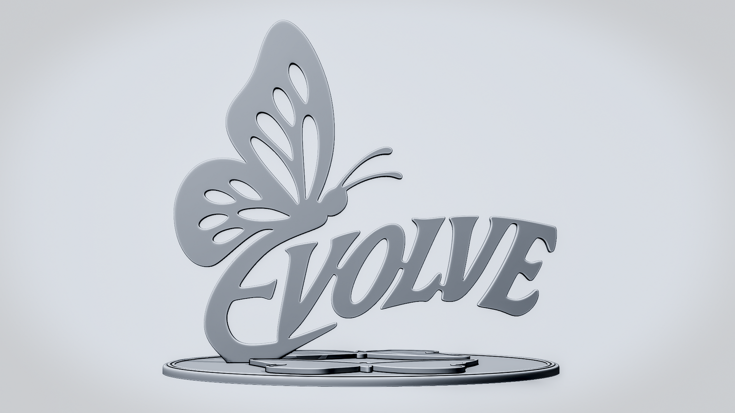 Statue Version: The statue version presents EVOLVE as a freestanding display piece on a round decorative base with a matching butterfly motif that reinforces the transformation theme. It keeps the butterfly silhouette and lettering clearly visible while giving the model a polished, display-ready presence for desks, shelves, or themed setups.