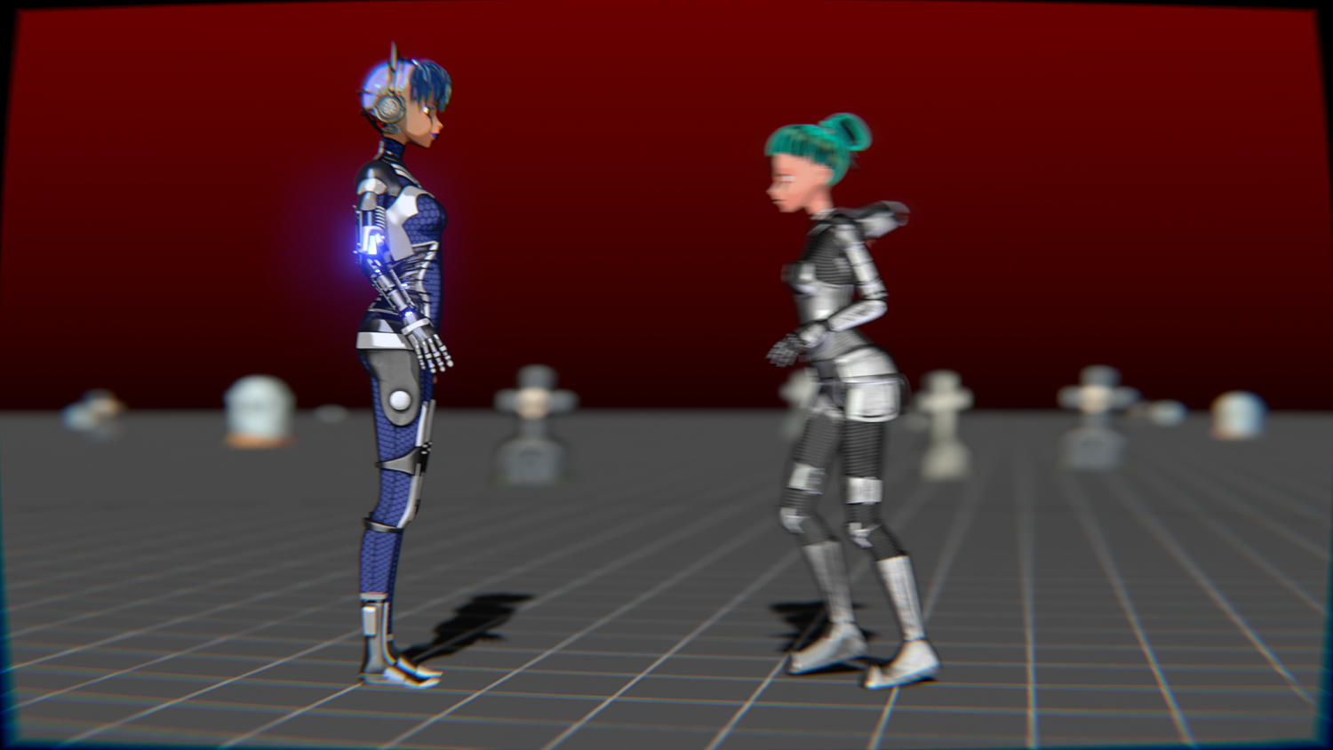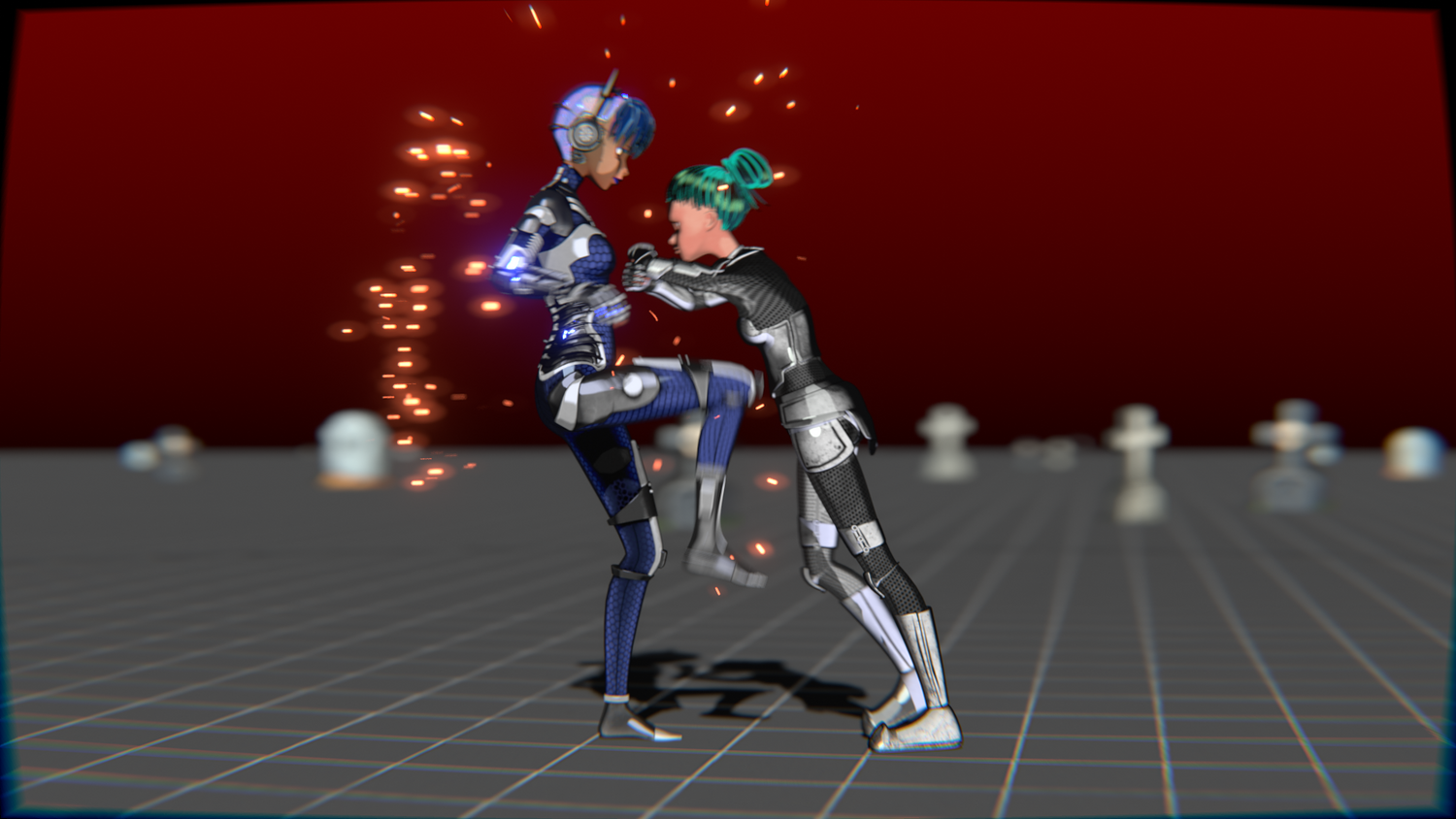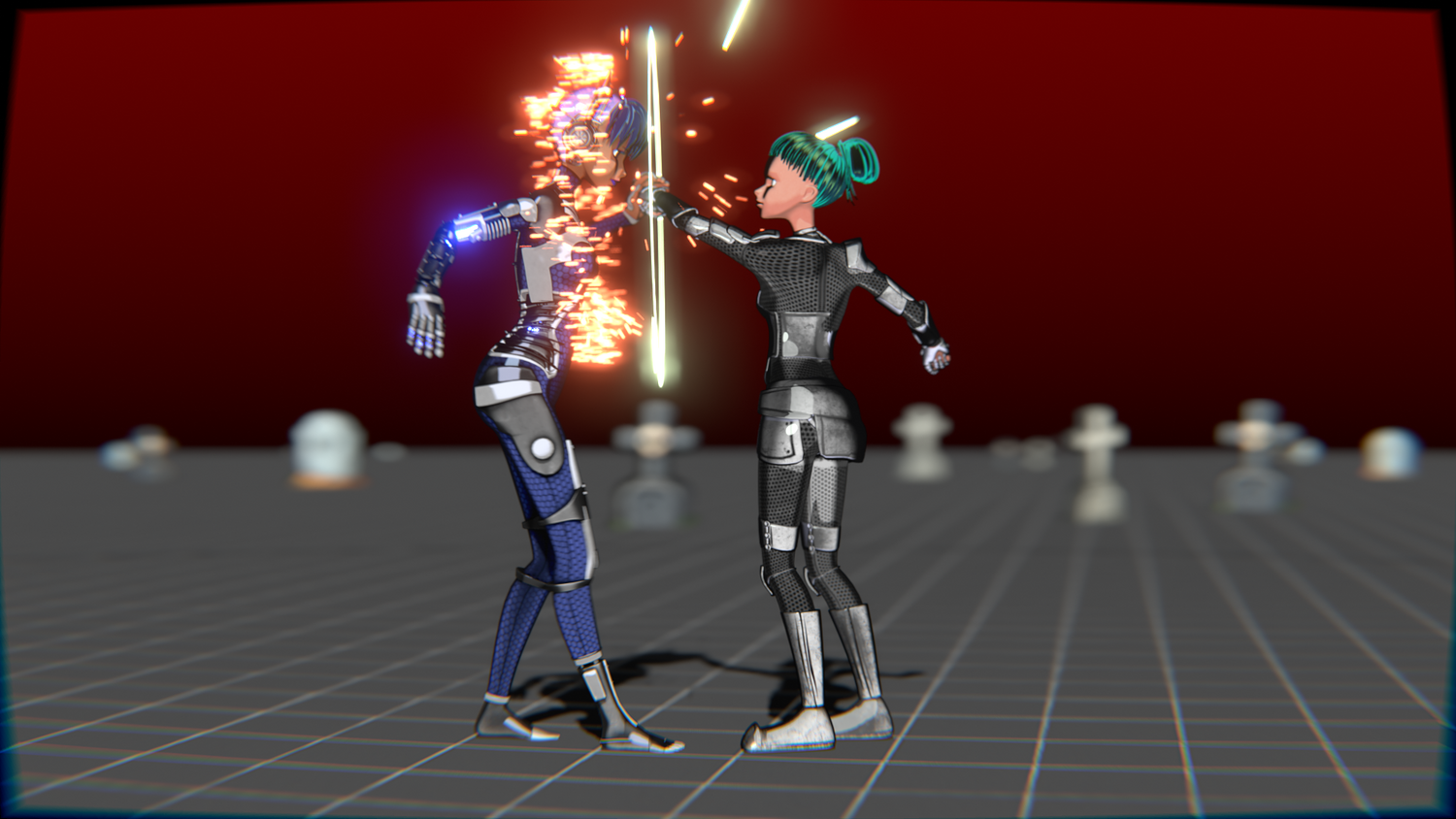 A cinematic action/combat animation featuring two stylized female characters battling inside a virtual graveyard arena. Includes particle effects, hit-curve VFX, teleportation, and dagger summoning. The animation is loop-ready: first and last frames are identical, creating a seamless combat cycle for real-time use or cinematic looping.