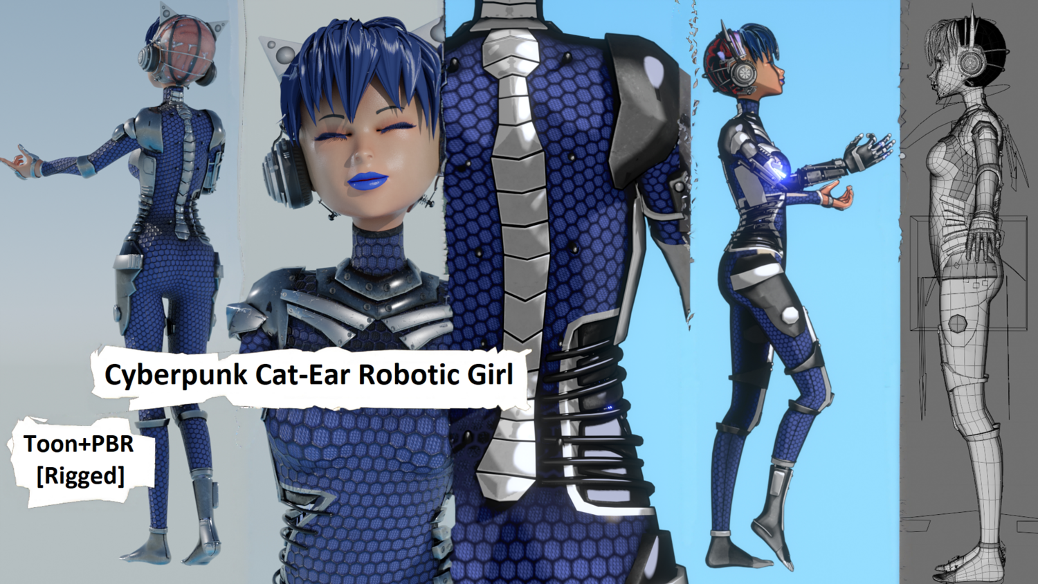 Robotic Girl with Cat-Ear Headset Shaders: PBR + Toon Formats: .blend (original), .fbx, .obj Fully textured Includes bonus walk cycle animation