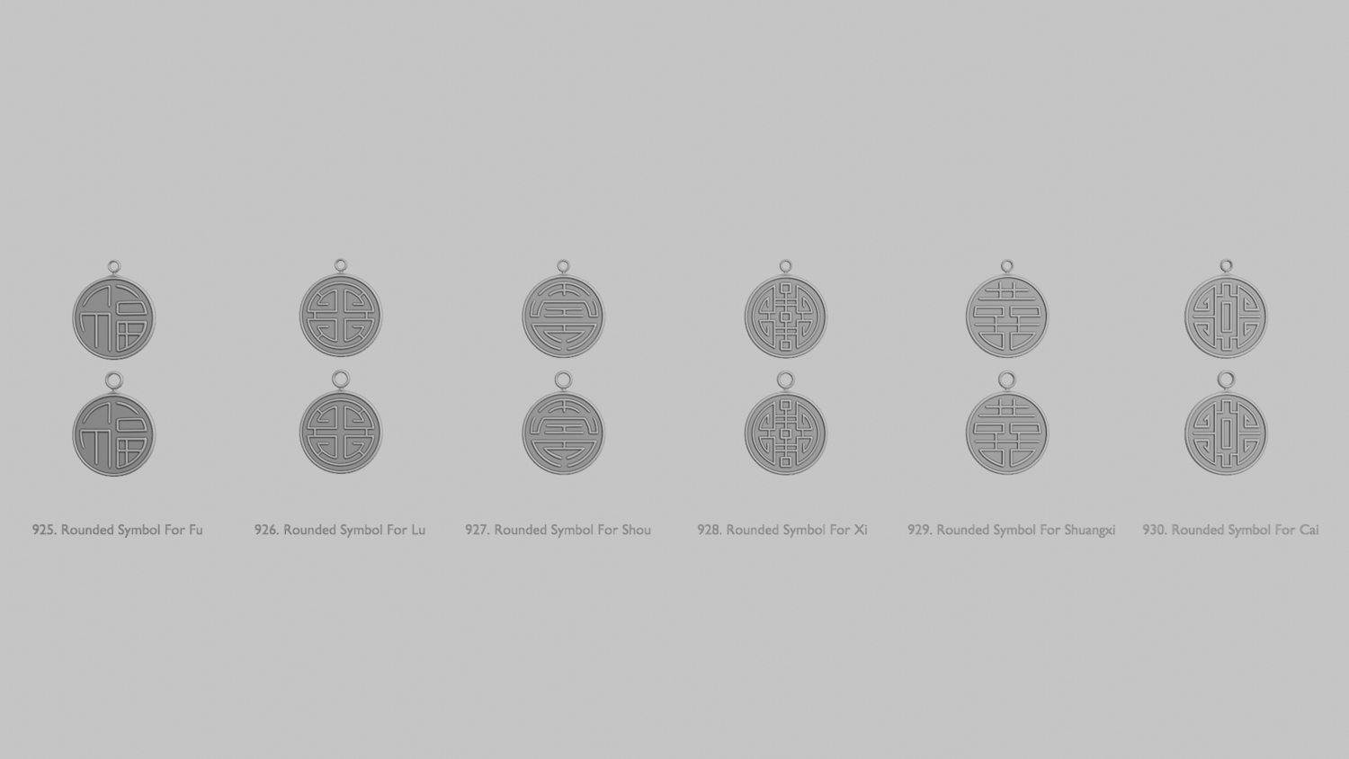 Lu, Cai, Shuangxi, Xi, Shou, Fu — six rounded symbols for prosperity, joy, and fortune