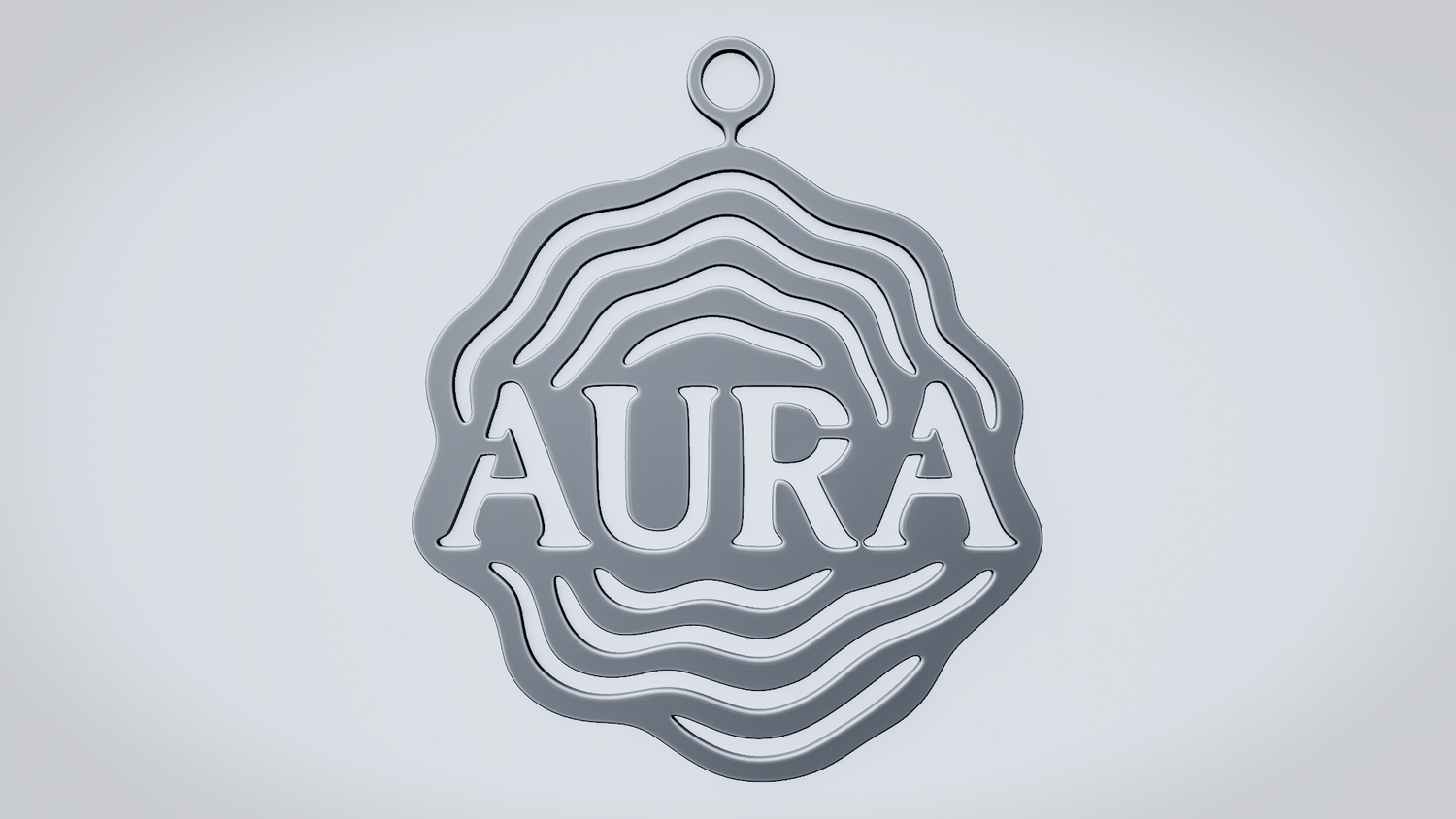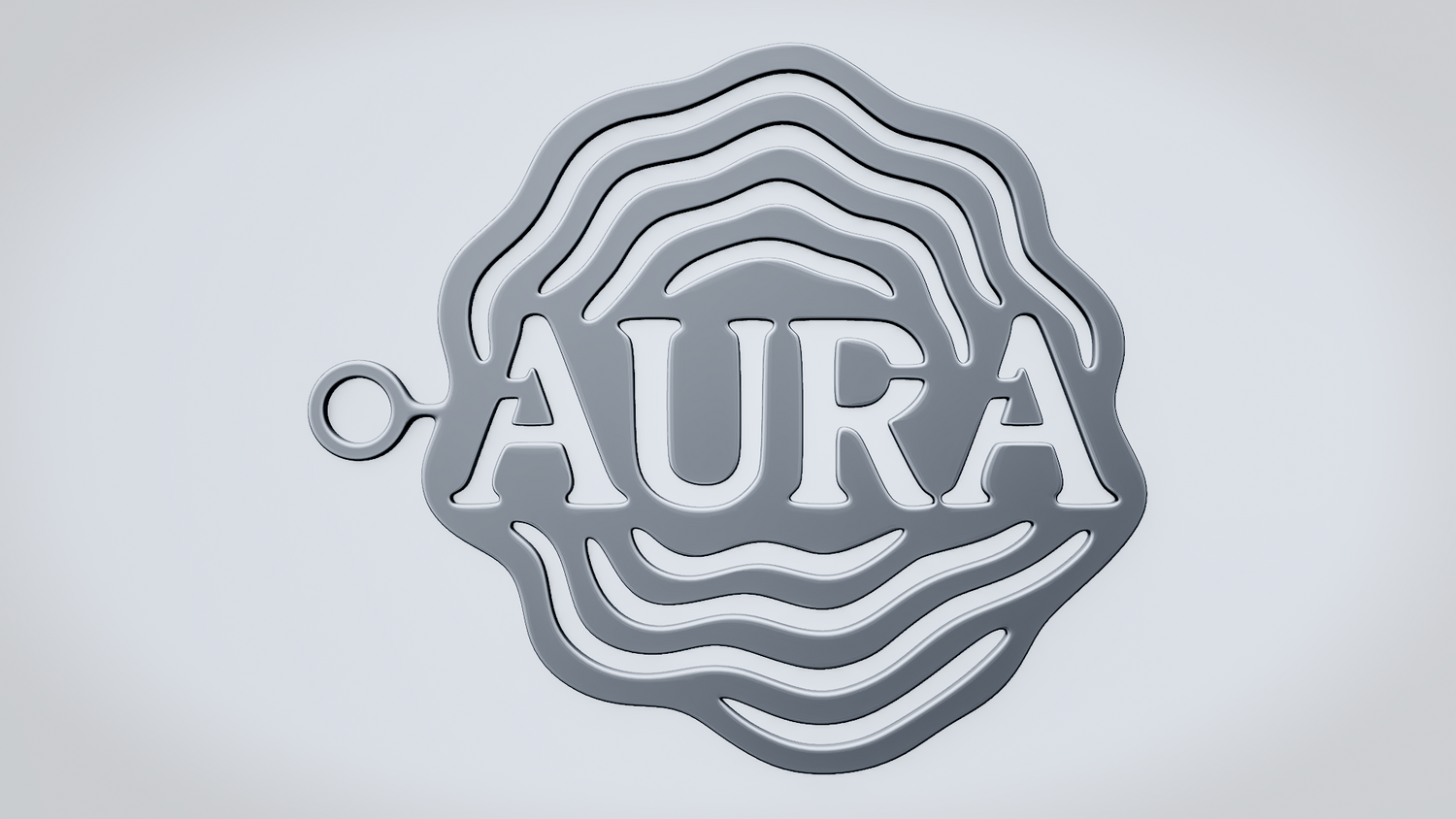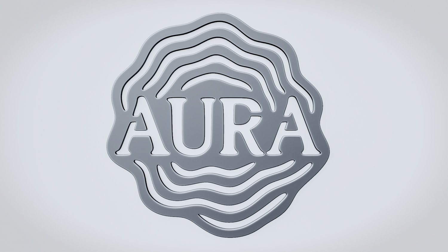 A solid 3D printable design featuring the word AURA framed by layered flowing contour lines that give it a radiant, surrounding energy effect. The overall shape feels smooth, atmospheric, and visually balanced while keeping the design readable, sturdy, and distinctive.