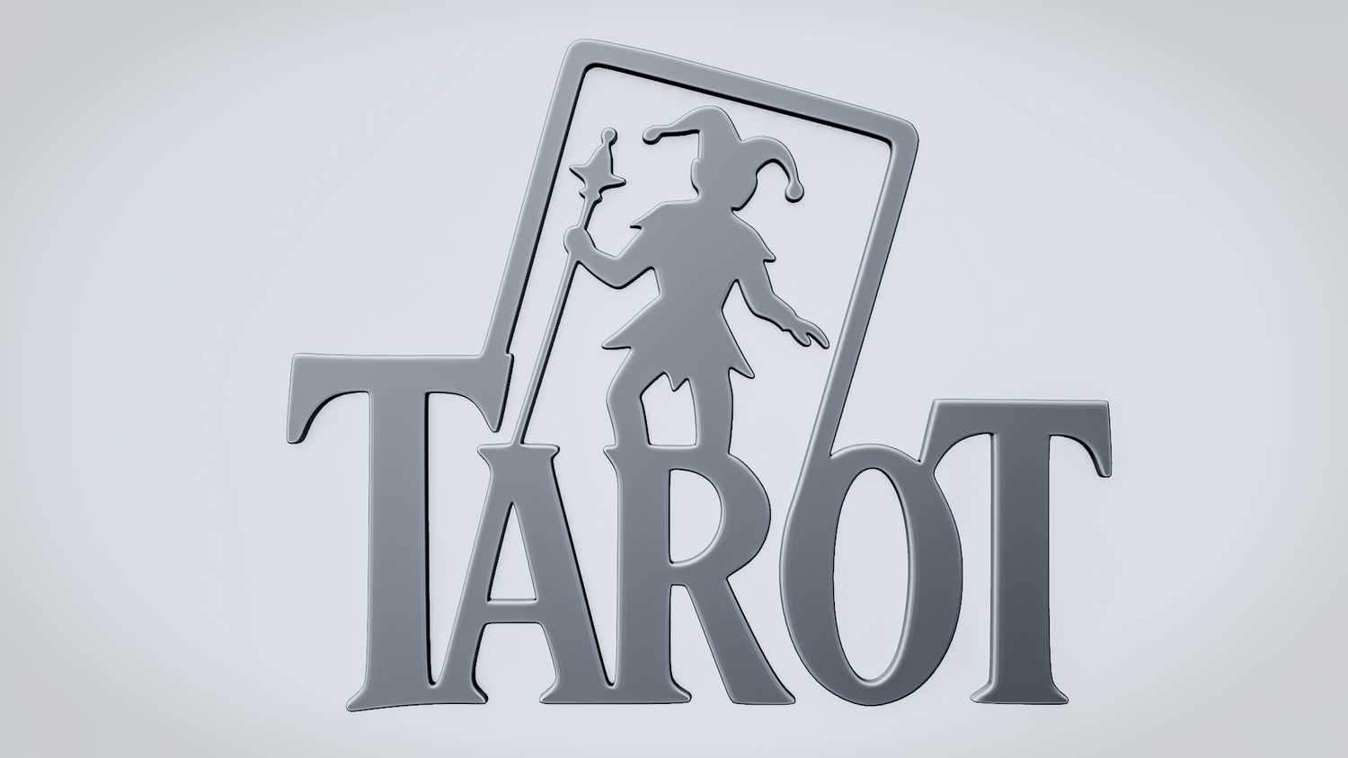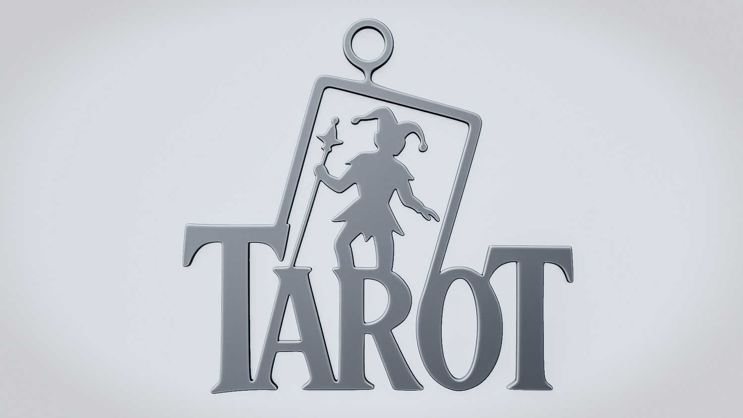 A solid 3D printable design featuring the word TAROT in a bold serif style, combined with a tarot card frame and a jester-like figure to reinforce the mystical divination theme. The overall shape feels symbolic, decorative, and visually balanced while keeping the word readable and the model sturdy.