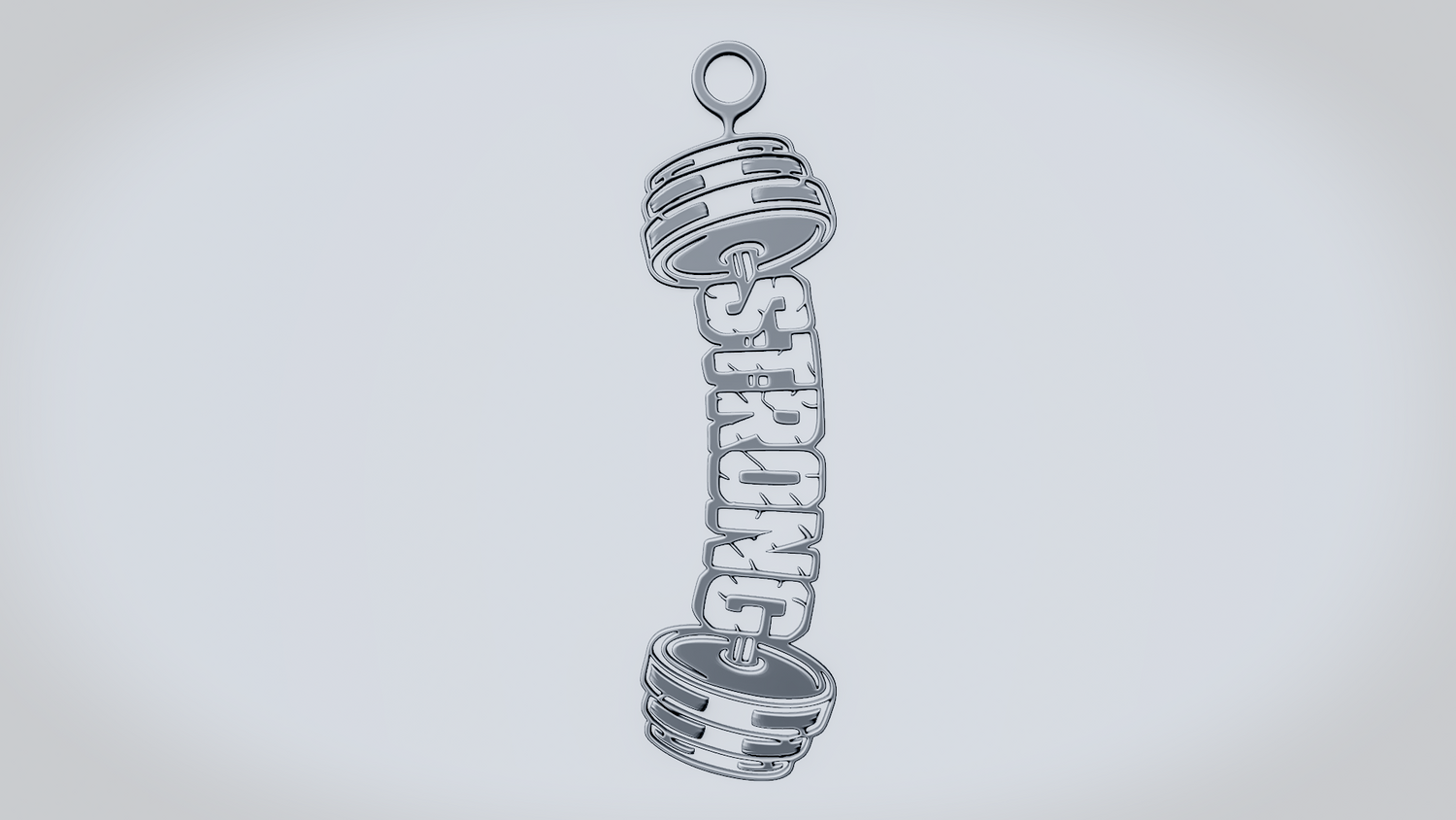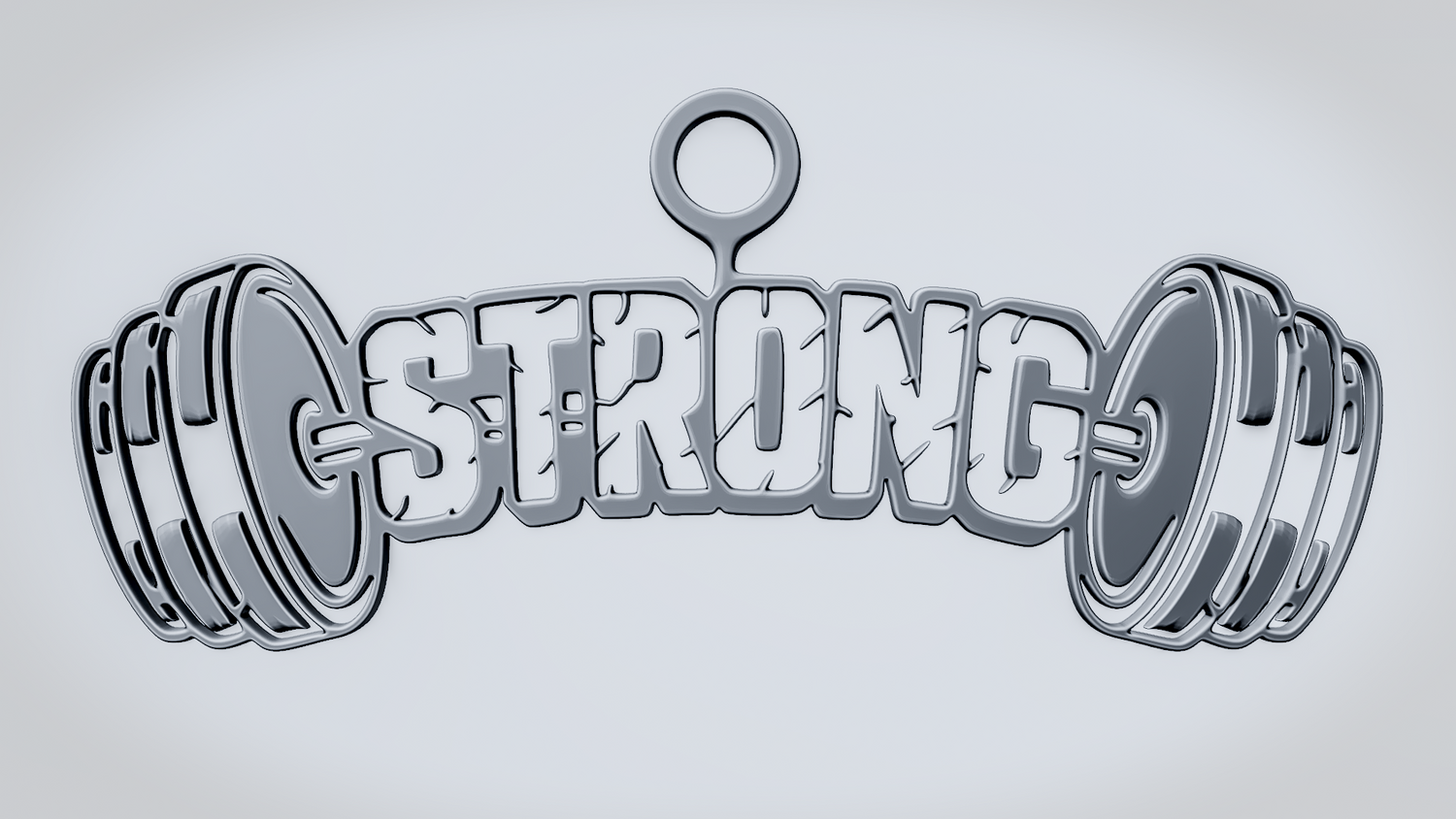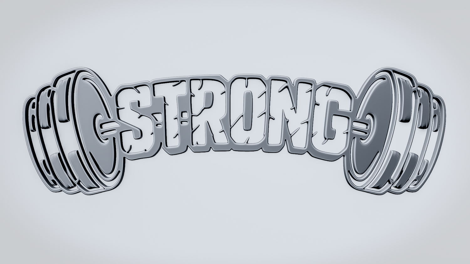 A solid 3D printable design featuring the word STRONG integrated into a dumbbell-shaped form, with weight plates on both sides reinforcing a bold fitness and strength theme. The overall shape feels powerful, balanced, and visually striking while keeping the word readable and the model sturdy.