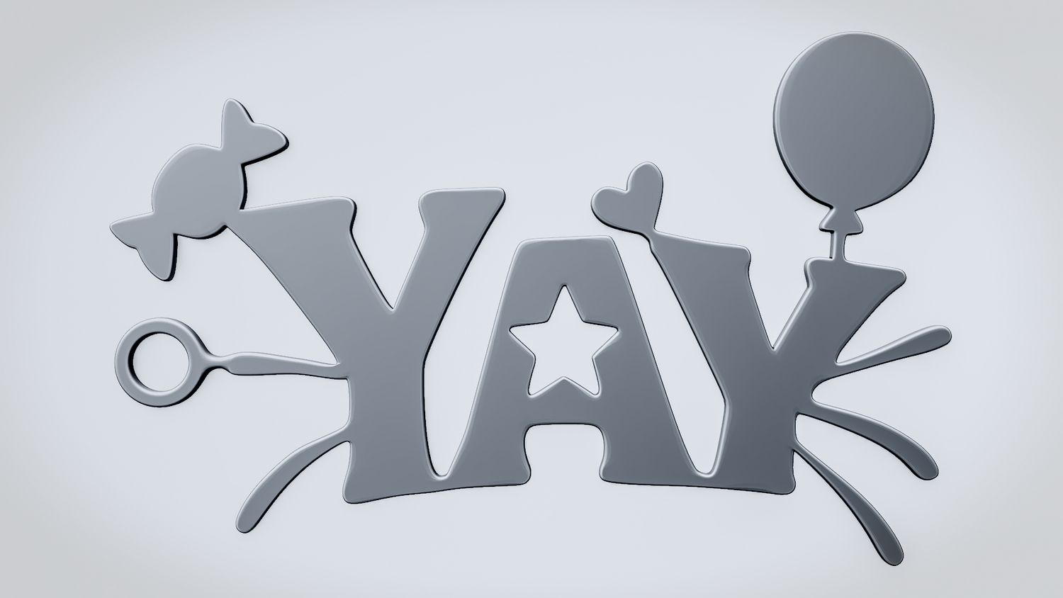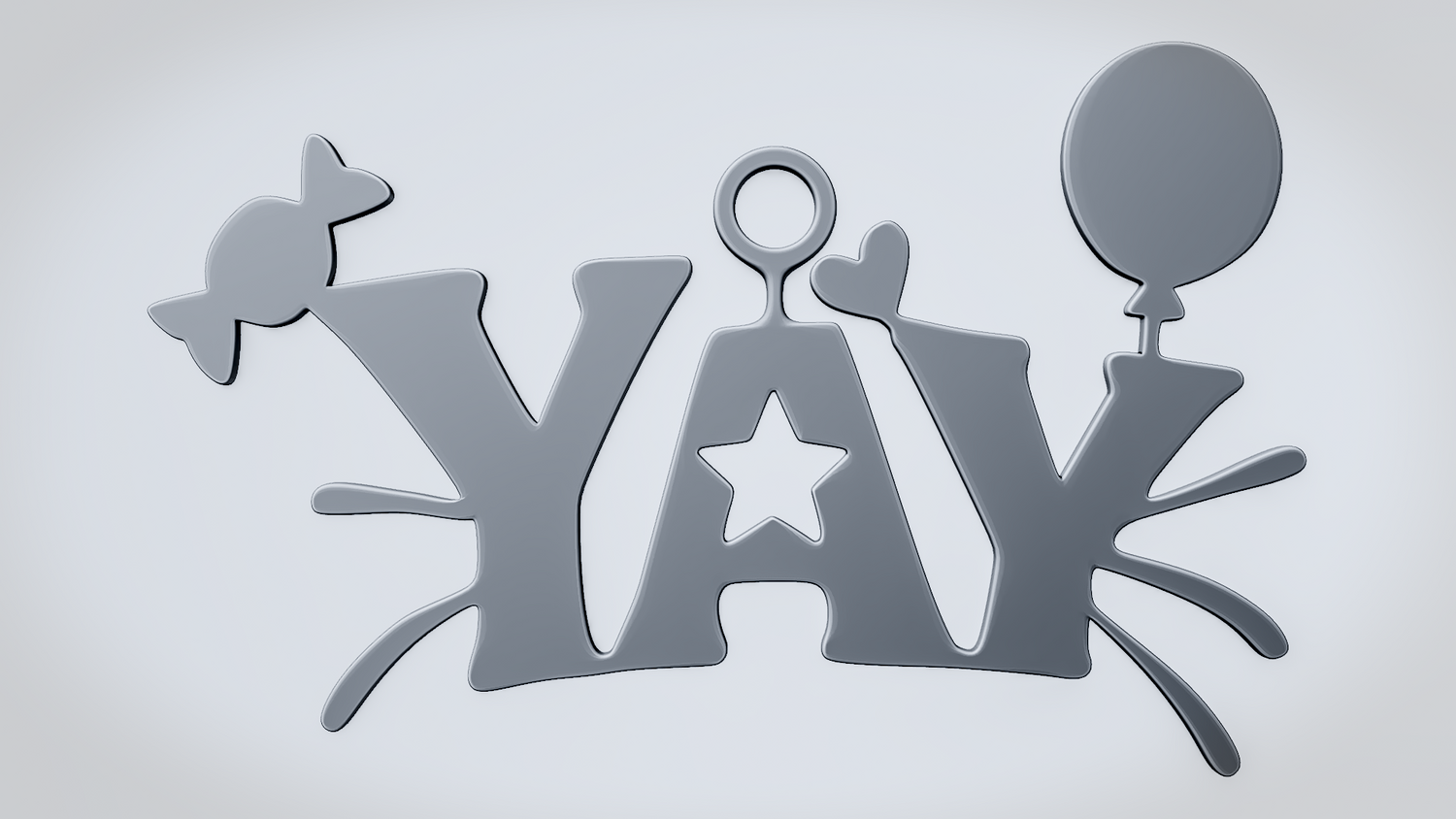 A solid 3D printable design featuring the word YAY in a bold playful style, decorated with party-inspired accents like a candy shape, balloon, star, and celebratory burst lines. The overall shape feels festive, energetic, and visually balanced while keeping the word readable and the model sturdy.