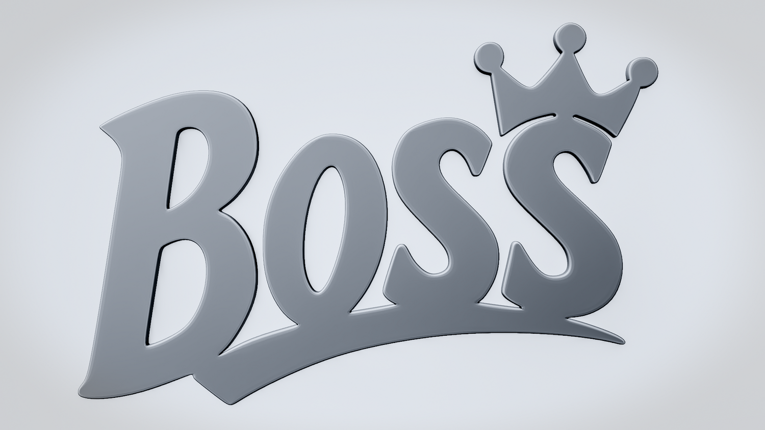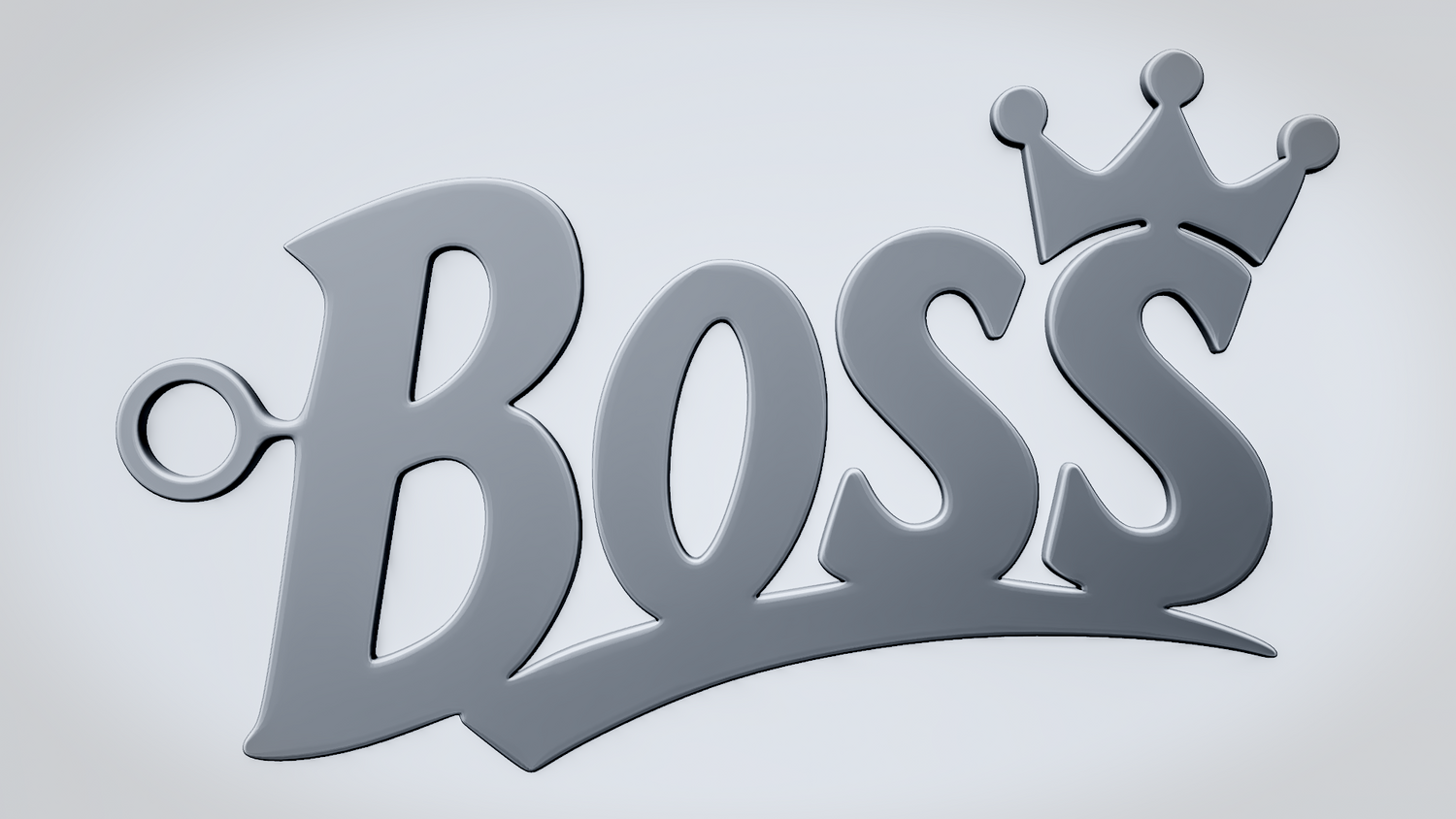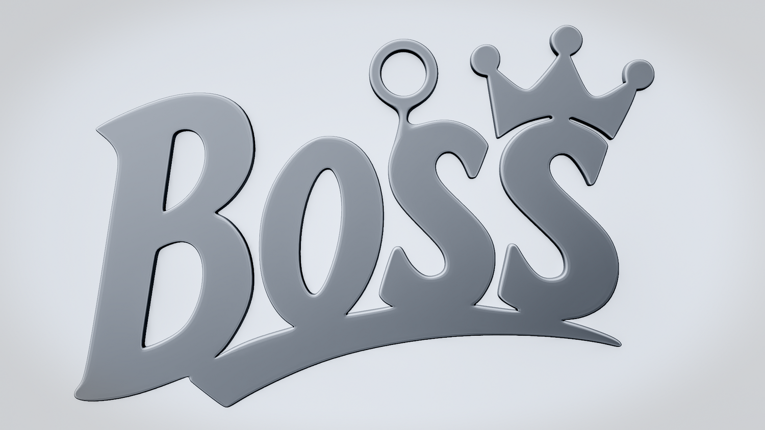 A solid 3D printable design featuring the word BOSS in a bold, confident script style, with strong strokes and commanding curves that project authority and leadership. The overall shape feels smooth, clean, and visually balanced while keeping the word readable and the model sturdy.