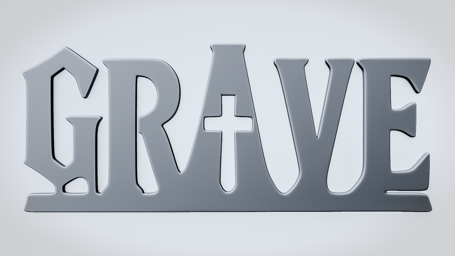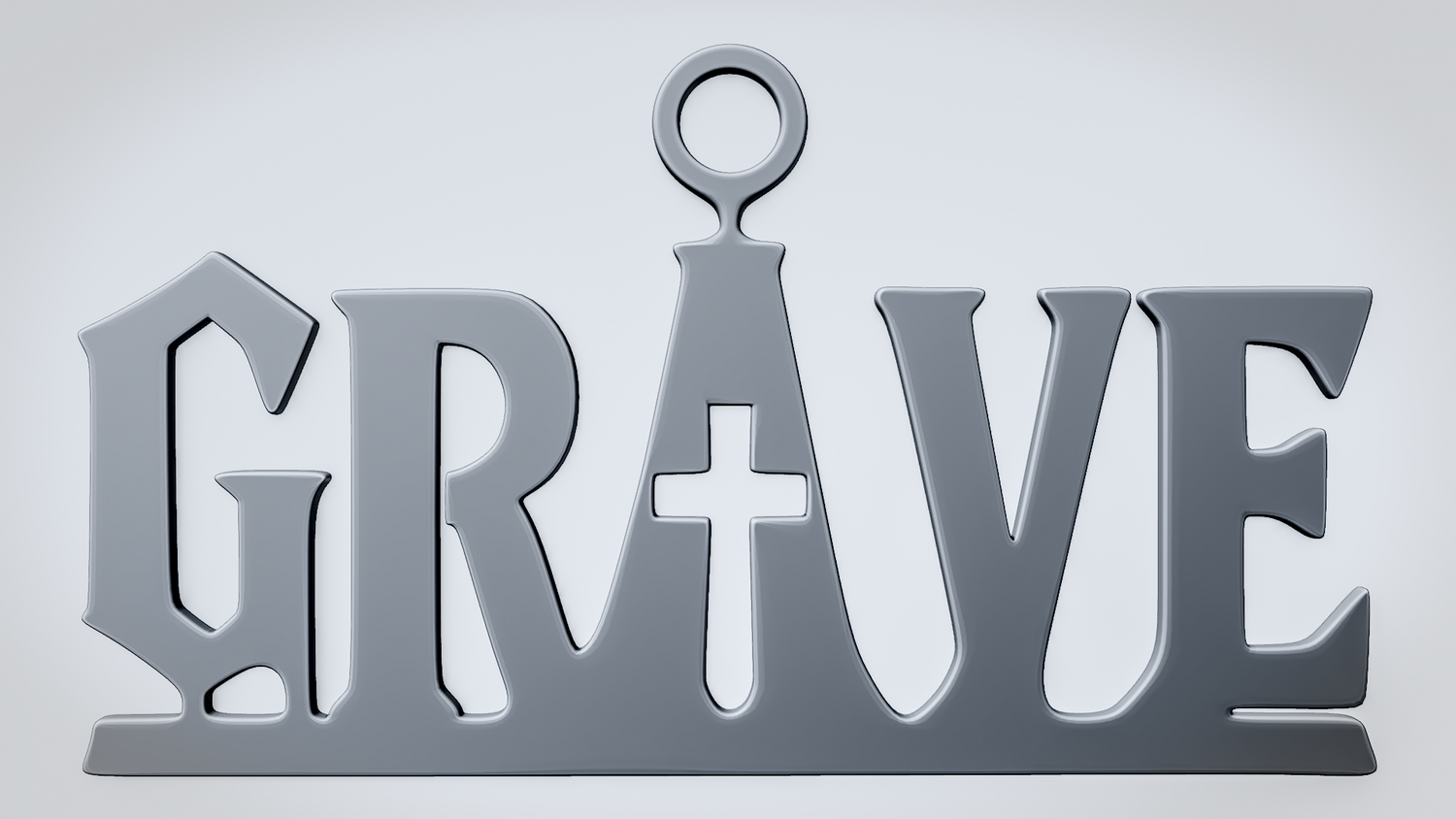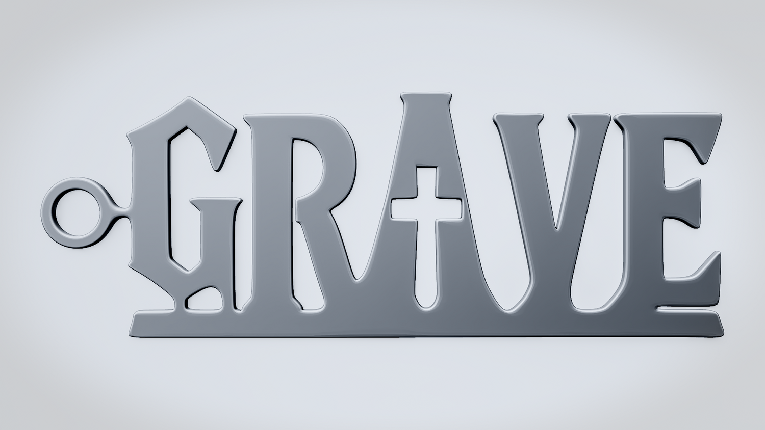 A solid 3D printable design featuring the word GRAVE in a bold gothic-inspired style, with a cross integrated into the lettering to reinforce the dark memorial theme. The overall shape is clean, sturdy, and visually striking, making it work well both as an accessory piece and as a decorative printed model.