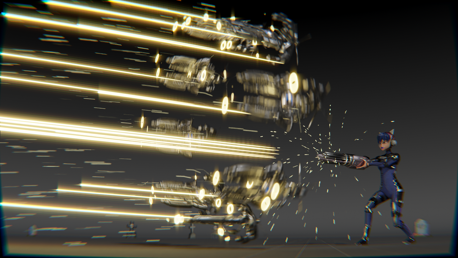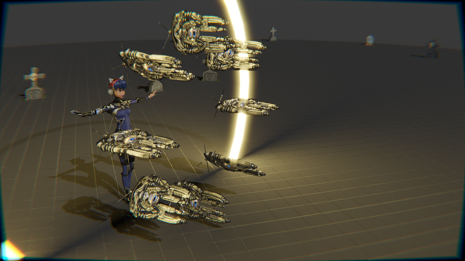 Massive Shooter (280 frames) – Character jumps down, creates magical circles, summons drones that shoot forward, then transforms her arm into a cannon and fires alongside them.
