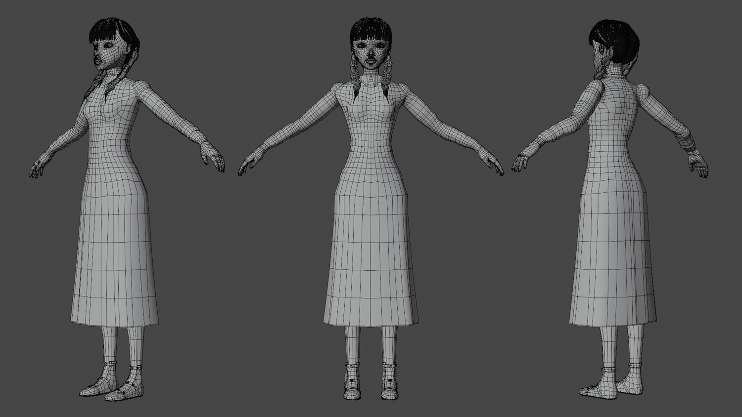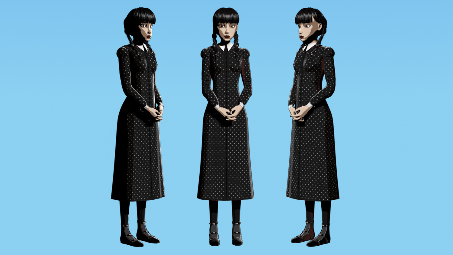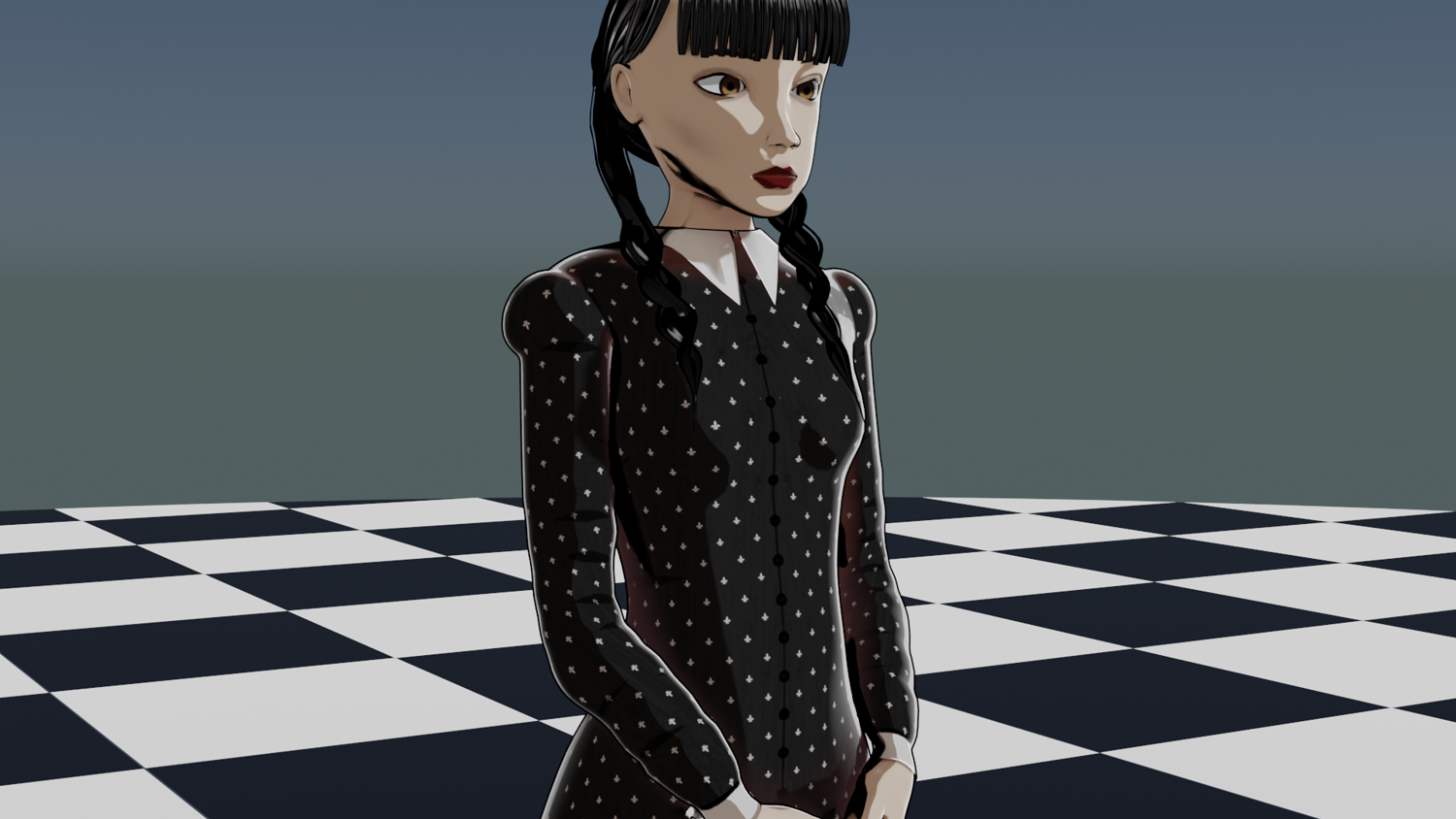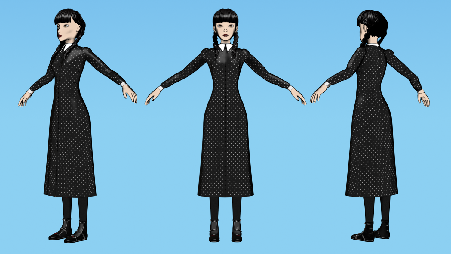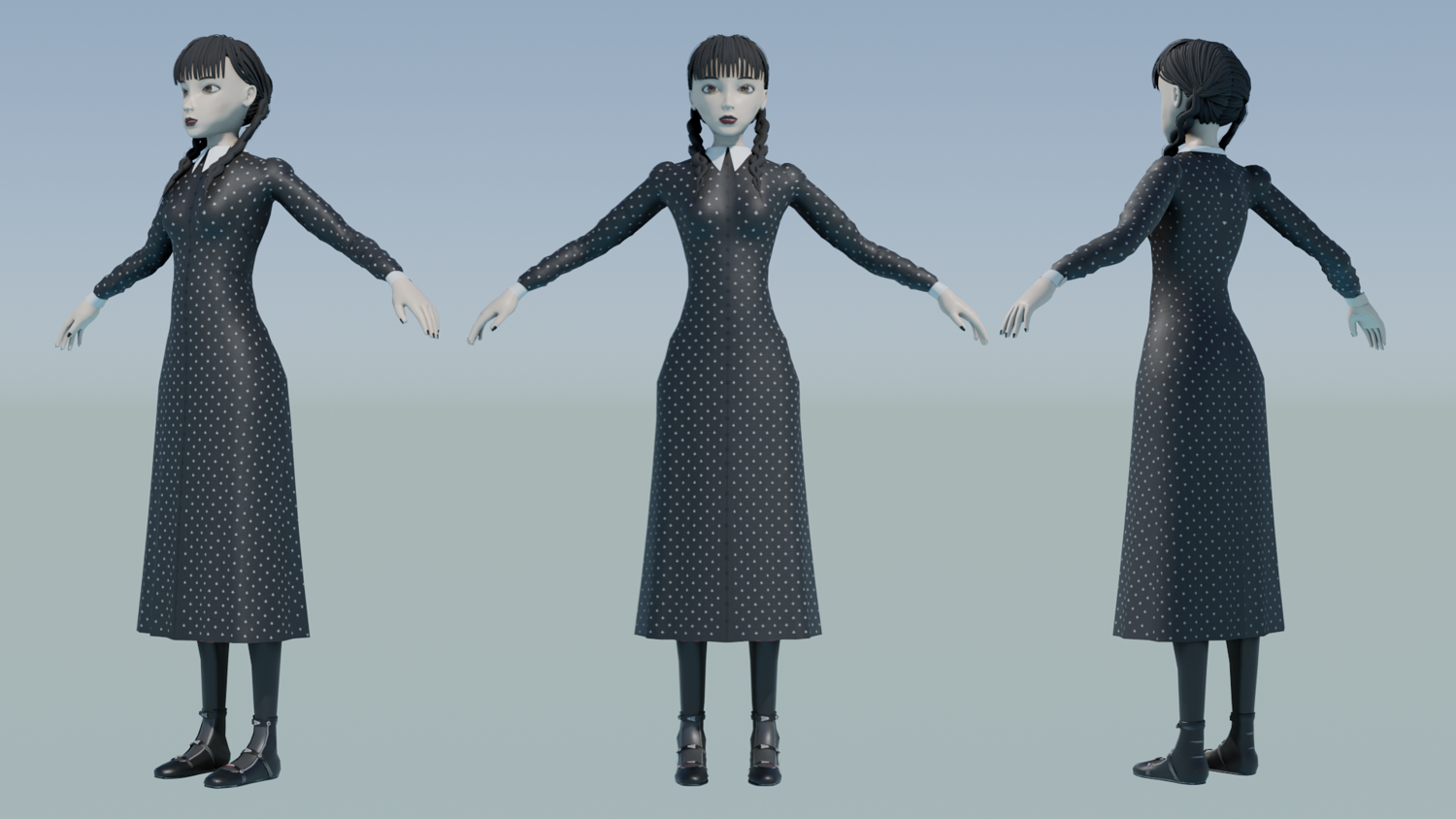 Wednesday Friday Addams is the only daughter of the Addams Family Body, Hair & Face rigged. UV Unwrapped and textured. Comes with textures at 1k, 2k & 4k resolution. Contains PBR & Toon (LBS) Shader variations.