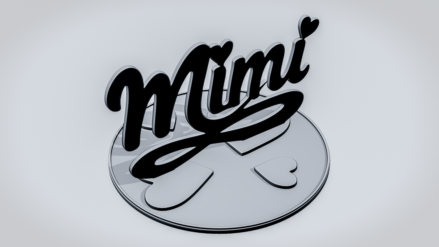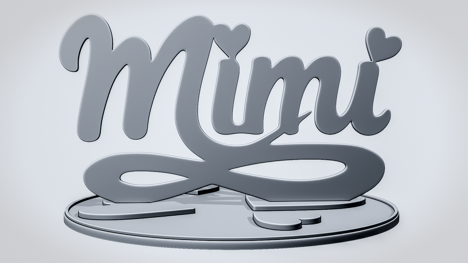Statue Version: The statue version presents MIMI as a freestanding display piece on a round decorative base with heart motifs that reinforce the cute and loving theme. It keeps the flowing script lettering and heart accents clearly visible while giving the model a polished, display-ready presence for desks, shelves, or gift-themed setups.