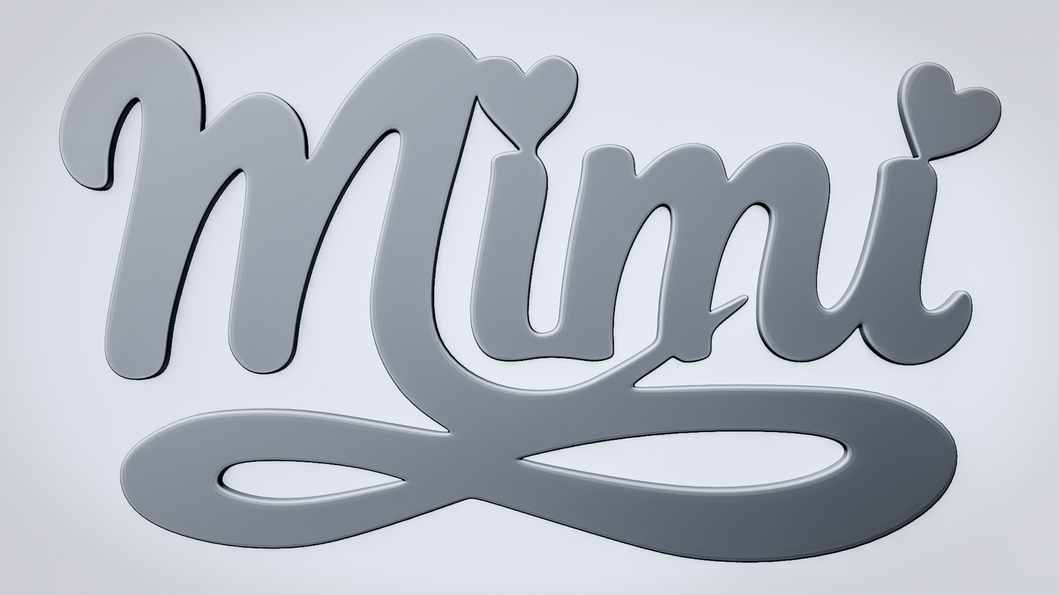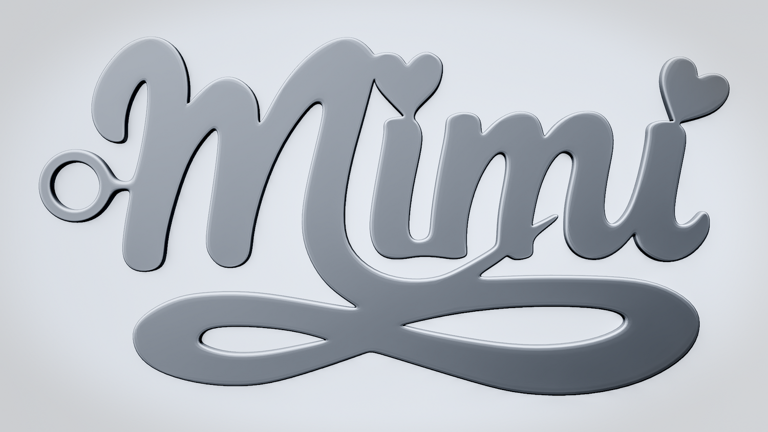 A solid 3D printable design featuring the word MIMI in a smooth flowing script style, finished with small heart accents that give it a sweet and affectionate personality. The overall shape feels soft, playful, and elegant while keeping the word readable and the model sturdy.
