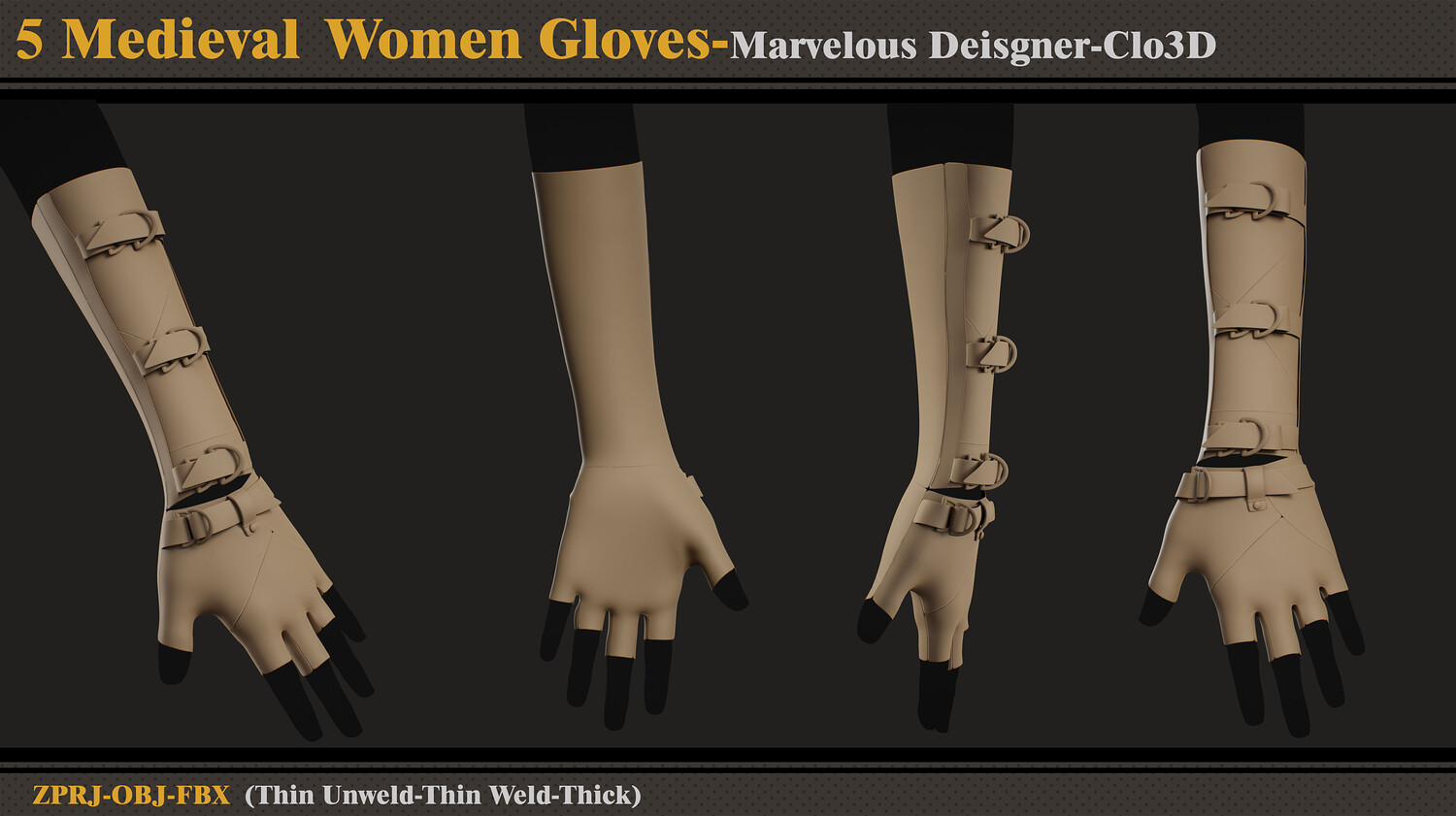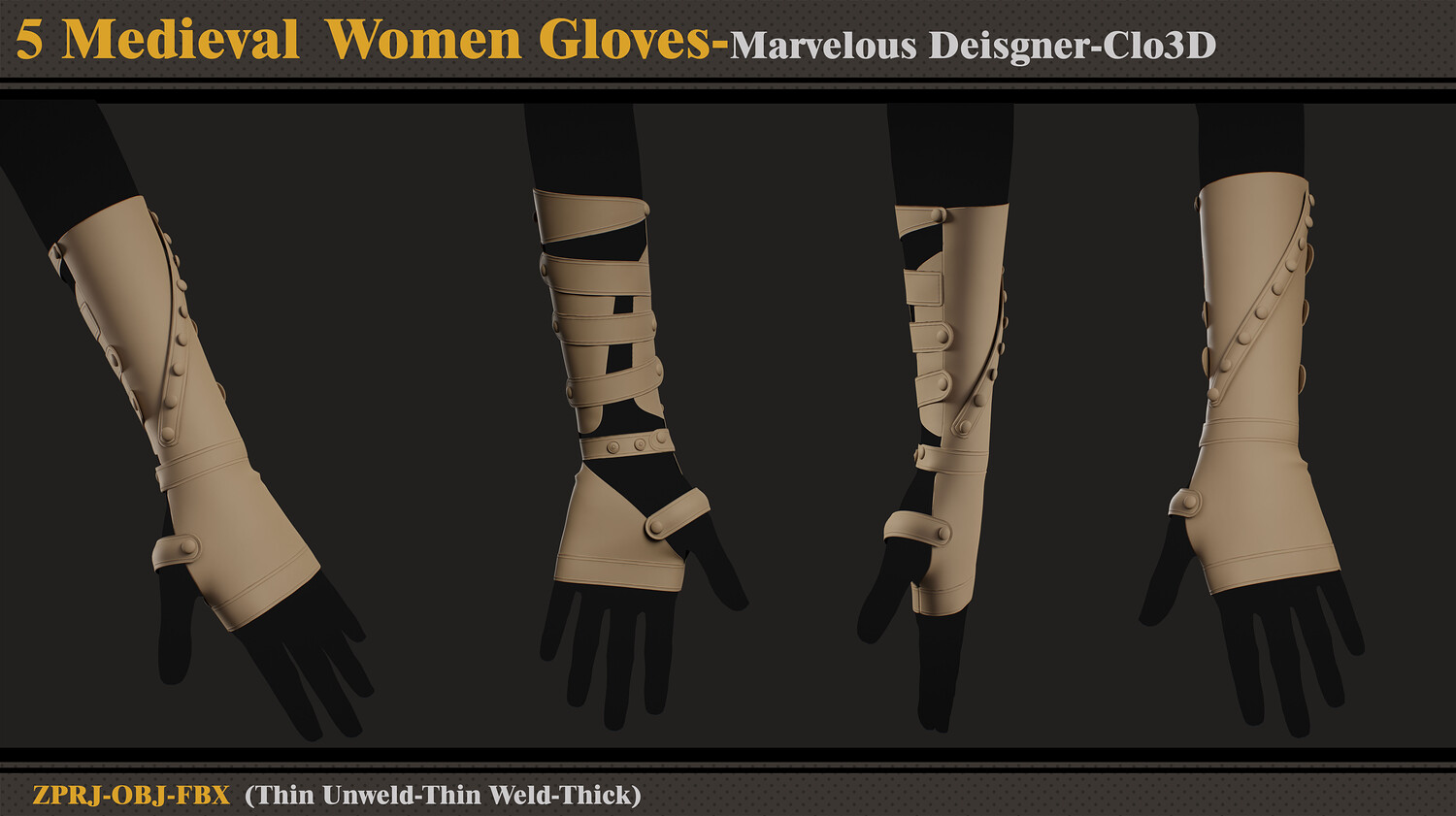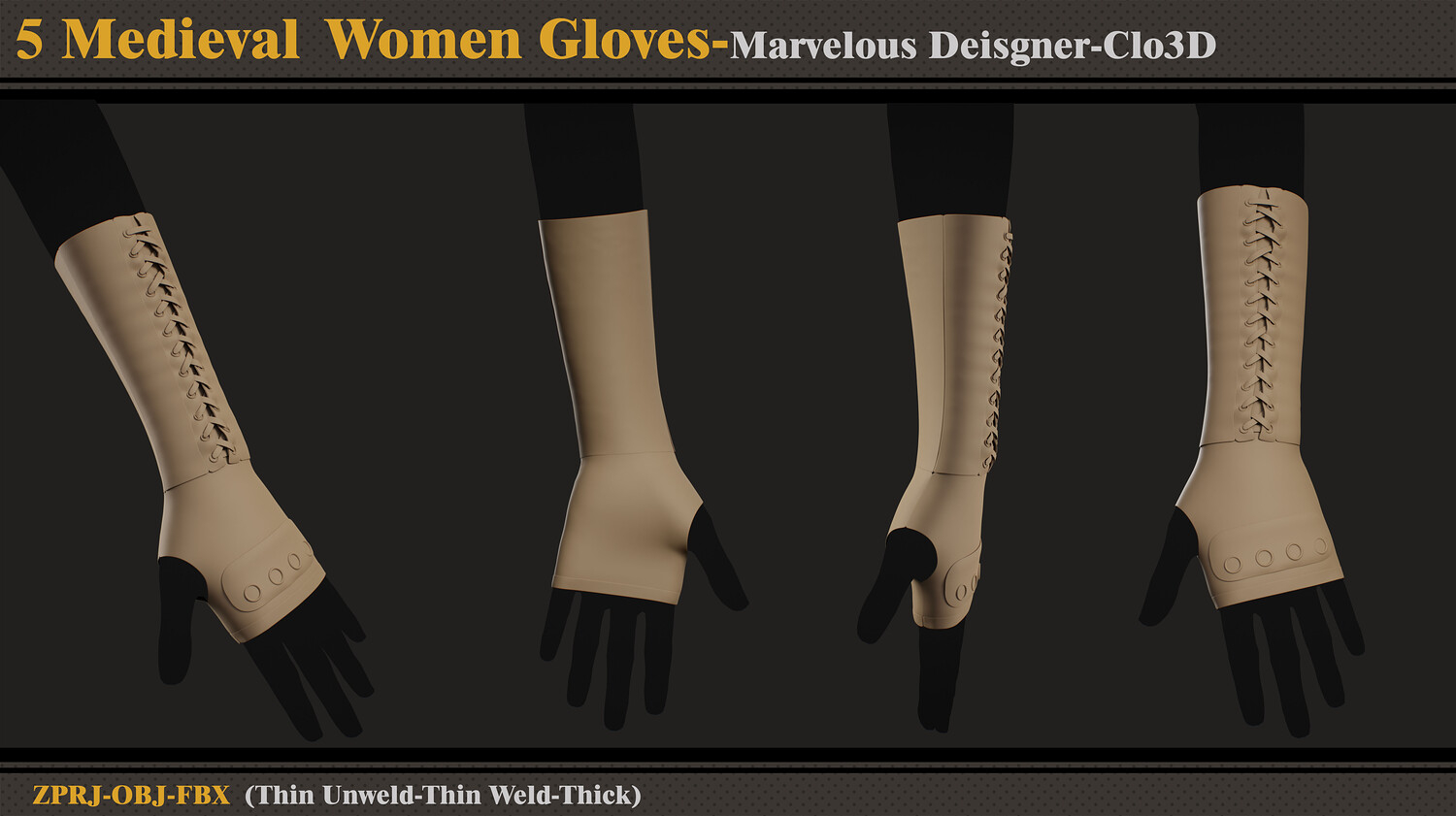 5 Medieval Women Gloves-MD-Clo3D-ZPRJ-FBX- OBJ
