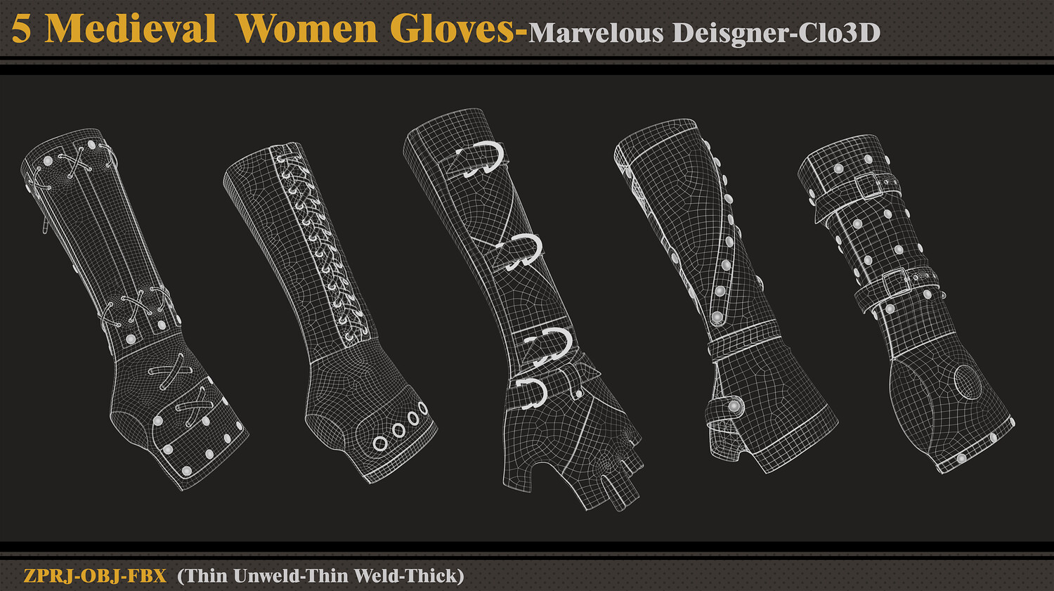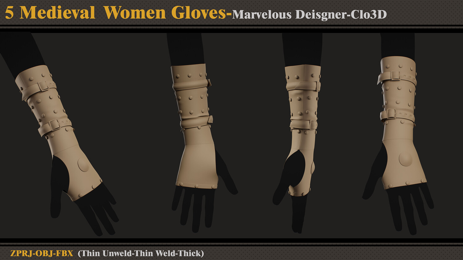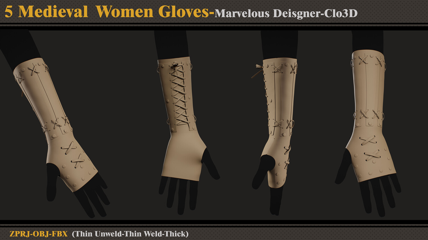 5 Medieval Women Gloves-MD-Clo3D-ZPRJ-FBX- OBJ