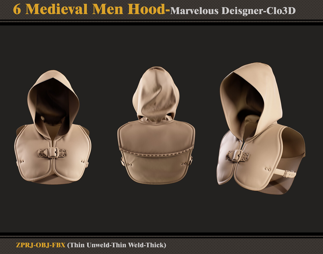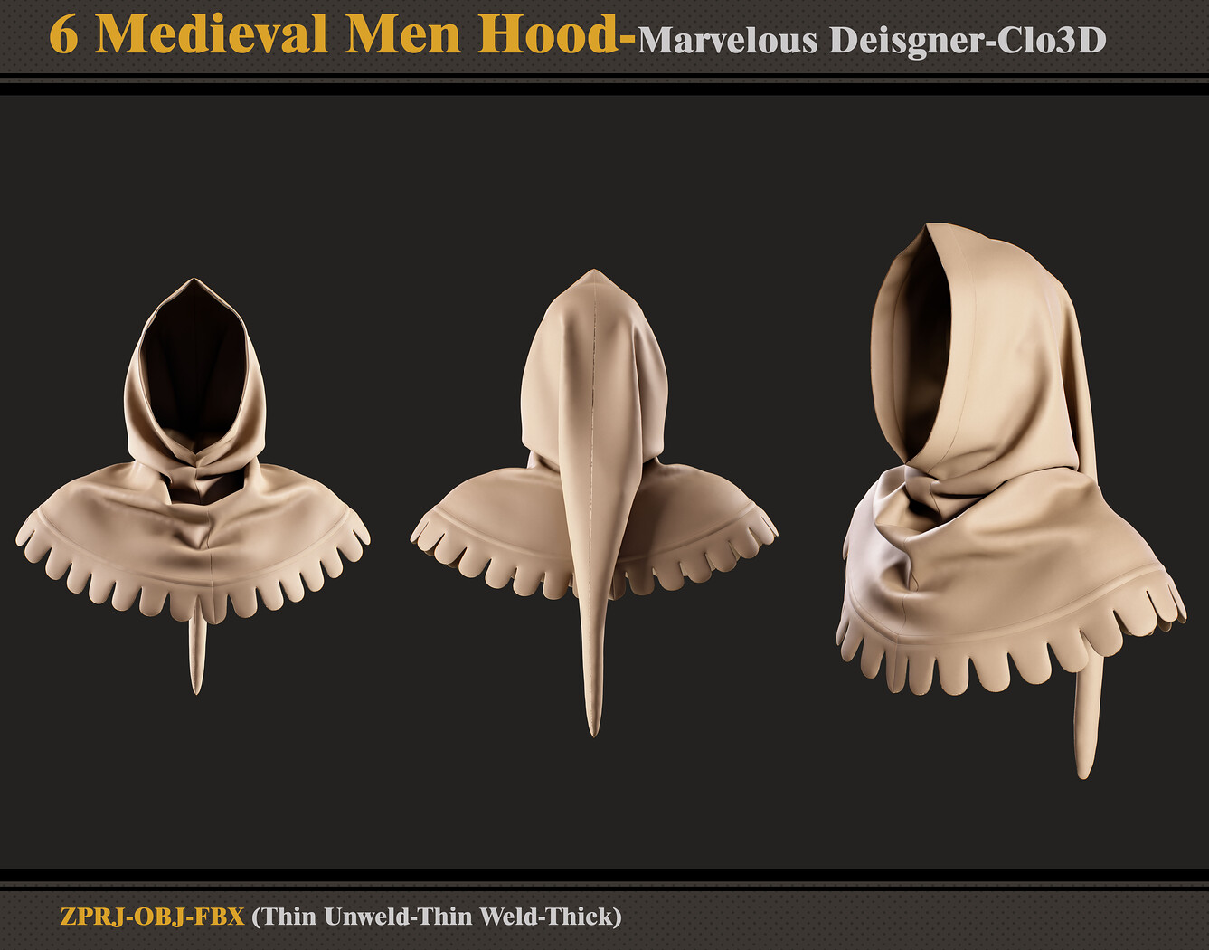 Hello ;) This product contains 6 Medieval Hoods And 6 Files. In each Files, there are: - Marvelous Designer or Clo3D (ZPRJ) -A Pose - FBX and OBJ ( Thick and Thin Unweld and Thin Weld) - Normal Map Attention - No retopology - Quad Mesh and Unwraped-clean uv(in marvelous designer) - Avatar - DazStudio Genesis 8 male