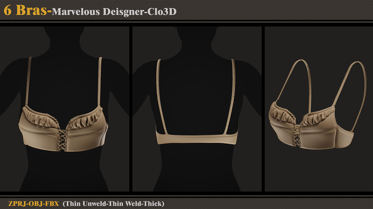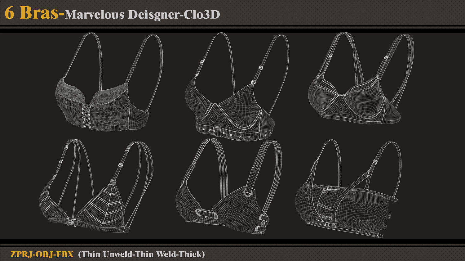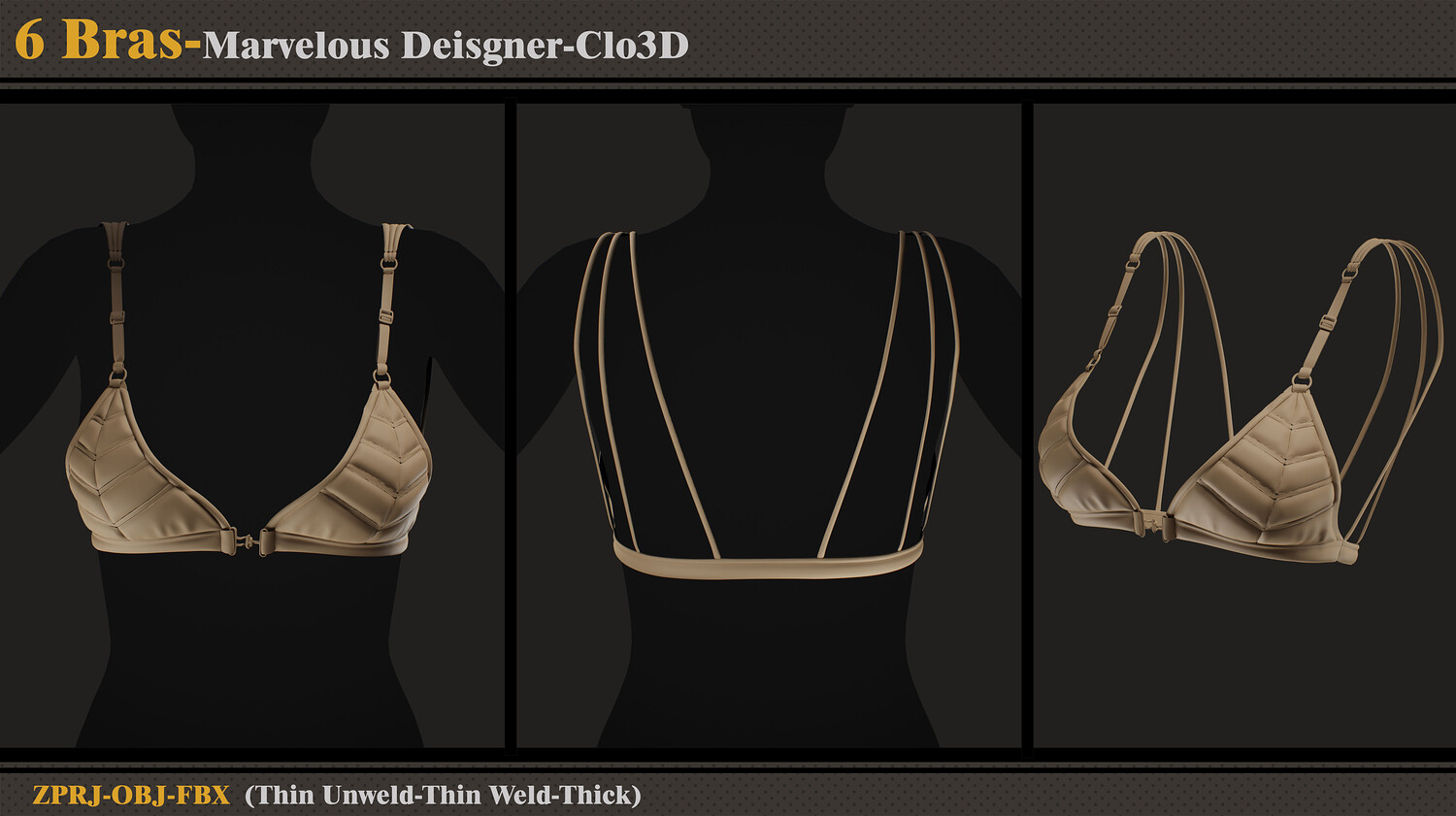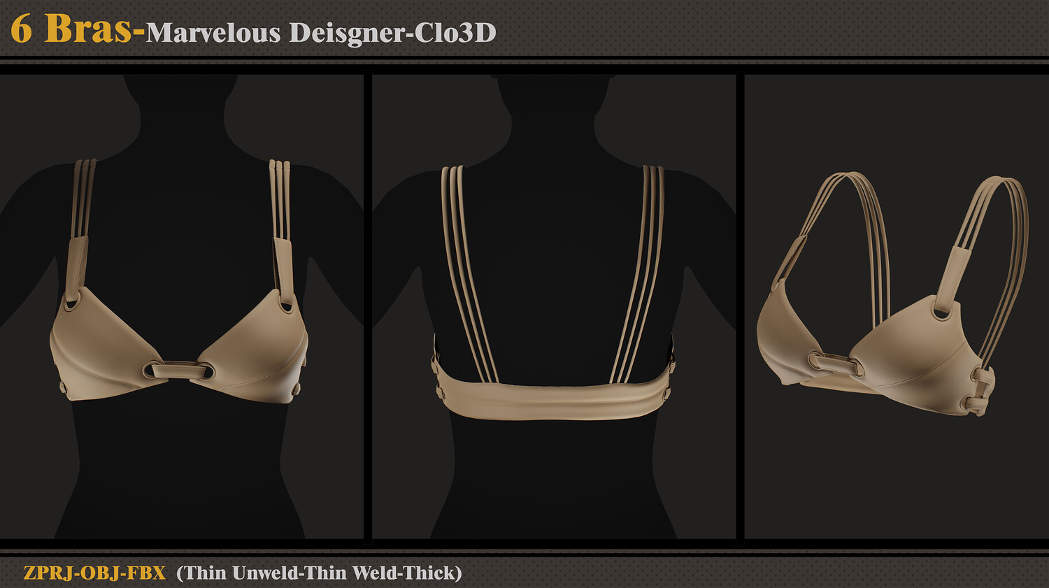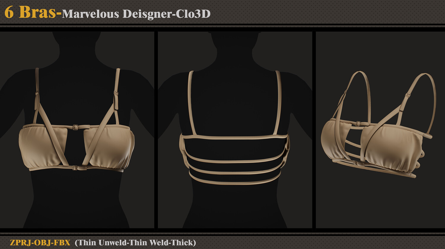 Hello ;) This product contains 6 Bras. Including 6 Files. In each file, there are: - Marvelous Designer or Clo3D (ZPRJ) -A Pose - FBX and OBJ ( Thick and Thin Unweld and Thin Weld) - Normal Map Attention - no retopology - Quad Mesh and Unwrapped-clean UV (in CLO3D) - Avatar - DazStudio Genesis 8 female Hope you download and like. If you have any questions or problems, just tell me here. Please rate and review this product, and I appreciate that :)