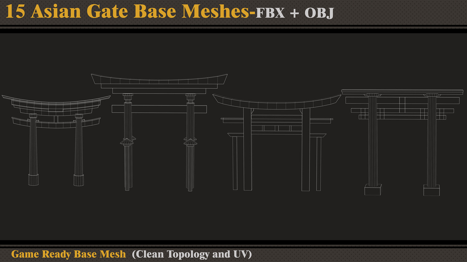 Hello ;) This product contains 15 Asian gate base meshes. In each file, there are: - FBX and OBJ - Previews - Blender file Attention - Quad Mesh and Unwrapped-clean UV (Channel 1) - Optimized topology Hope you download and like. If you have any questions or problems, just tell me here. Please rate and review this product, and I appreciate that :)