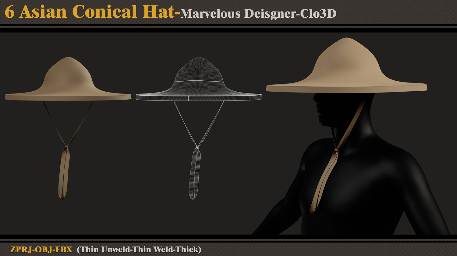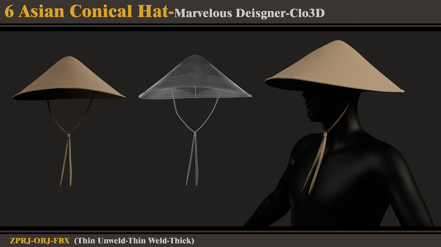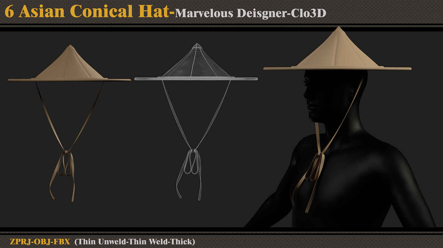 Hello ;) This product contains 6 Asian conical hats. Including 6 Files. In each file, there are: - Marvelous Designer or Clo3D (ZPRJ) -A Pose - FBX and OBJ ( Thick and Thin Unweld and Thin Weld) - Normal Map Attention - no retopology - Quad Mesh and Unwrapped-clean UV (in CLO3D) - Avatar - DazStudio Genesis 8 male Hope you download and like. If you have any questions or problems, just tell me here. Please rate and review this product, and I appreciate that :)