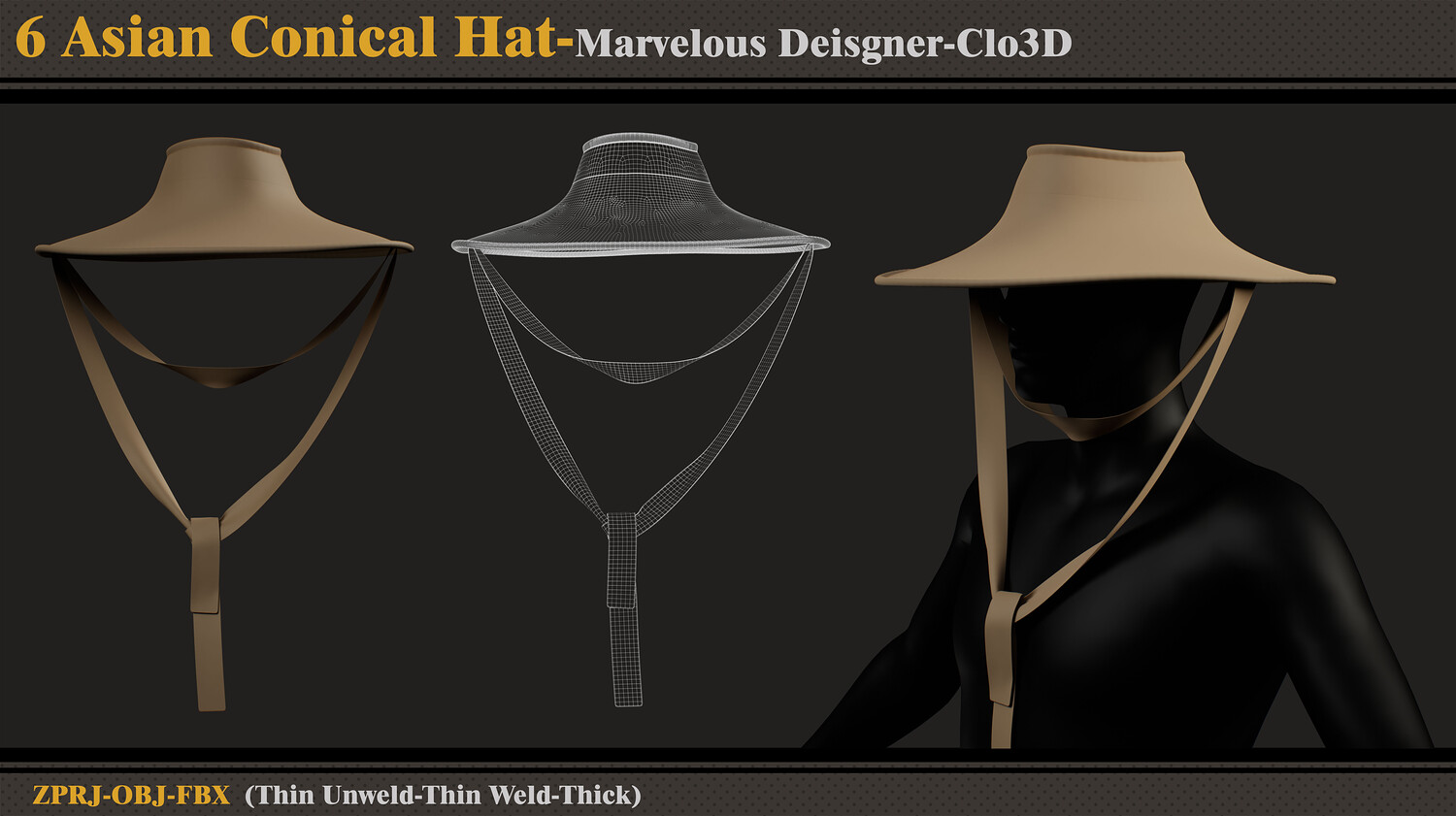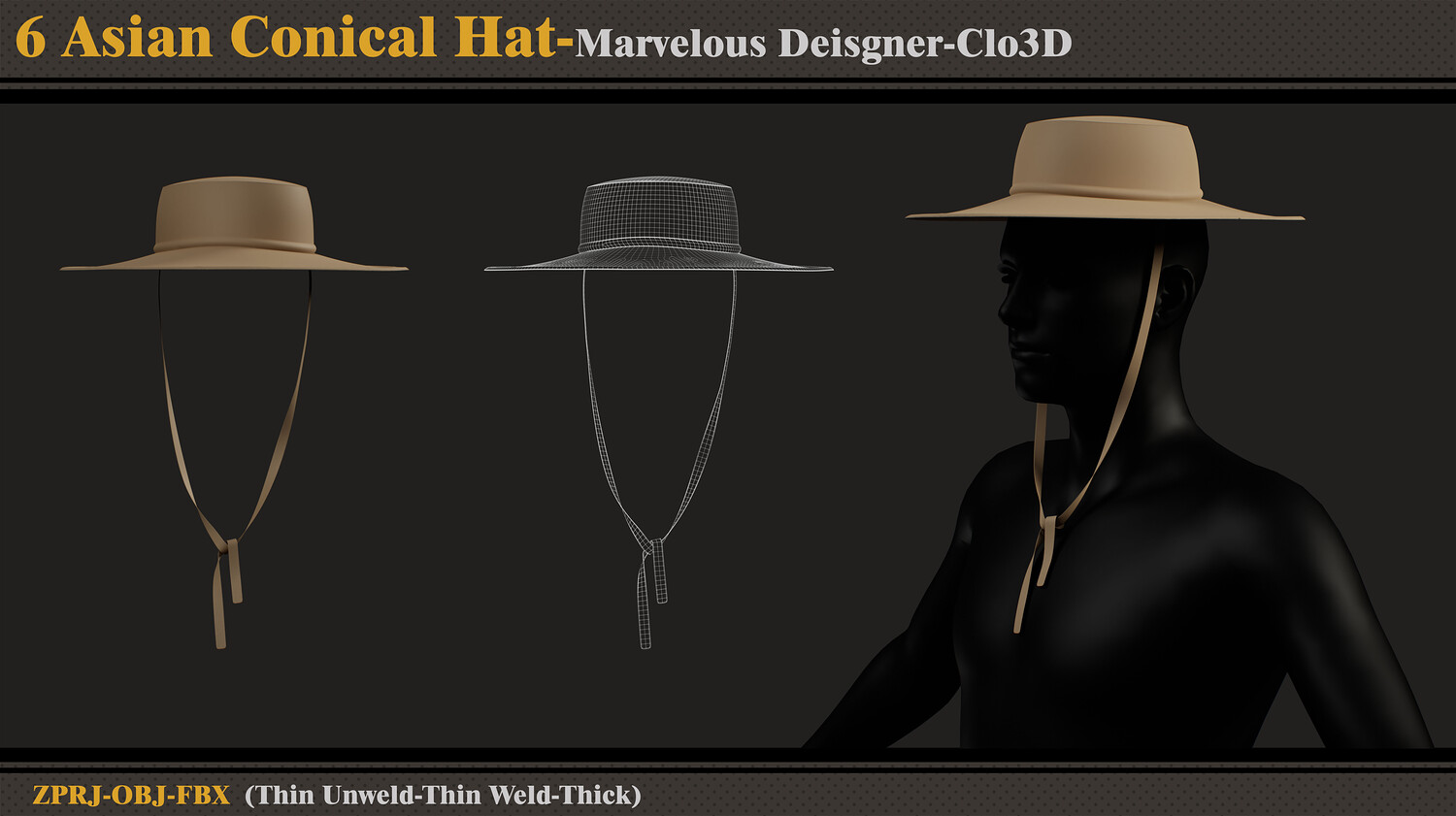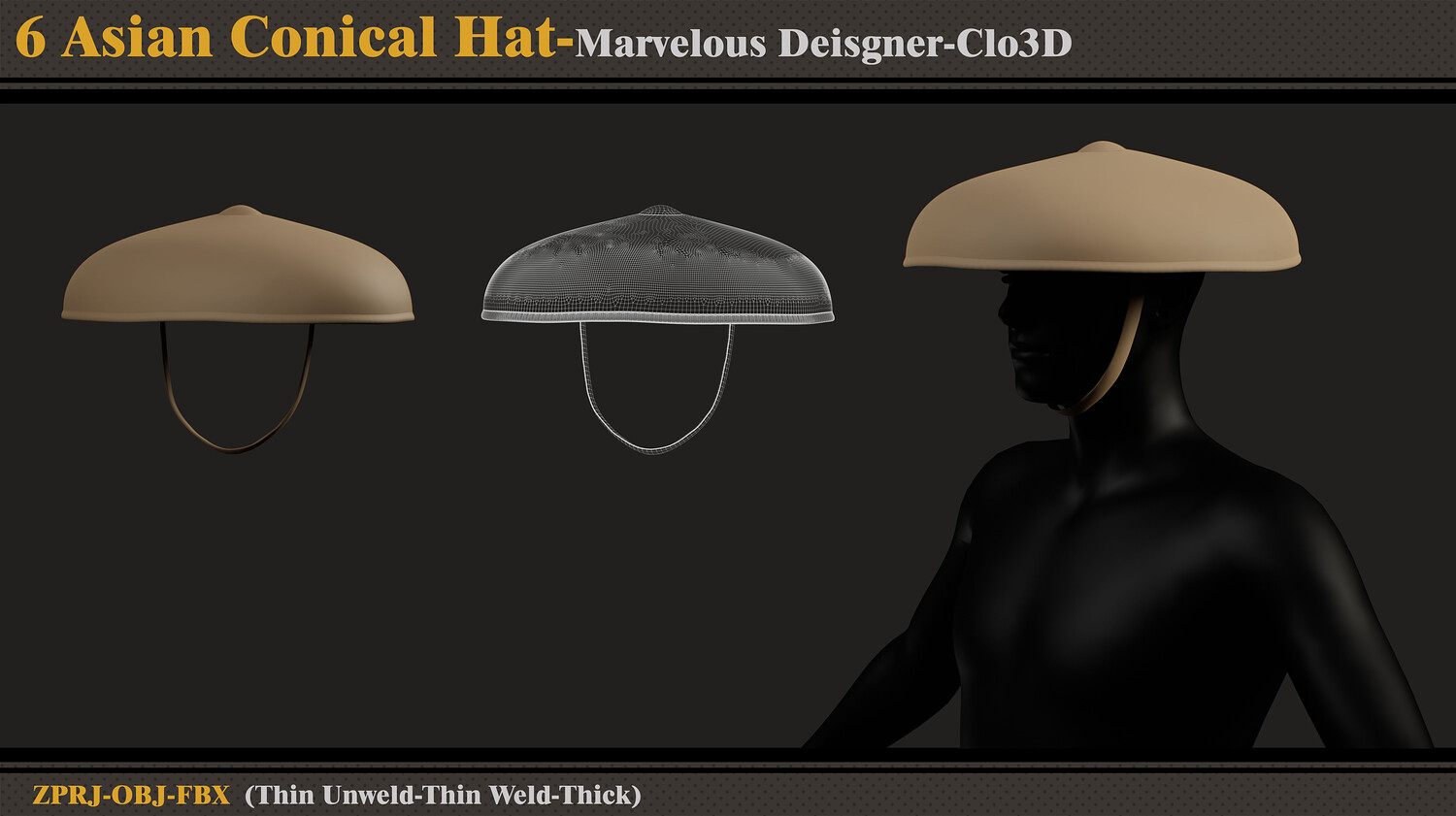 Hello ;) This product contains 6 Asian conical hats. Including 6 Files. In each file, there are: - Marvelous Designer or Clo3D (ZPRJ) -A Pose - FBX and OBJ ( Thick and Thin Unweld and Thin Weld) - Normal Map Attention - no retopology - Quad Mesh and Unwrapped-clean UV (in CLO3D) - Avatar - DazStudio Genesis 8 male Hope you download and like. If you have any questions or problems, just tell me here. Please rate and review this product, and I appreciate that :)