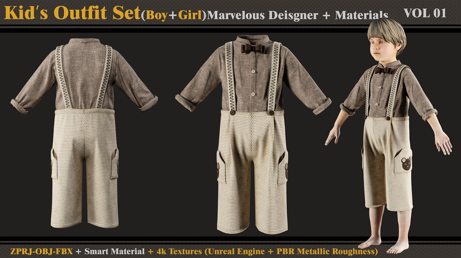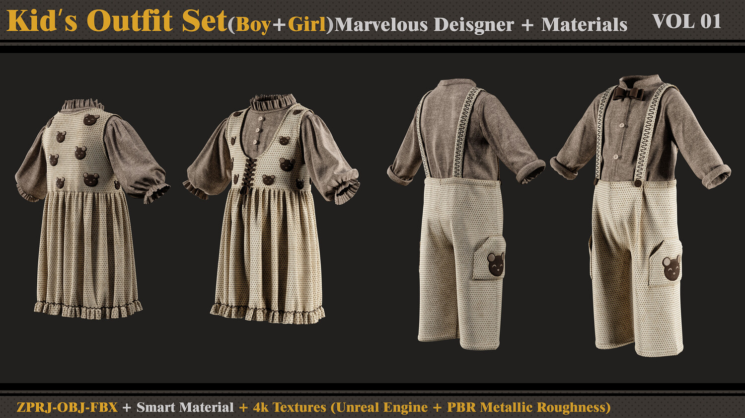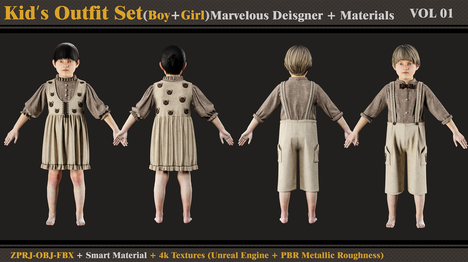 Kids Outfit Set-BOY & GIRL- MD-Clo3d-Smart Material- Textures-OBJ-FBX