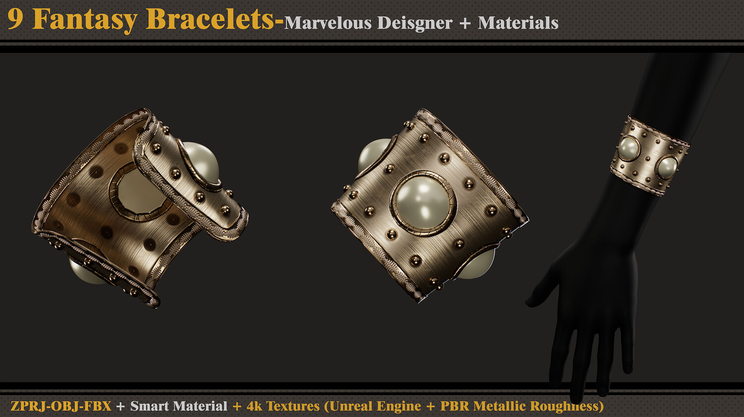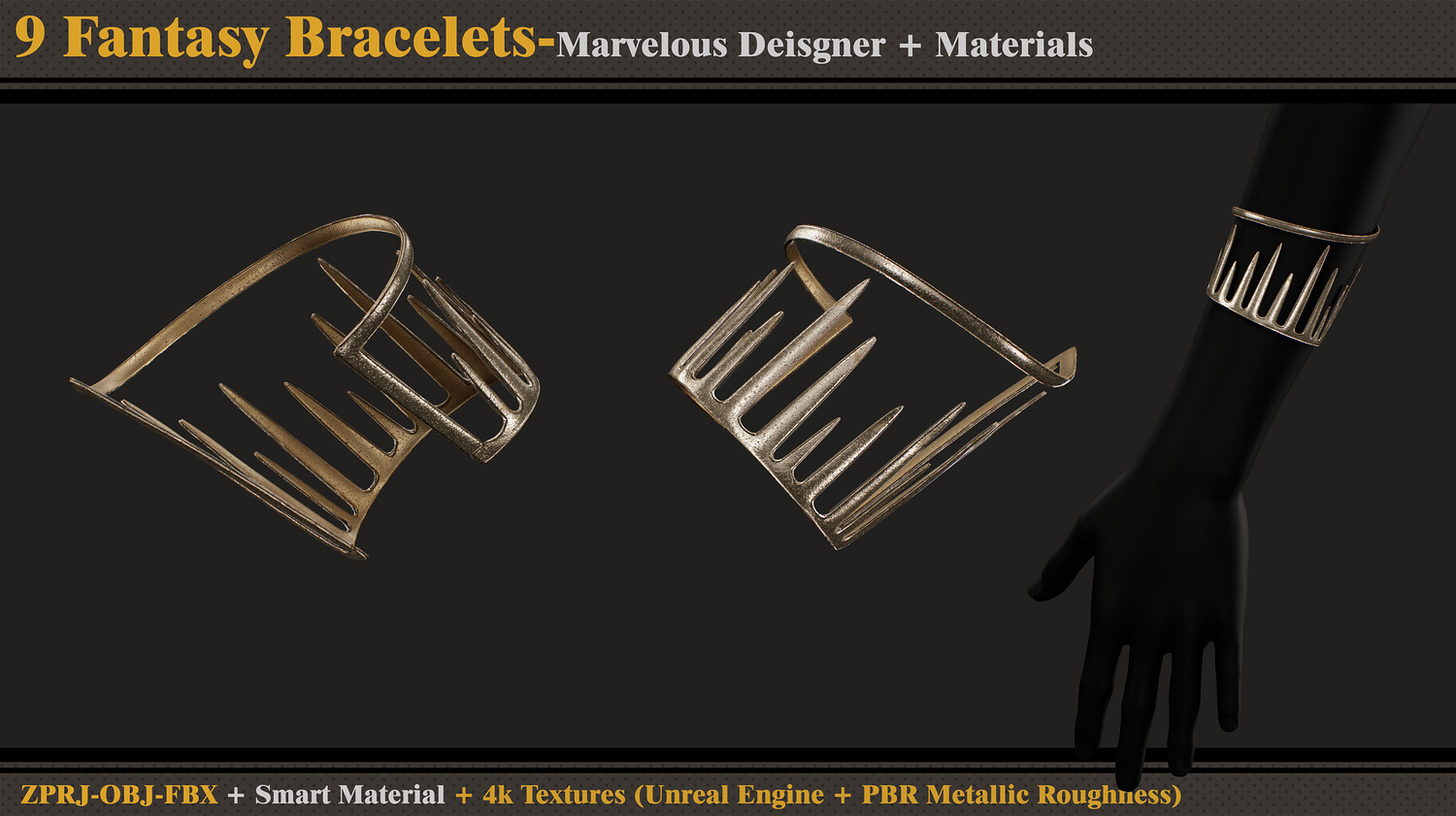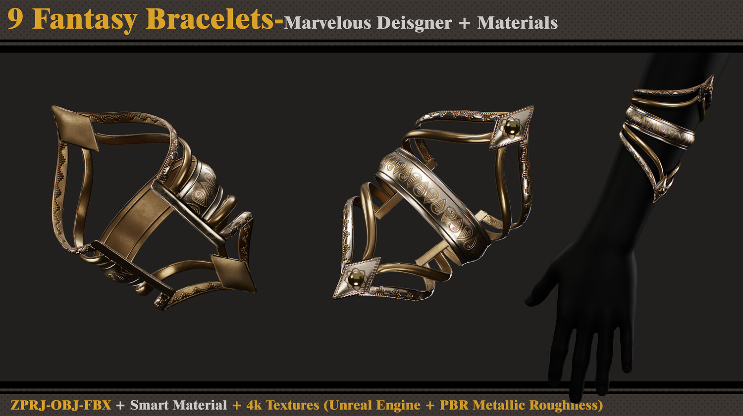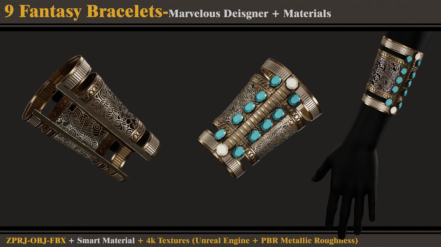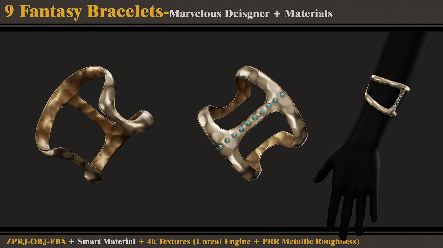 Hello ;) This product contains 9 Fantasy Bracelets and 9 Files. In each File, there are: - Marvelous Designer or Clo3D (ZPRJ) - FBX and OBJ ( Thick and Thin Unweld and Thin Weld) - Normal Map -Smart Materials - 4k and PNG Texture (Unreal Engine + PBR Metallic Roughness) Attention - No retopology - Quad Mesh and Unwrapped in clo3d - Avatar - DazStudio Genesis 8 Female