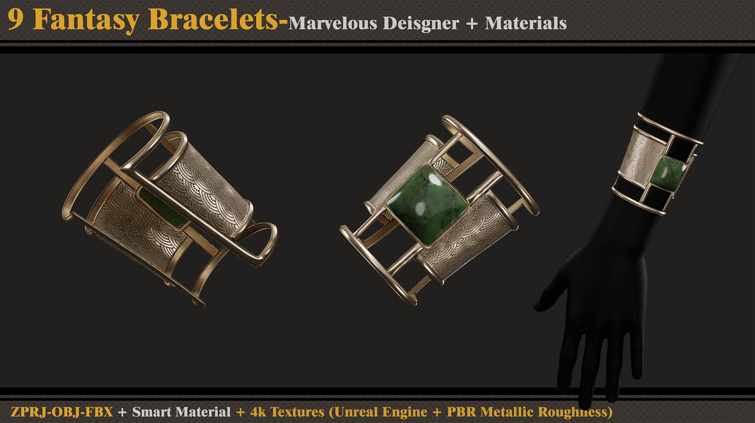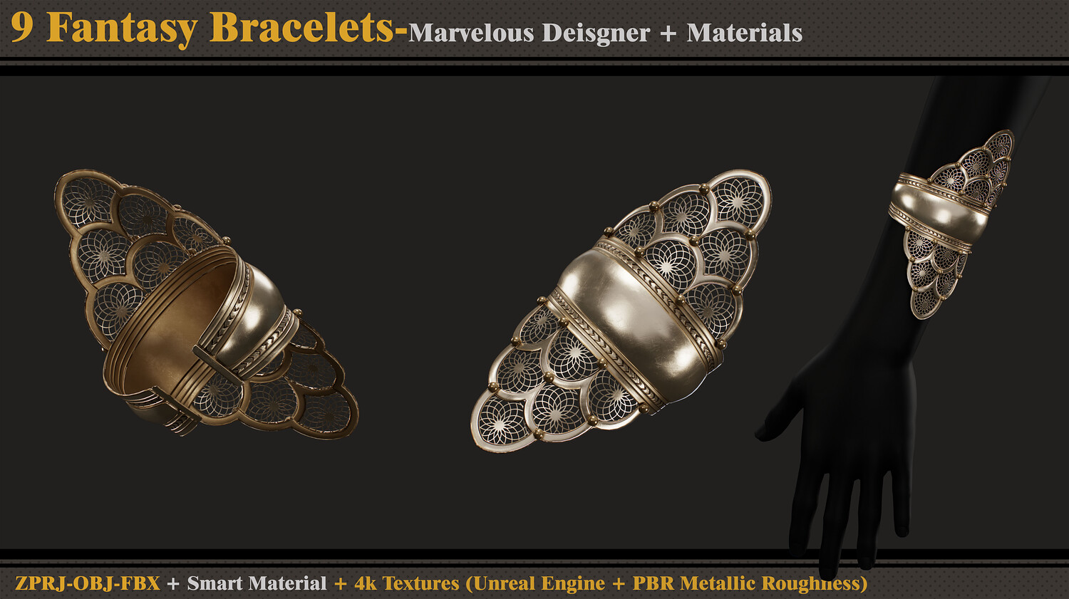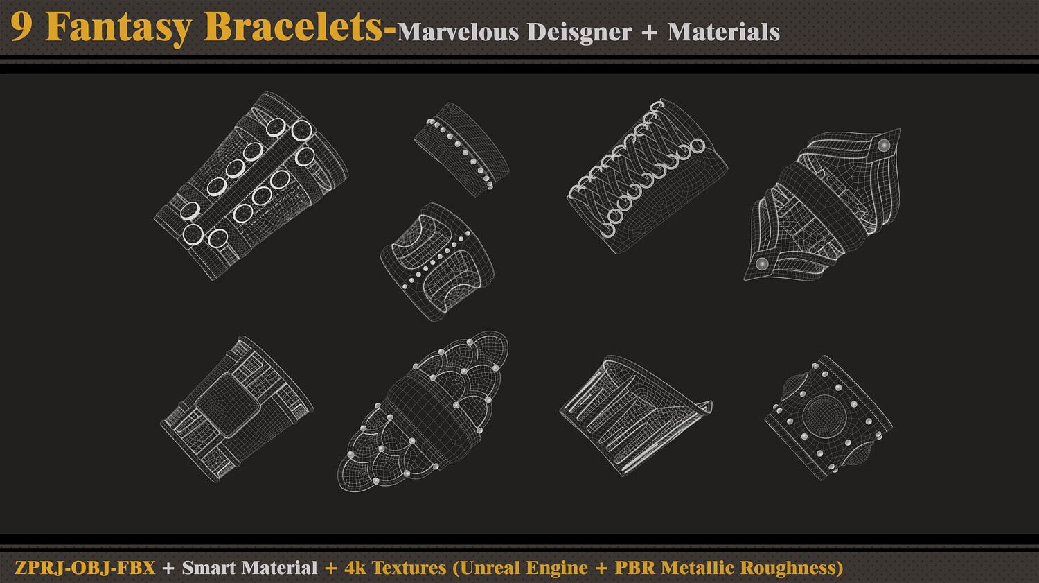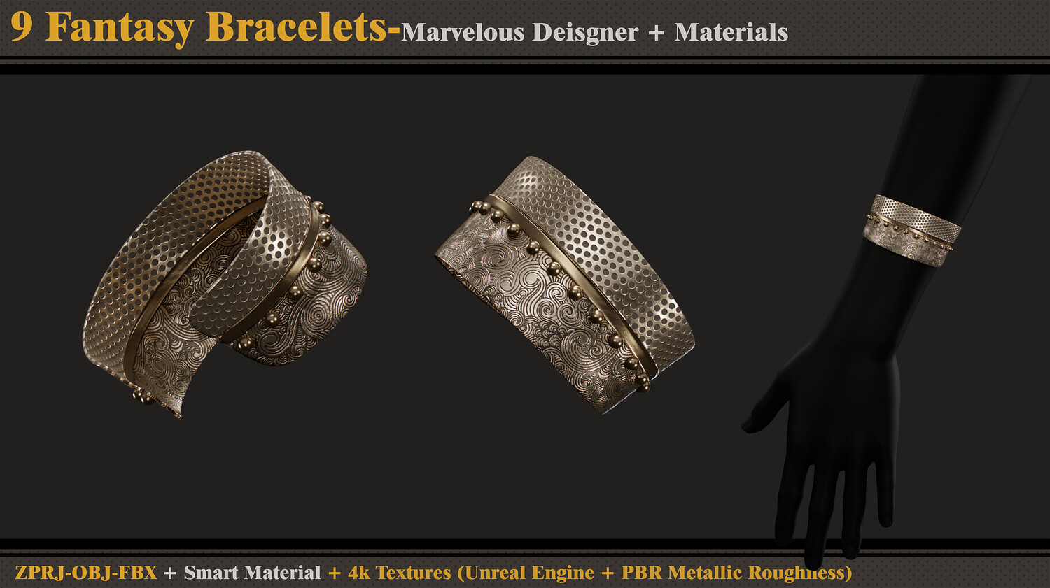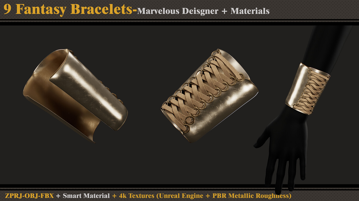 Hello ;) This product contains 9 Fantasy Bracelets and 9 Files. In each File, there are: - Marvelous Designer or Clo3D (ZPRJ) - FBX and OBJ ( Thick and Thin Unweld and Thin Weld) - Normal Map -Smart Materials - 4k and PNG Texture (Unreal Engine + PBR Metallic Roughness) Attention - No retopology - Quad Mesh and Unwrapped in clo3d - Avatar - DazStudio Genesis 8 Female