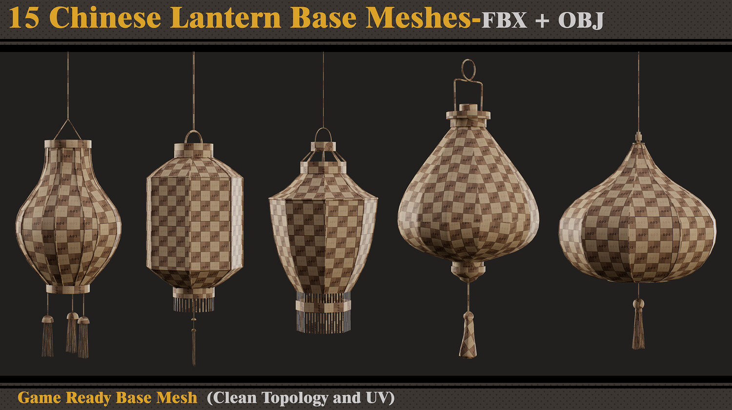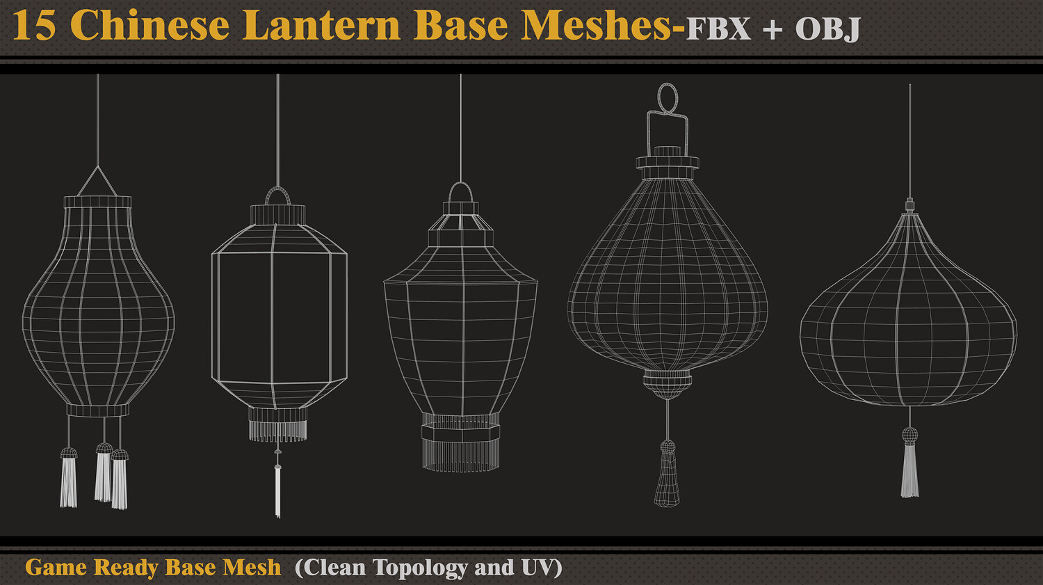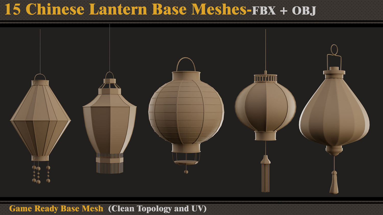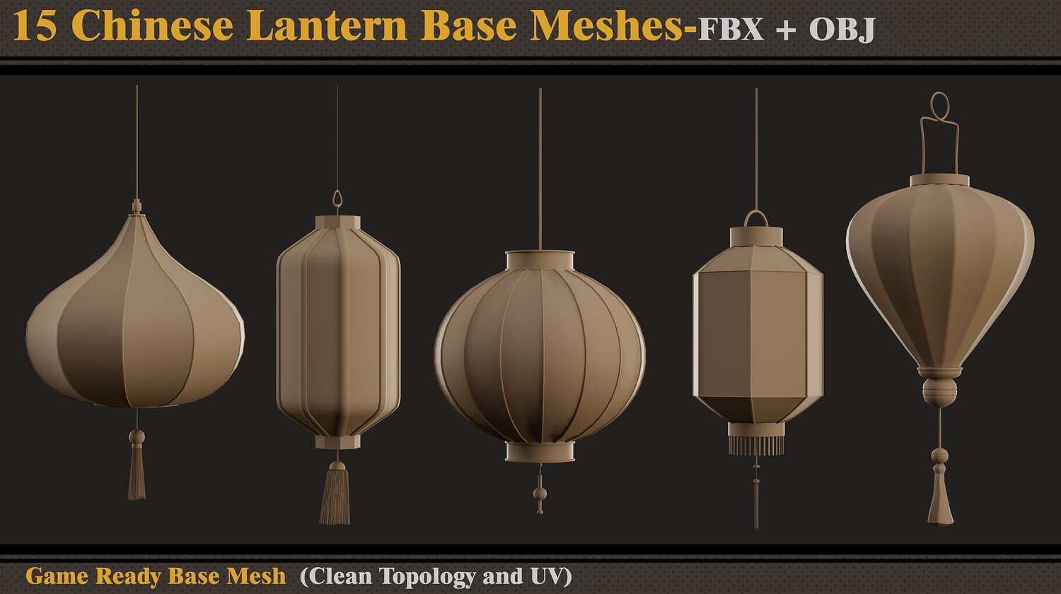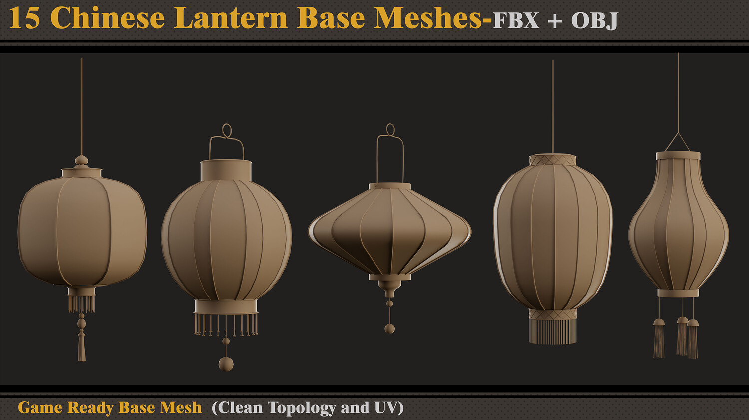 Hello ;) This product contains 15 Chinese lantern base meshes. In each file, there are: - FBX and OBJ - Previews Attention - Quad Mesh and Unwrapped-clean UV (Channel 1) - Optimized topology Hope you download and like. If you have any questions or problems, just tell me here. Please rate and review this product, and I appreciate that :)