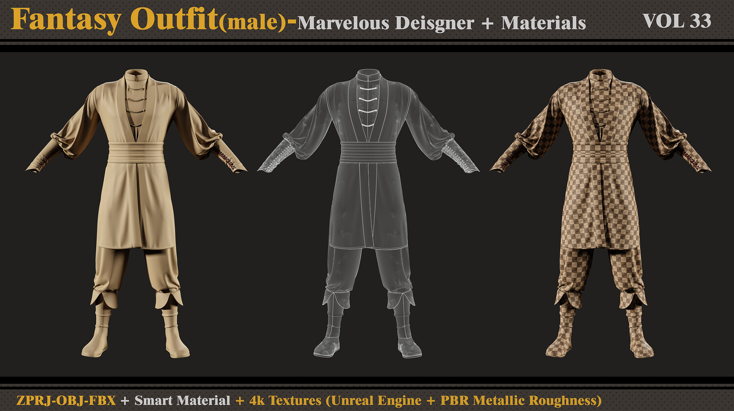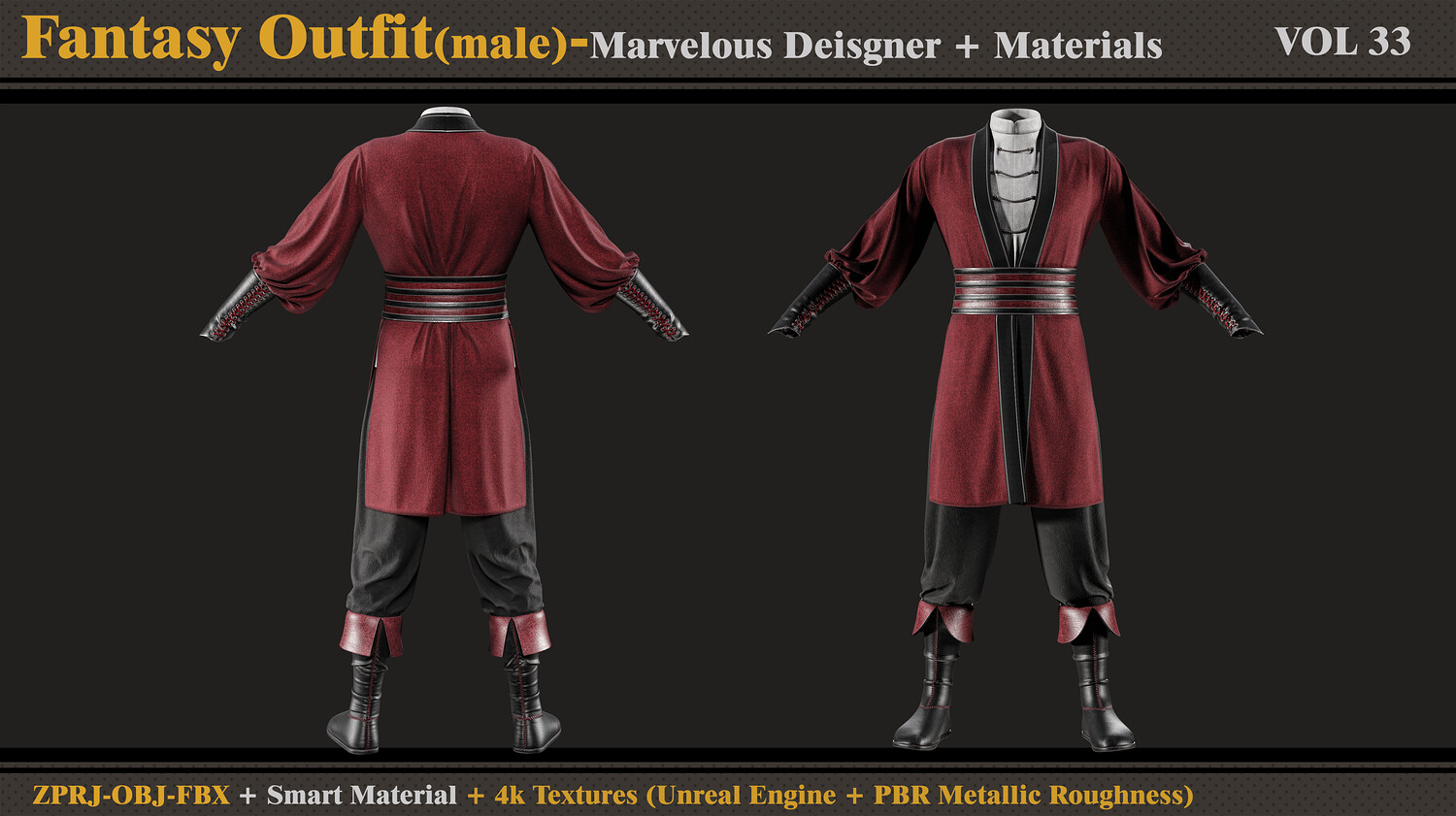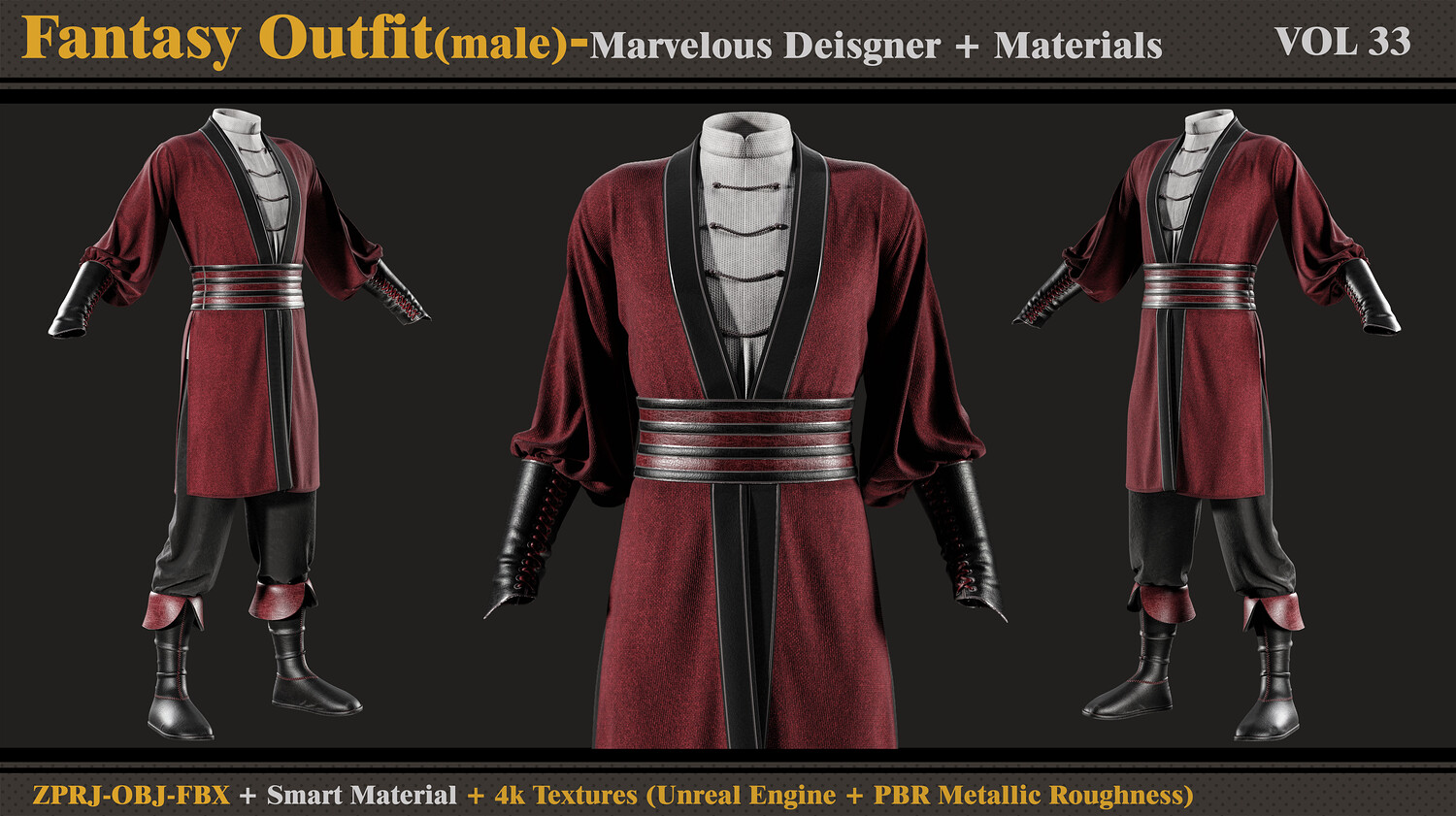 Hello ;) This product contains: - Marvelous Designer or Clo3D (ZPRJ) -A Pose - FBX and OBJ ( Thick and Thin Unweld and Thin Weld) - Normal Maps - Smart Materials - 4k and PNG Texture (Unreal Engine + PBR Metallic Roughness) Attention - No retopology - Quad Mesh and Unwraped in clo3d - Avatar - DazStudio Genesis 8 male I hope you download and like it. If you have any questions or problems tell me here. Please rate and review this product and I appreciate that :)