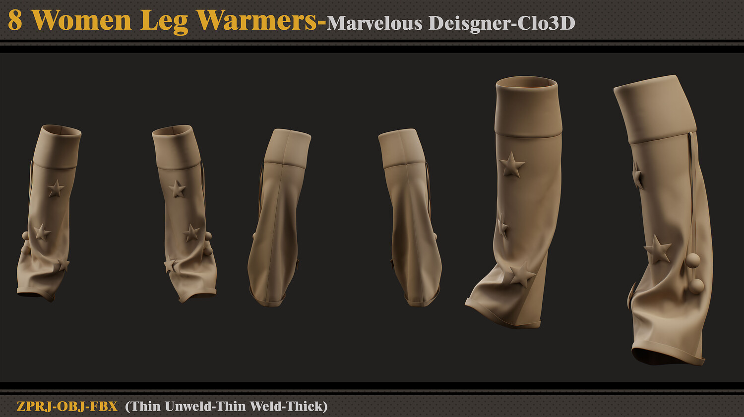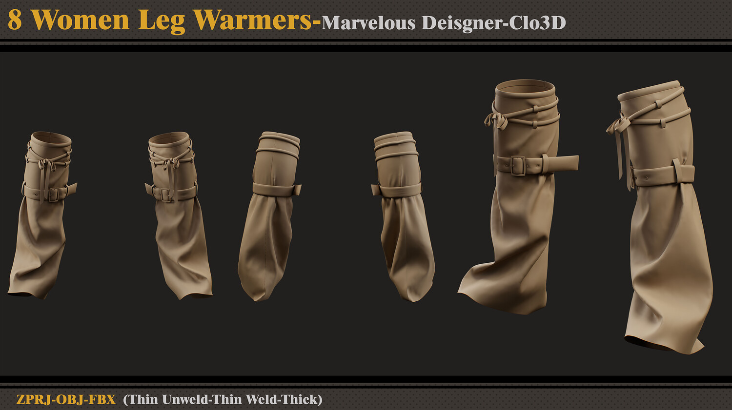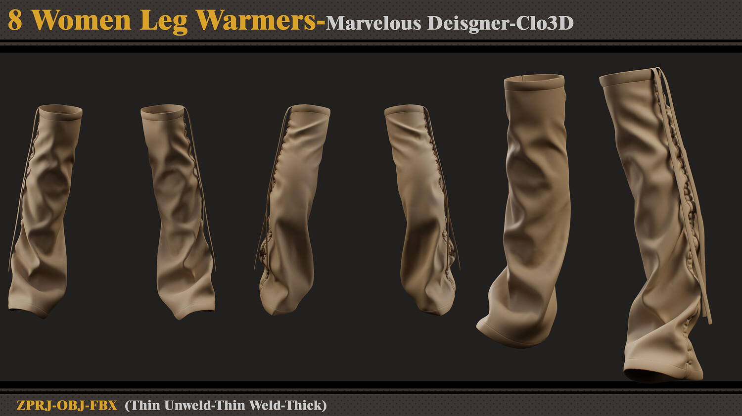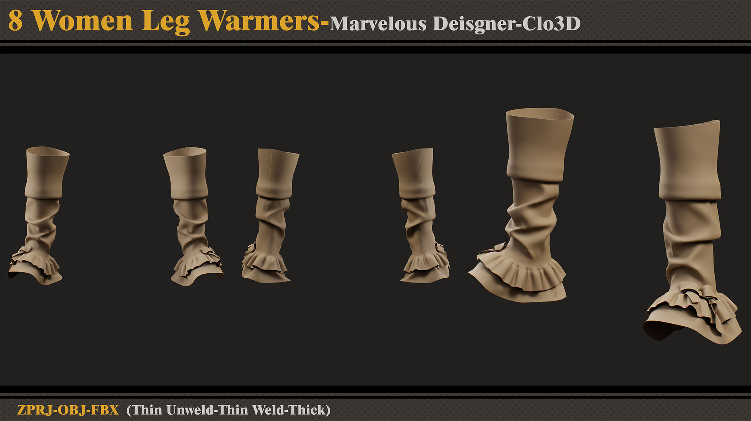 Hello ;) This product contains 8 women's leg warmers and 8 Files. In each File, there are: - Marvelous Designer or Clo3D (ZPRJ) -A Pose - FBX and OBJ ( Thick and Thin Unweld and Thin Weld) - Normal Map Attention - No retopology - Quad Mesh and Unwrapped clean UV - Avatar - DazStudio Genesis 8 female Hope you download and like. If you have any questions or problems, just tell me here. Please rate and review this product, and I appreciate that :)