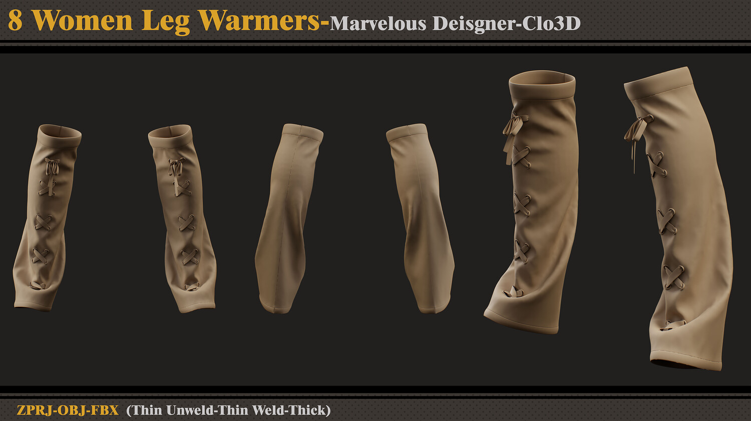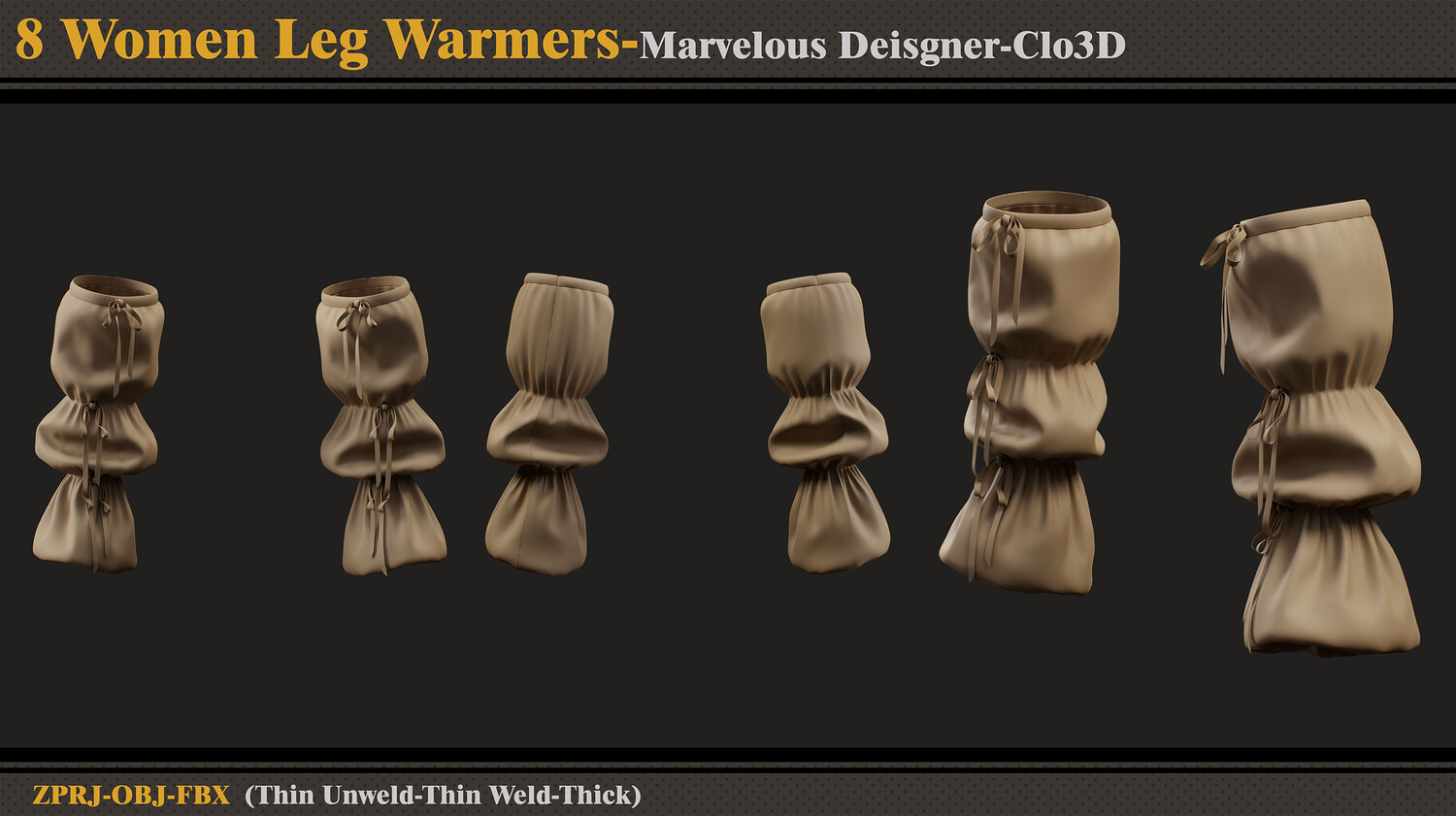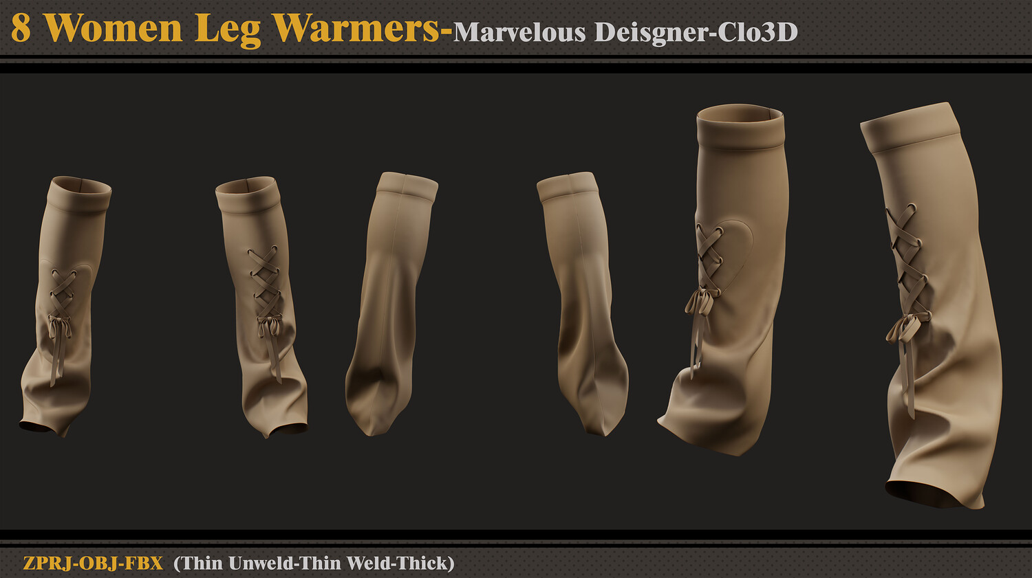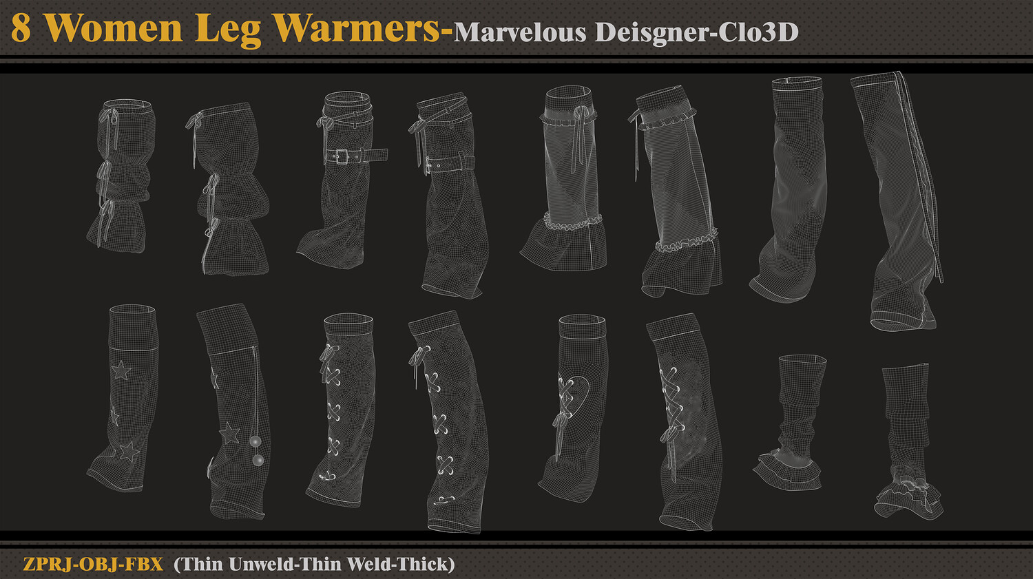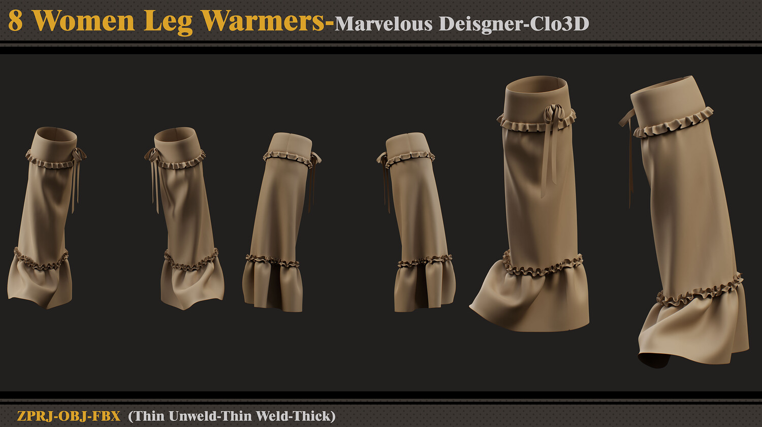 Hello ;) This product contains 8 women's leg warmers and 8 Files. In each File, there are: - Marvelous Designer or Clo3D (ZPRJ) -A Pose - FBX and OBJ ( Thick and Thin Unweld and Thin Weld) - Normal Map Attention - No retopology - Quad Mesh and Unwrapped clean UV - Avatar - DazStudio Genesis 8 female Hope you download and like. If you have any questions or problems, just tell me here. Please rate and review this product, and I appreciate that :)